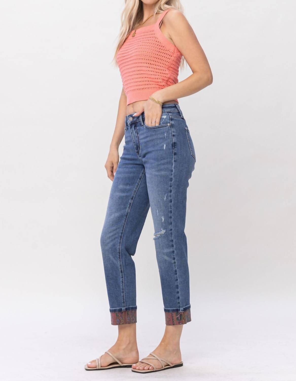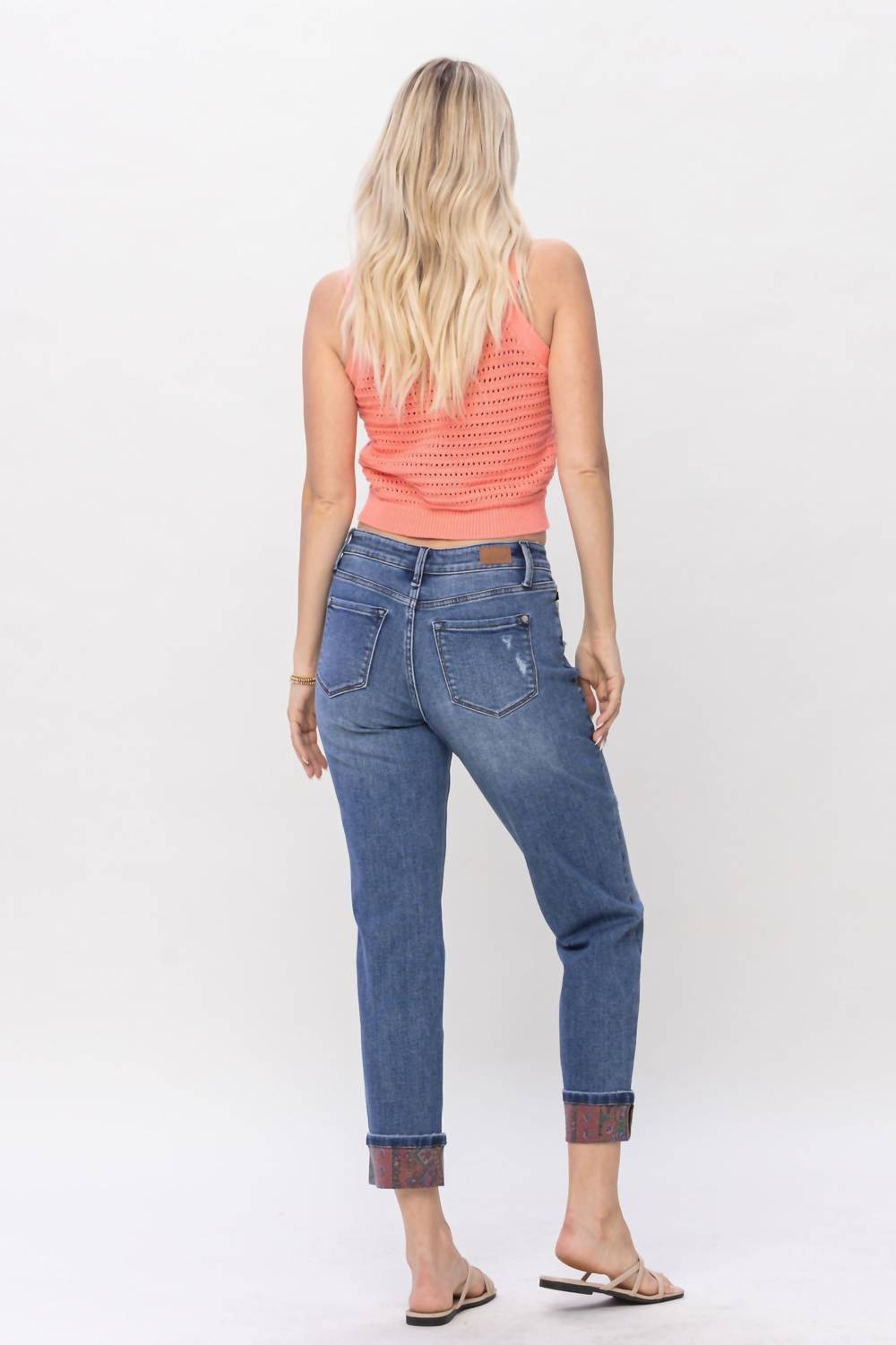 Midrise paisley patch print cuff boyfriend. 94% Cotton / 5% Polyester / 1% Spandex; Patch Fabric: 93% Cotton / 6% Poly / 1% Spandex. Front Rise: 10". Inseam: 28 1/2" / 31 1/4" (Cuffed / Uncuffed).