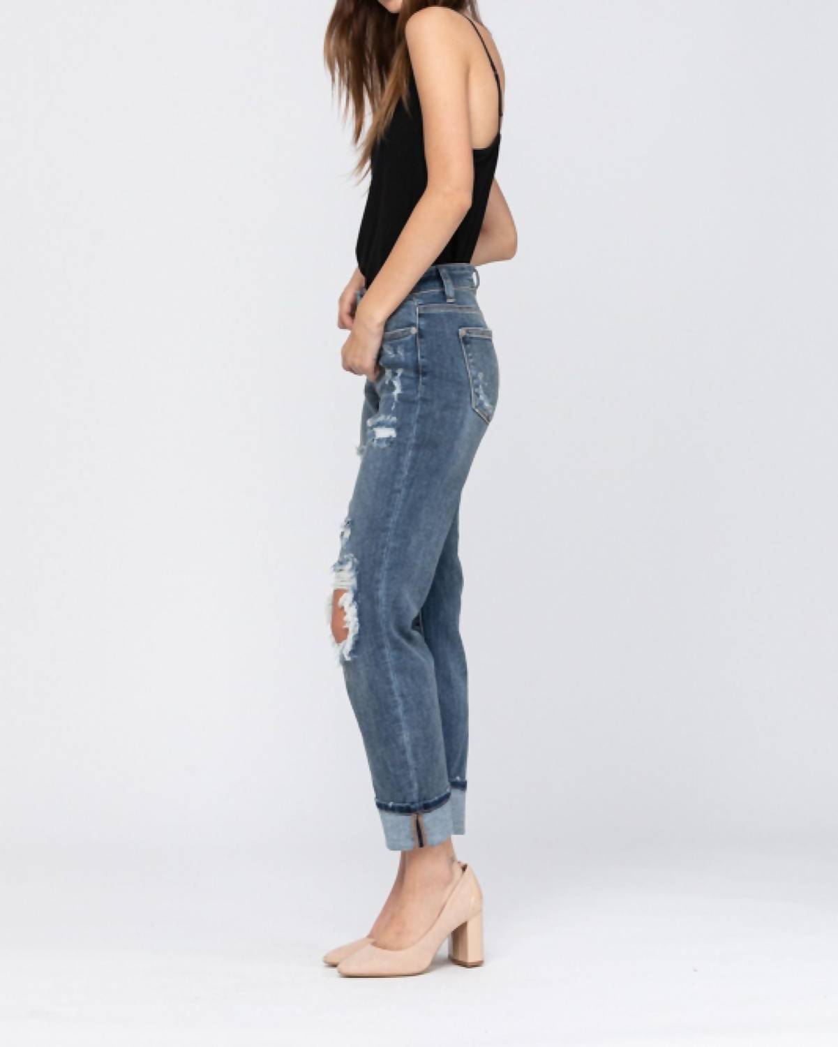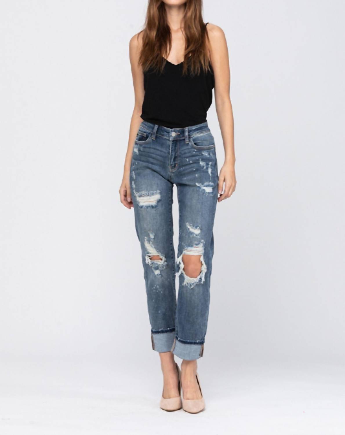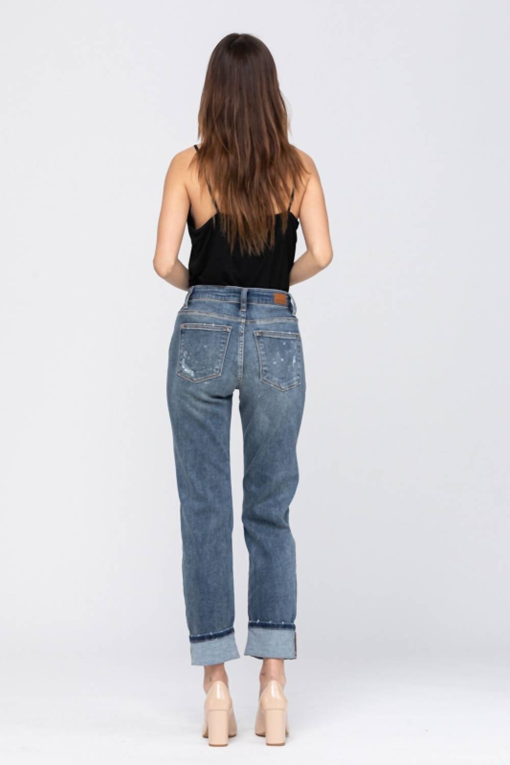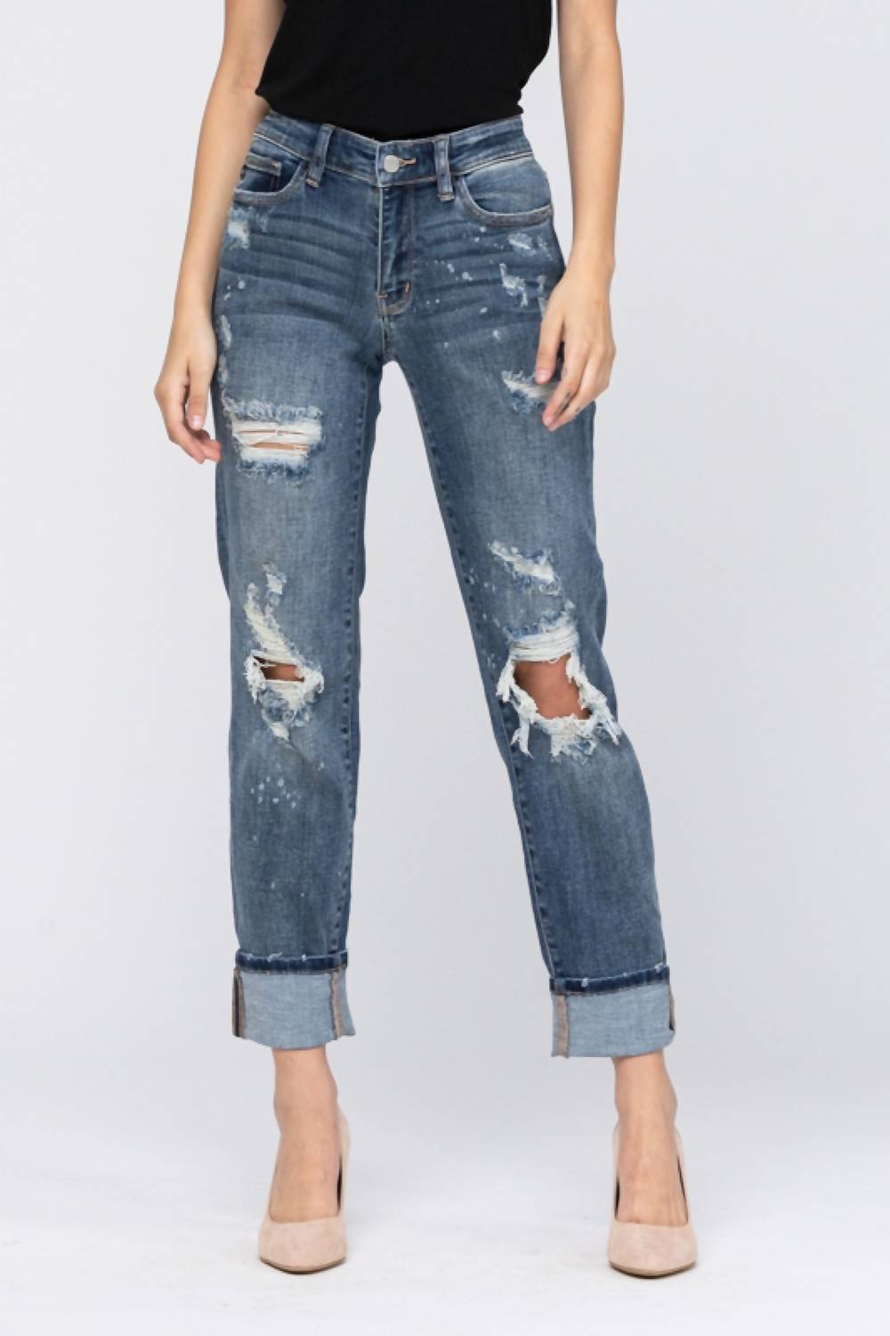 Embrace laid-back style with the Splatter Boyfriend Jean by Judy Blue in a dark wash. Crafted from a comfortable cotton blend composed of 98% Cotton, 6% Polyester, and 1% Spandex, these jeans offer an easy fit with a 30" inseam uncuffed and a 27" inseam when cuffed. Featuring a relaxed 9" rise and a zip closure, these jeans are perfect for a casual day out. Enjoy versatile styling with this quintessential addition to your wardrobe.