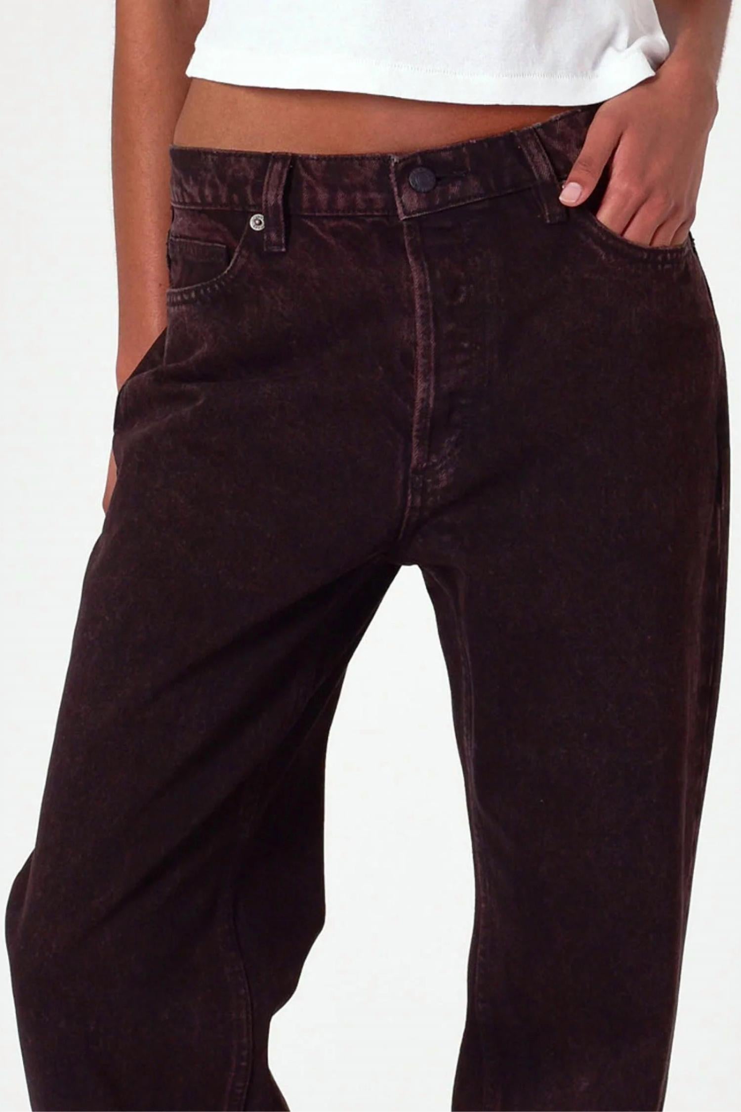 a laid-back feel while still surprisingly form-flattering. Embrace a vintage vibe with the 90's Boyfriend Jean by ROLLA'S, in a rich chocolate hue. Tailored with a relaxed boyfriend fit, these jeans feature a mid-rise waist and a straight leg design for a laid-back yet stylish look. Crafted from 99% cotton and 1% elastane, these jeans offer comfort with a touch of stretch. Full-length inseam measurements are 77 cm (30.3 inches), with a rise of 26 cm (10 inches) and a hem of 45 cm (17.7 inches). The design is finished with ROLLA'S signature back pocket stitching and a vintage logo button closure.