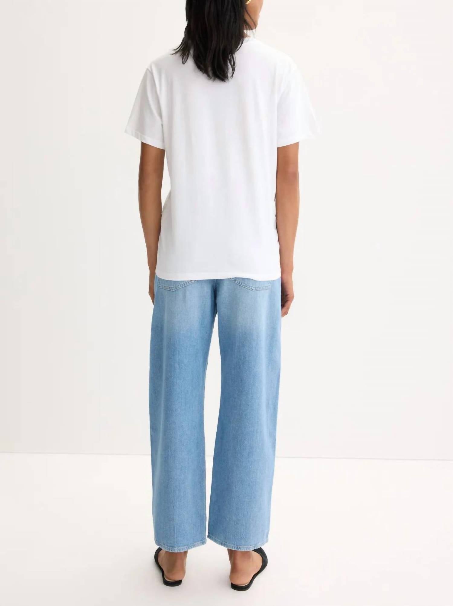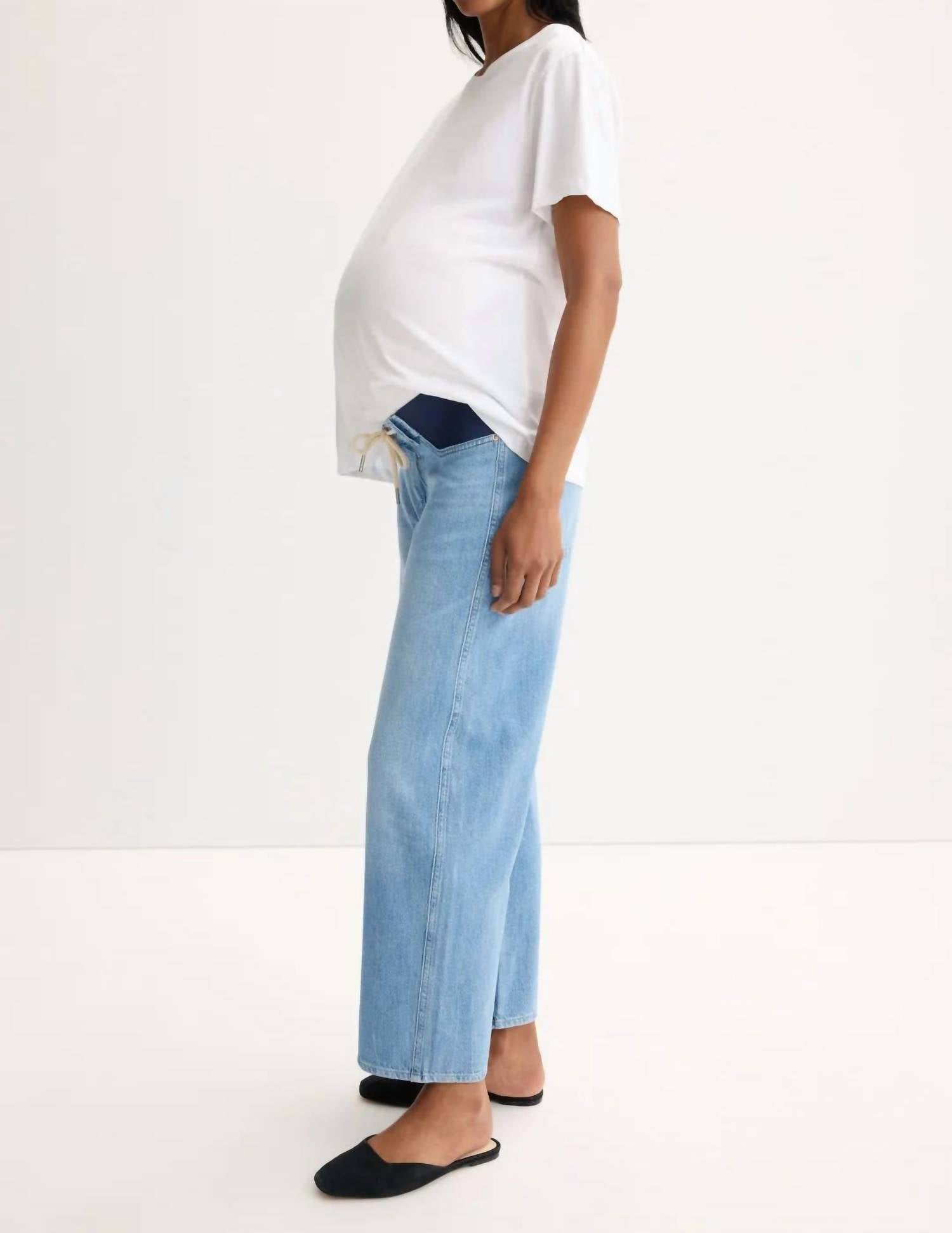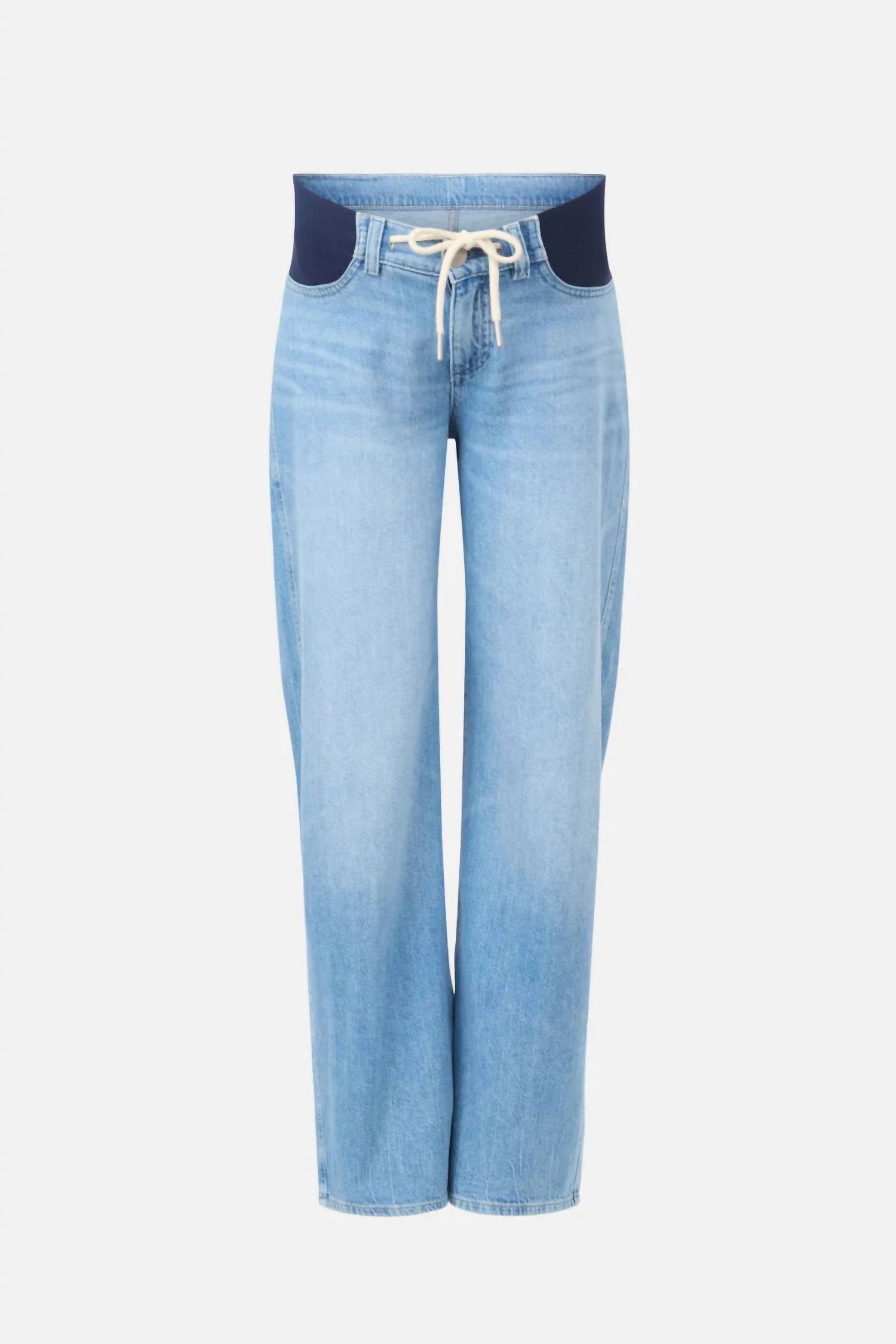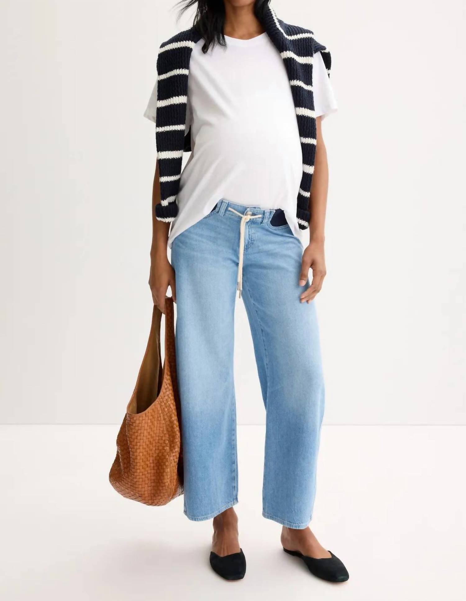 These boyfriend jeans make anything you pair them with look effortlessly cool. Introducing the DL1961 Women's Maternity Taylor Relaxed Barrel Jeans in Beachwave, perfect for a minimalist, bump-friendly style. These solid, beachwave-colored jeans feature a relaxed fit and straight leg style, complete with convenient pockets. Designed for effortless travel, they include a zip closure for easy wear. Care: Machine wash and tumble dry. Ideal for Fall and a casual Thanksgiving gathering.