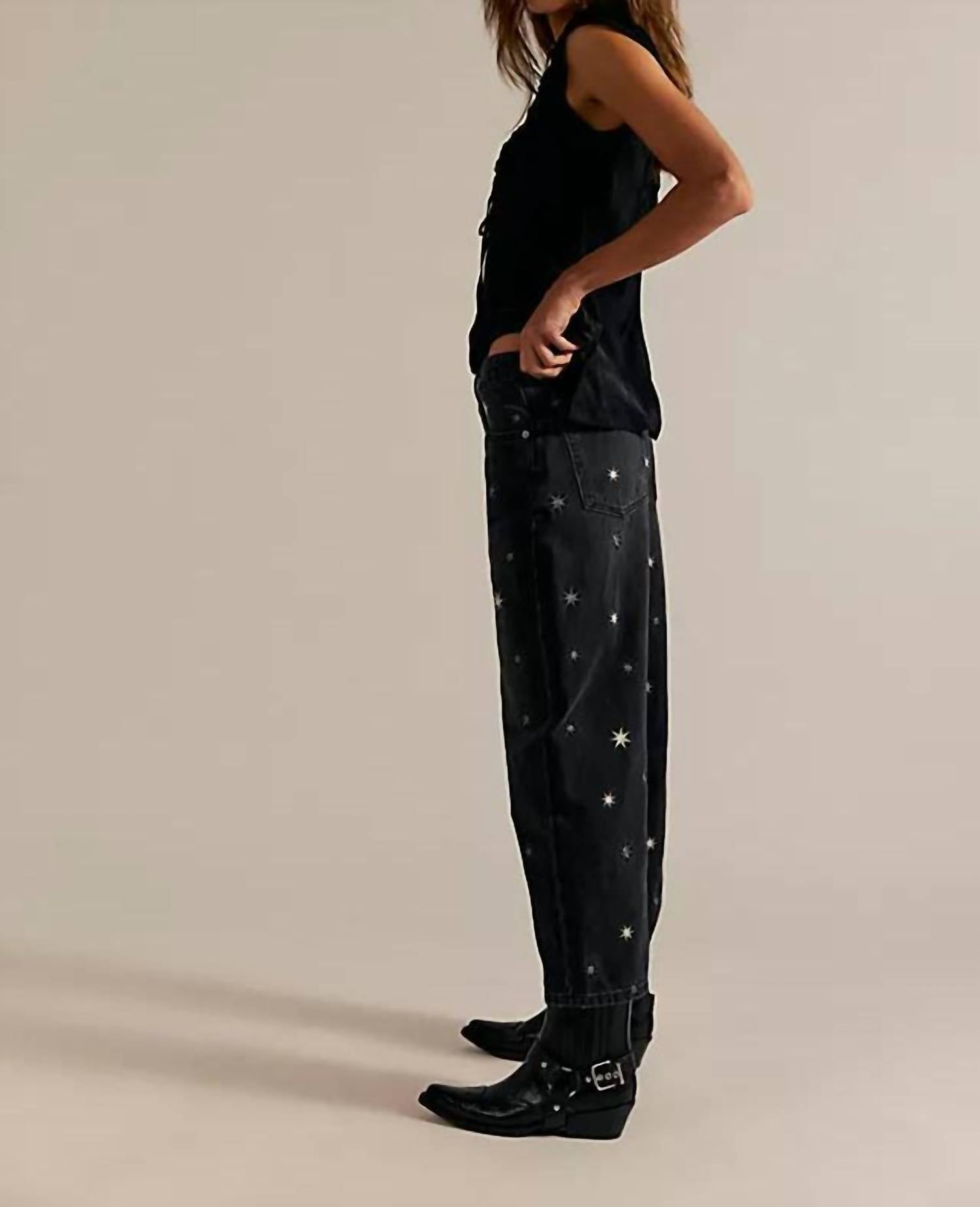 a laid-back feel while still surprisingly form-flattering. Discover the Deep Trance Shine Embroidered Boyfriend Jeans by Free People, a must-have for your denim collection. Featuring intricate star embroidery and a bootcut leg, these jeans are crafted from rigid cotton for a comfortable fit. With a low-slung, dropped crotch design, they include a convenient button-fly closure and a practical five-pocket style. Measuring a 25-inch ankle-length inseam, they are best suited for spring concerts or any casual outing.