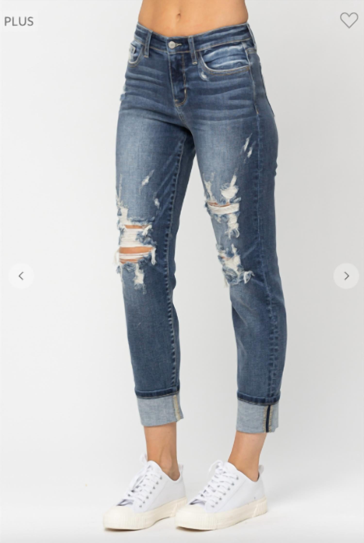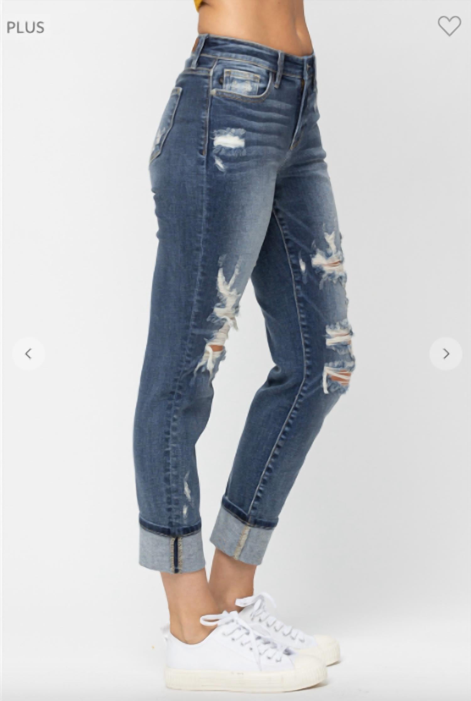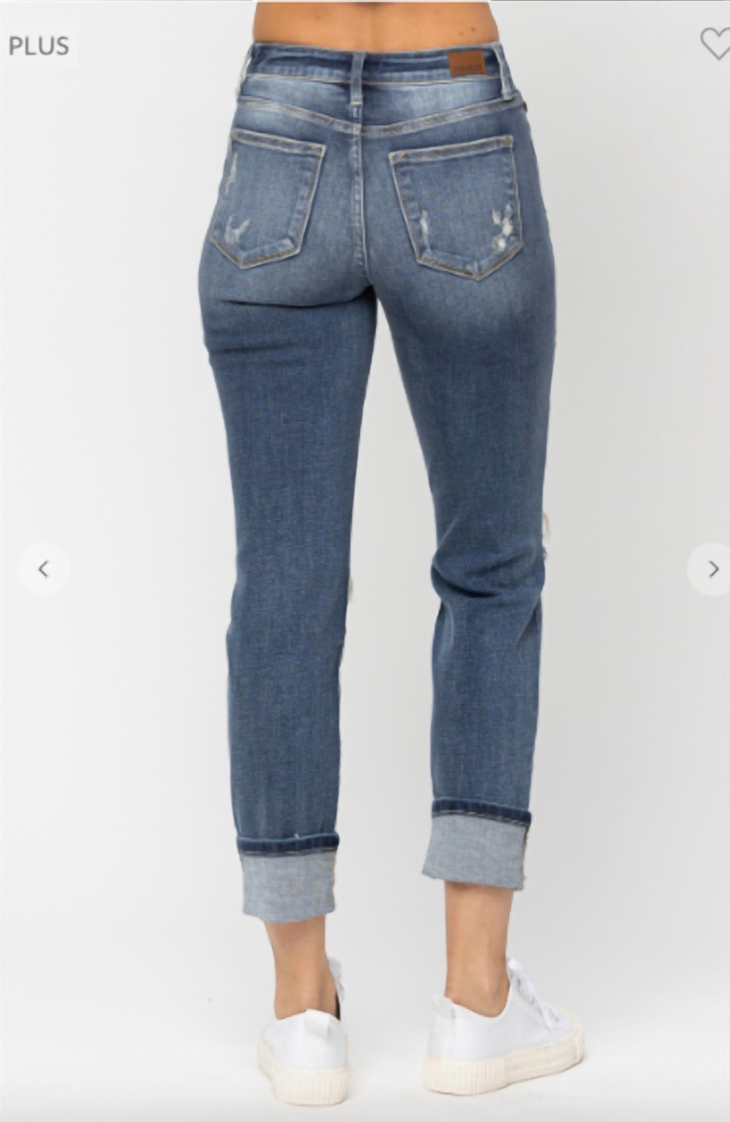 a laid-back feel while still surprisingly form-flattering. Meet the Mid Rise Cuffed Destroyed Boyfriend Jeans by Judy Blue, the perfect addition to your streetwear wardrobe in a trendy medium wash. Designed with a comfortable mid-rise and straight leg fit, these jeans are made from a cotton blend of 93% Cotton, 6% Polyester, and 1% Spandex. With a versatile inseam of 27" cuffed or 30" uncuffed and a stylish 11.5" rise, they feature a button closure and convenient pockets. Care: Machine wash.