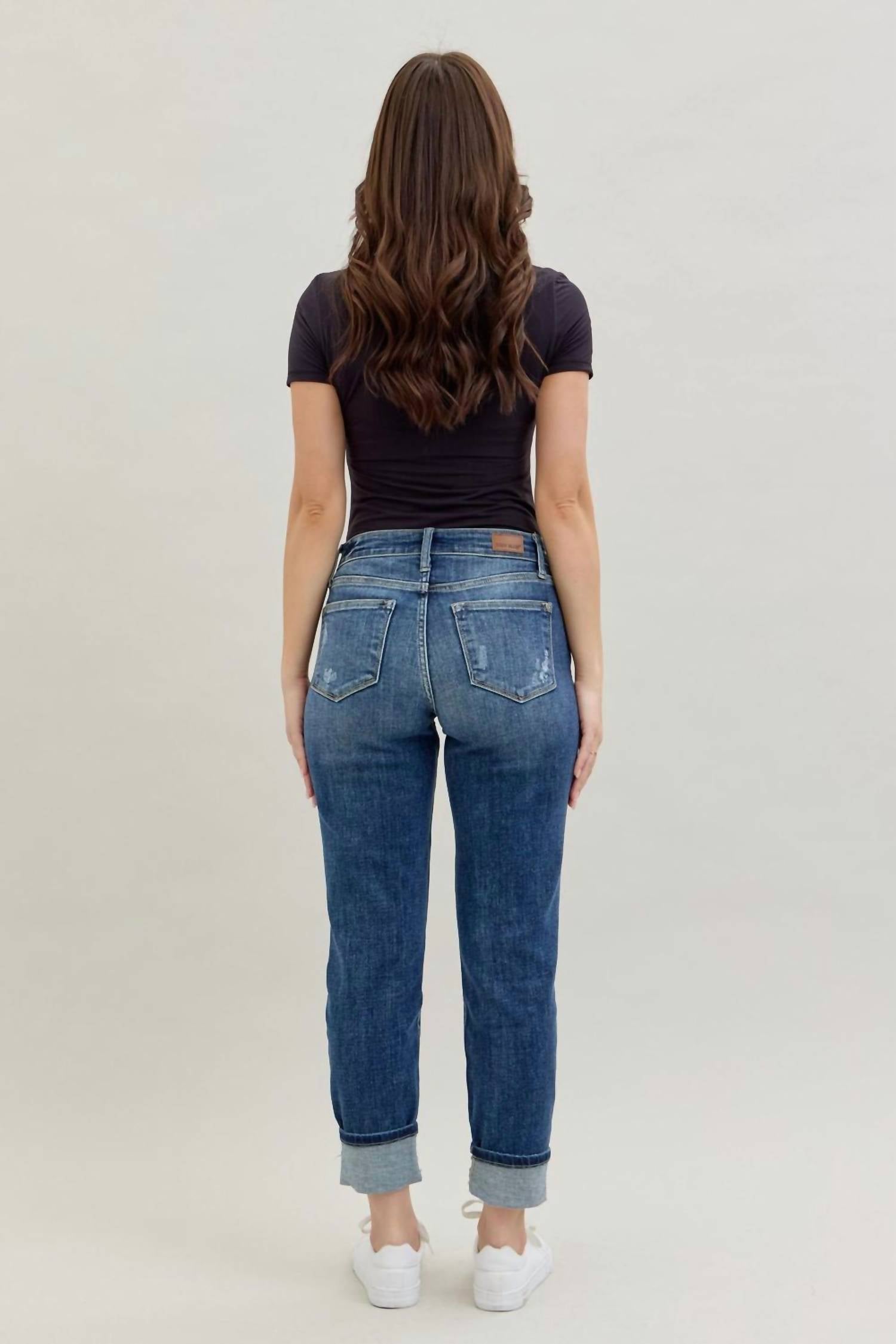 These boyfriend jeans make anything you pair them with look effortlessly cool. Meet the Judy Blue Mid-rise Cuffed Destroyed Boyfriend Jeans, crafted for those who crave a relaxed yet stylish silhouette. Featuring a cotton blend of 93% Cotton, 6% Polyester, and 1% Spandex, these jeans provide comfort with their boyfriend fit, cut loose through the thighs and waist. Designed with a button closure and available in regular and plus sizes, they offer a mid-rise fit with a front rise of 9.75 inches and a versatile 27-inch inseam. Care for these dark wash jeans by turning them inside out, washing in cold water, and opting for air drying or tumble drying on low settings.