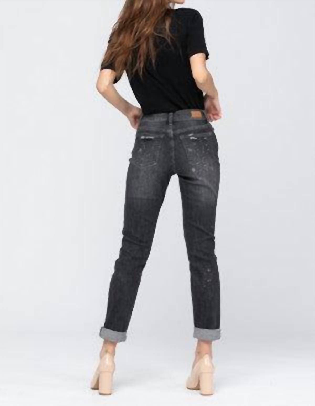 Both boyish and feminine, these jeans have it all. Meet the Women's Destructed Boyfriend Jean by Judy Blue, a chic addition to your casual wardrobe. Crafted from a cotton blend with 92% cotton, 7% polyester, and 1% spandex, these jeans ensure comfort and a slight stretch. Featuring a daring 9.5" rise and a 25" inseam when uncuffed, they boast a straight leg and can be worn cuffed for versatility. The dark wash and button closure add a cool, grunge vibe while the distressed and bleach-splattered design makes them perfect for travel. Care: Machine wash.