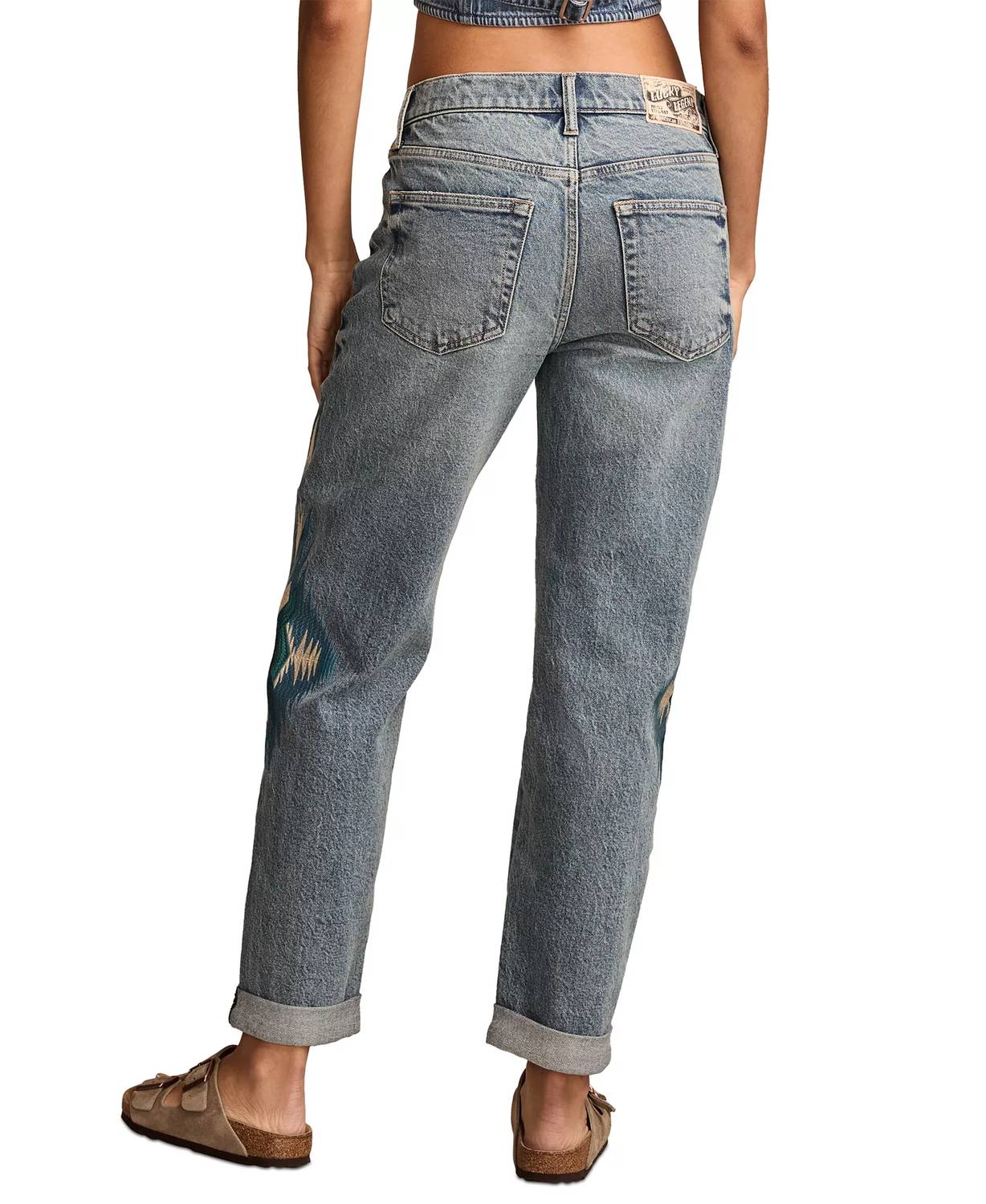 Both boyish and feminine, these jeans have it all. Elevate your wardrobe with the Legend Mid-rise Boy Jeans by Lucky Brand, showcasing Southwestern-inspired embroidery for a unique touch. These mid-rise, boyfriend-fit jeans in a Blue Escape Wash are crafted from 67% cotton, 32% lyocell, and 1% elastane, offering comfort and style with a 28" inseam and an 8.5" rise. The jeans feature classic five-pocket styling and a straight leg with a zipper and button closure at the front. Perfect for travel and western-inspired looks this spring, these jeans should be machine washed to maintain their medium denim wash appeal.