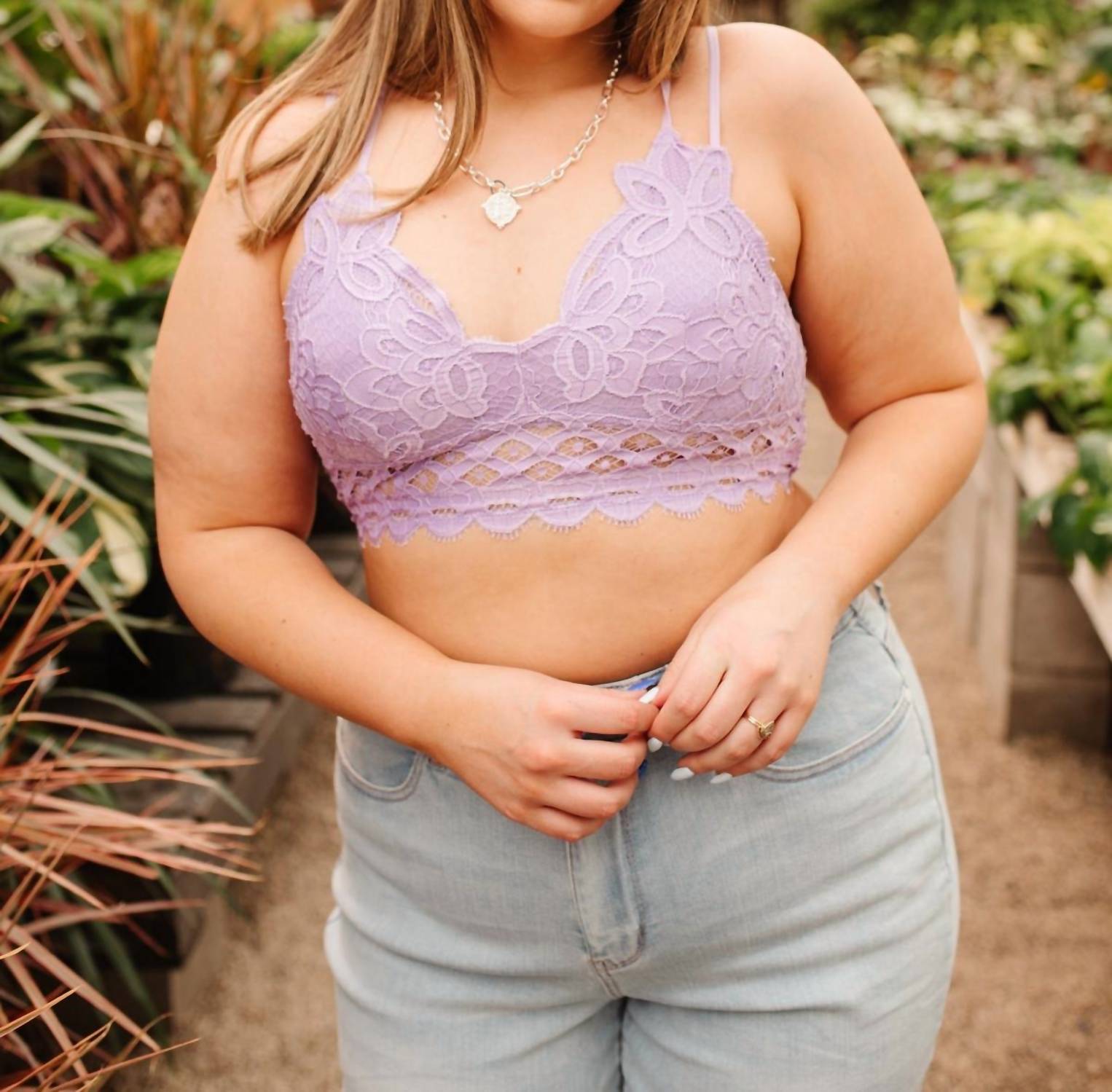 Add a little sweetness to your day in the So This Is Love Bralette! A floral, crochet lace lines darted triangle cups, and a sheer bottom band while double, adjustable straps cross over a smocked, elasticized back. Pull on design. Lace Bralette + Size up for more coverage. Smocking along back + Adjustable straps. 60% Nylon, 40% Cotton. Wash cold, hang dry. True to size, cropped stretchy material. Length: 13".