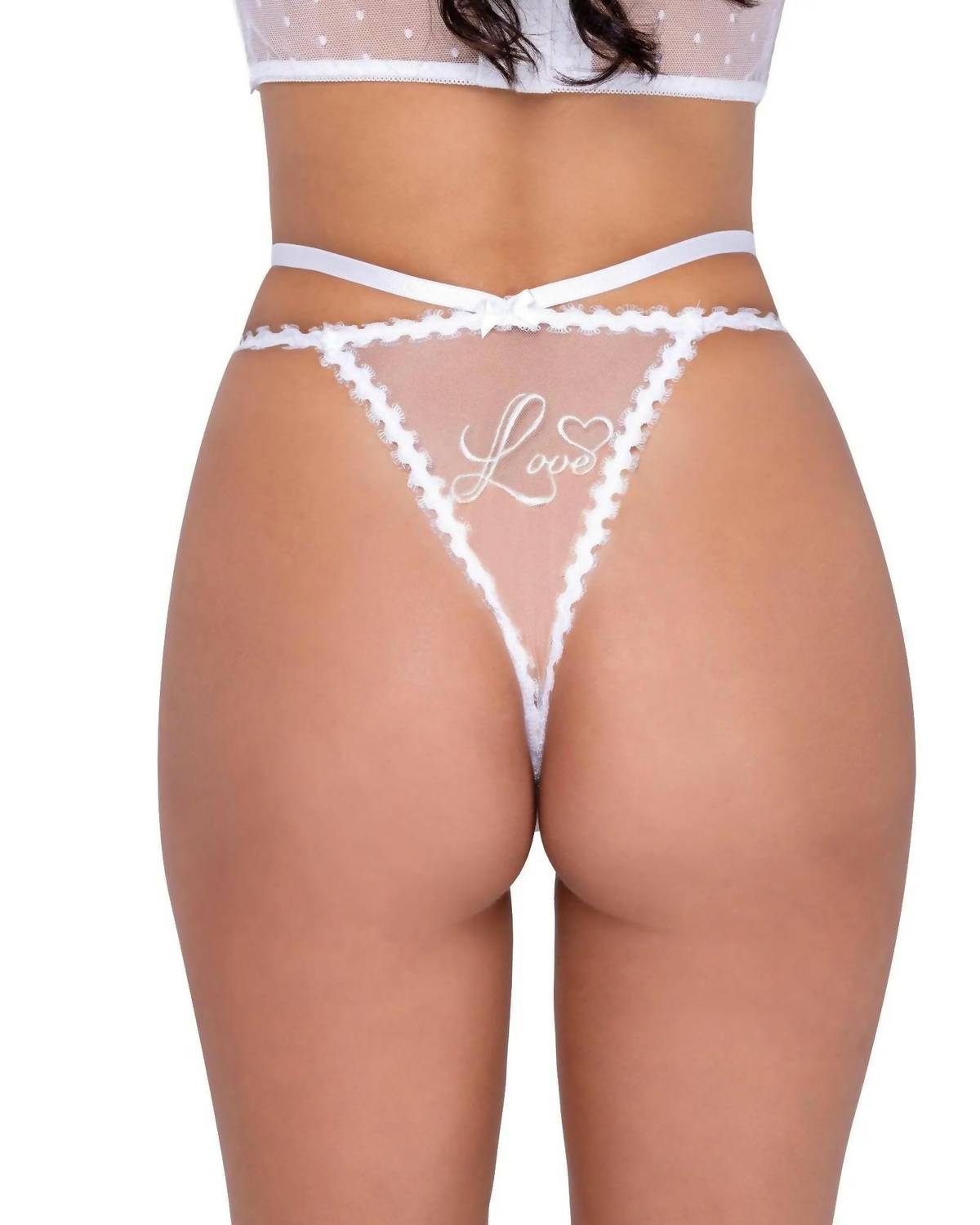 This bra will be your new top-drawer favorite. Introducing the Forever Yours Long Line 2 Piece Bra Set by Roma Confidential, a perfect choice for special occasions. This women's set, in elegant white, features a textured pattern and is crafted for the ultimate in quiet luxury. The long line bra boasts lace heart embroidery with swiss dot illusion tulle, a satin ribbon bow detail, and a supportive demi cup with underwire, finished with a secure hook & eye closure. The matching panty also features lace heart embroidery and a "Love" embroidered Brazilian back with a comfortable cotton gusset. Care is simple with hand wash instructions.