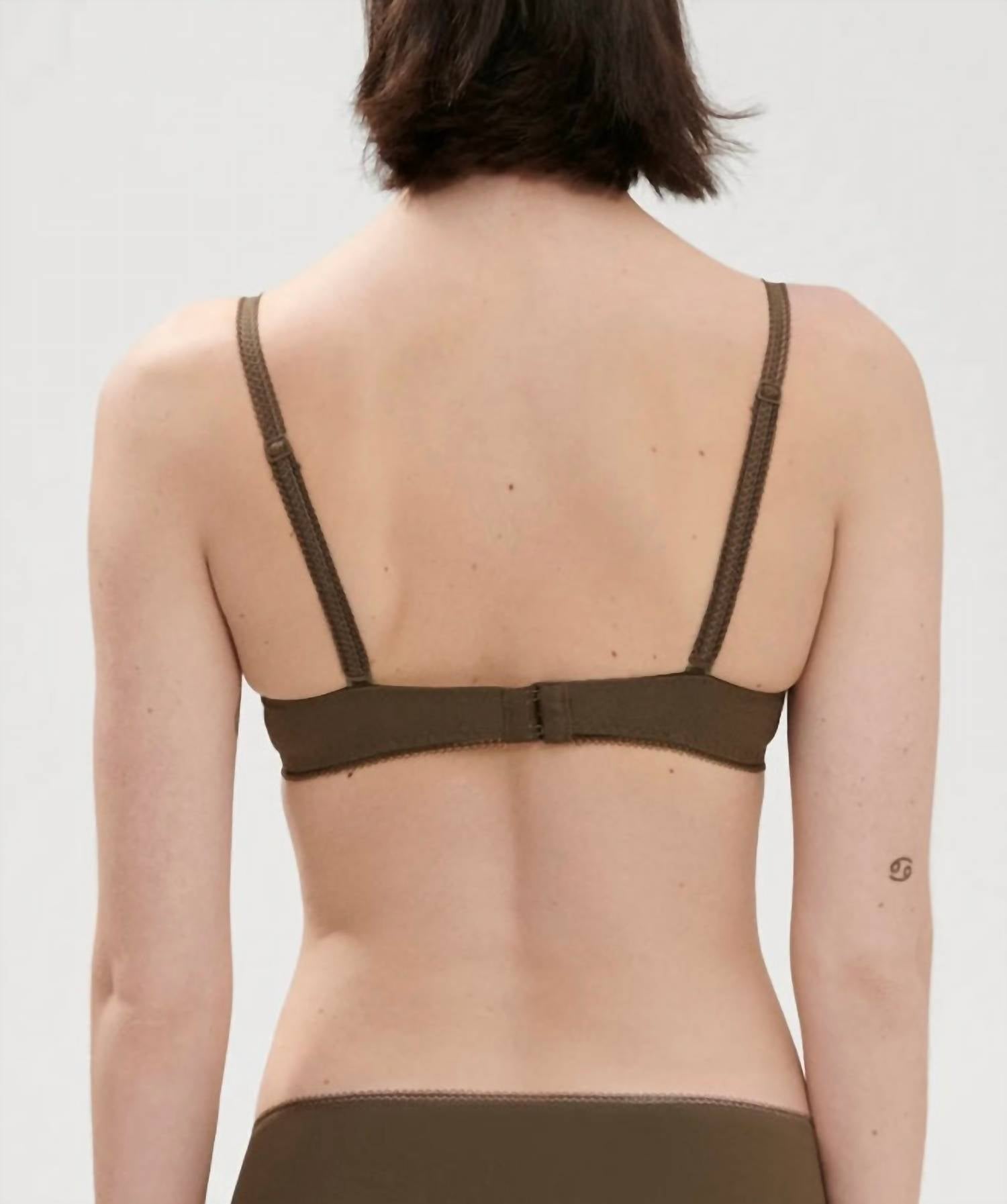This bra will be your new top-drawer favorite. Introducing the Amazone Décolleté Plongeant Bra by Simone Perele in the elegant Vert Nomade shade, a must-have for stylish support. This bra boasts an enveloping triangle shape with a plunging neckline, perfect for all breast types. Crafted from textured polyester, it features underwire support without cups, and adjustable, multi-position straps for a custom fit. Care is simple with machine wash instructions.