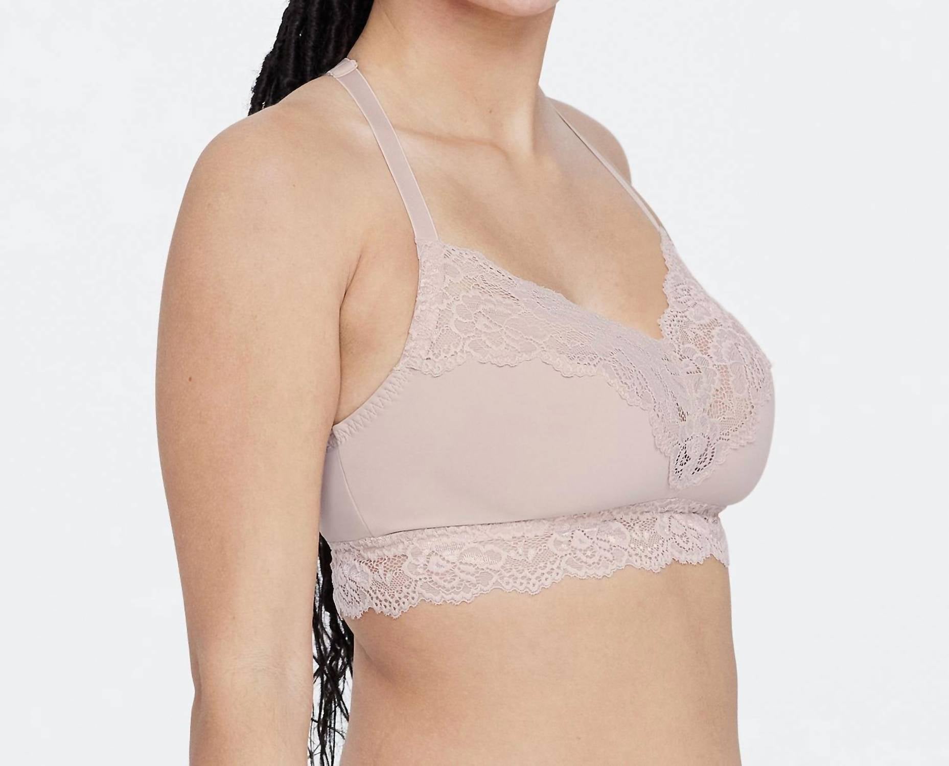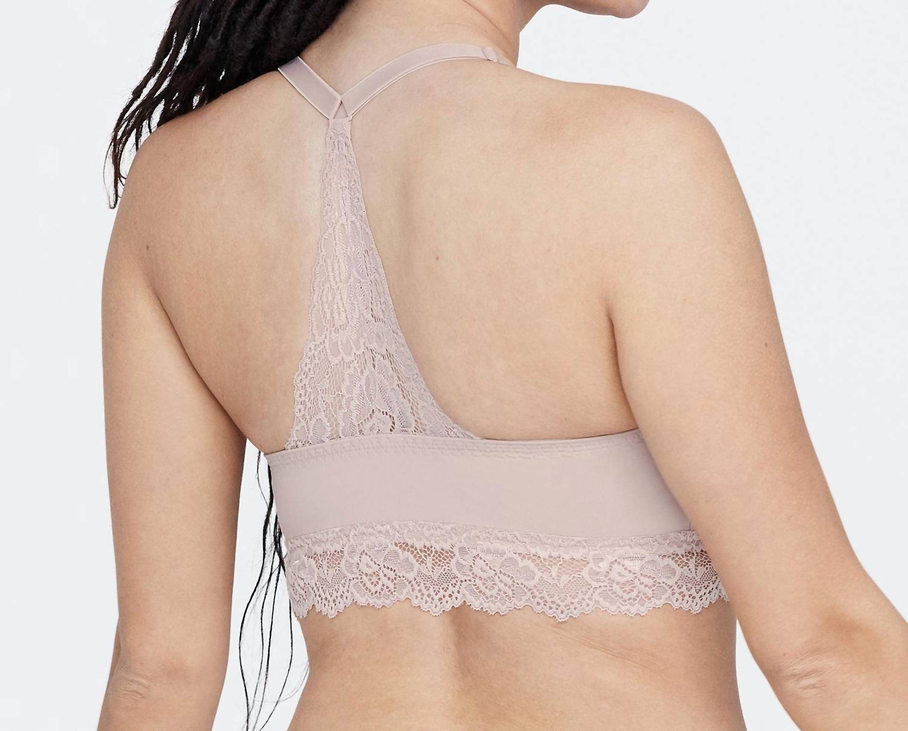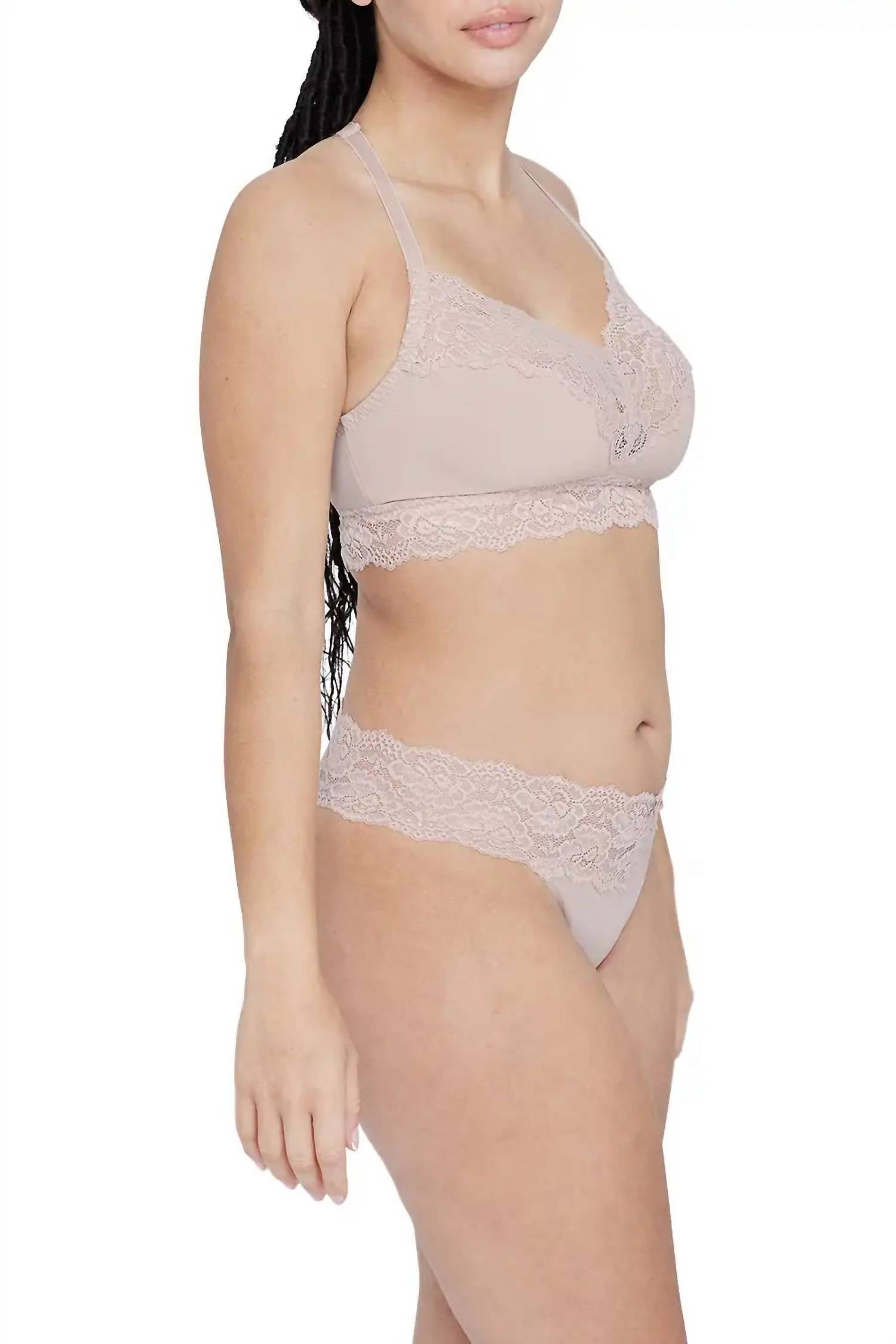 The most comfortable and stylish bra that you'll reach for daily. Introducing the Goddess T-back Busty Bralette by Skarlett Blue, a refined choice in Cashmere that merges comfort with feminine allure. Crafted with wireless design, this bralette features Goddess signature lace at the neckline and bottom band, three plies of ultra-soft fabric for enhanced support, and a dramatic lace racer back. Composition includes 92% Nylon and 8% Elastane for the lace, complemented by 80% Nylon and 20% Elastane for the fabric. Care instructions recommend hand washing in cold water, washing colors separately, using non-chlorine bleach when needed, line drying, and avoiding ironing and dry cleaning.