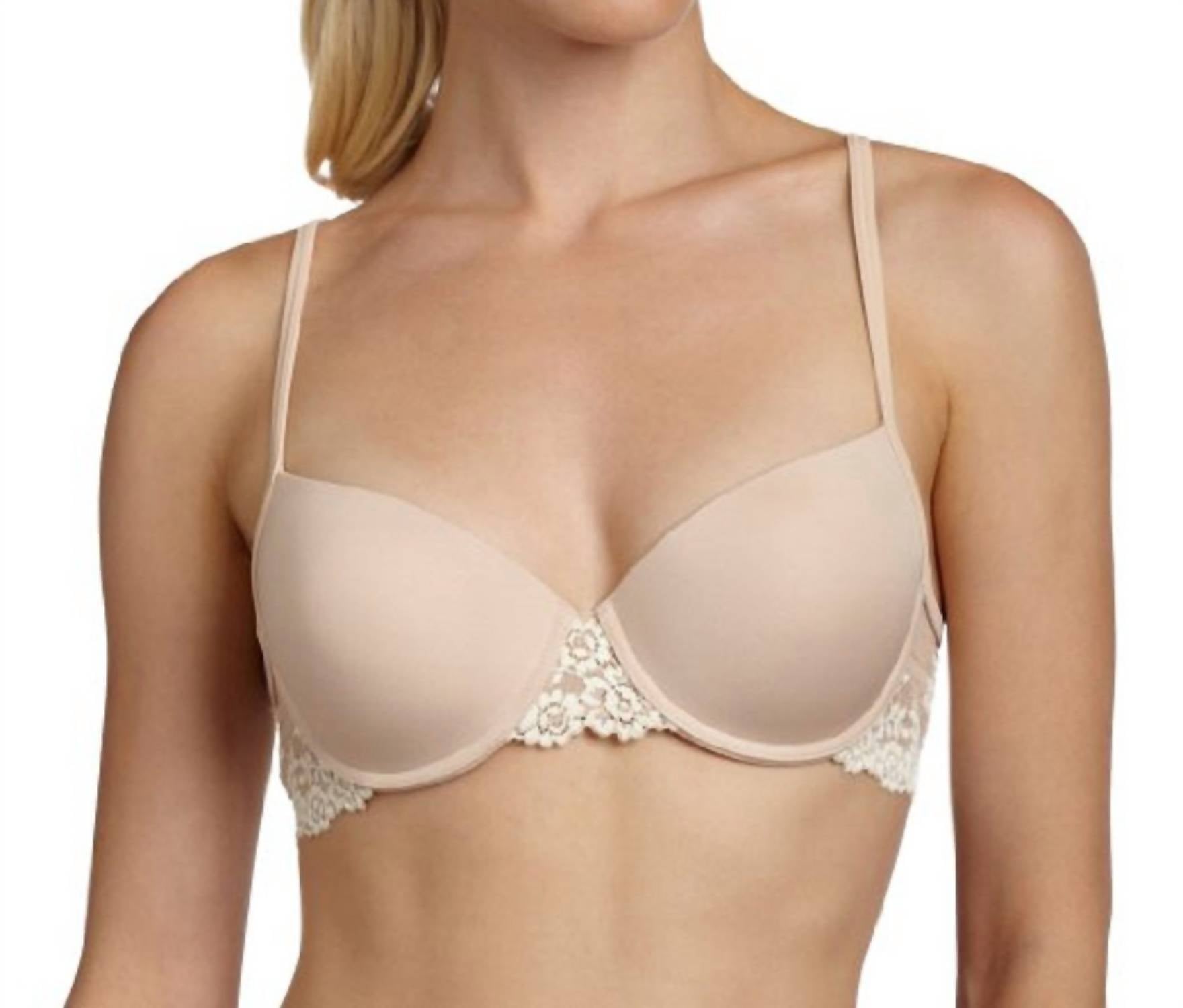 This Petite Embrace Lace Push-Up Underwire Bra features stretch contour cups made from 92% Nylon and 8% Spandex, with lace made from 54% Nylon, 33% Polyester, and 13% Spandex. It includes removable cookies for neckline enhancement and embroidered lace detailing.