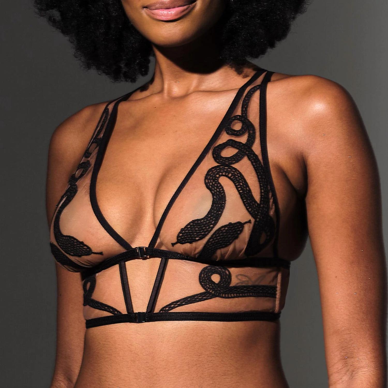 The most comfortable and stylish bra that you'll reach for daily. Introducing the Medusa Bralette by Thistle and Spire, a striking piece that embodies quiet luxury. This tulle bralette in alluring toffee features exclusive snake embroidery, complemented by a textured mesh back. Made from 100% nylon, it is adjustable at both the shoulder and back straps, ensuring a perfect fit. Care for this elegant piece by hand washing and line drying, making it an exquisite choice for springtime anniversaries or Valentine's Day occasions.