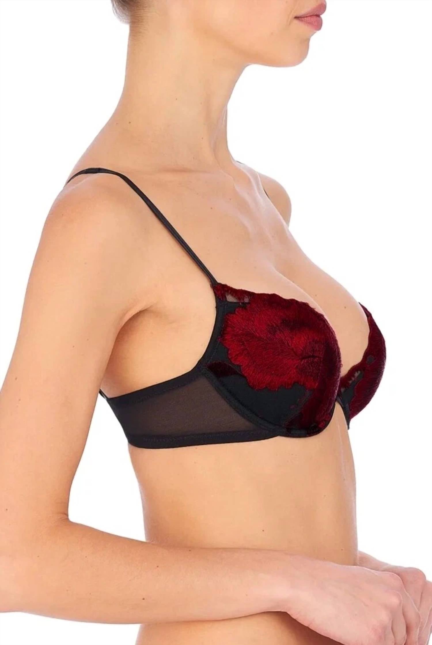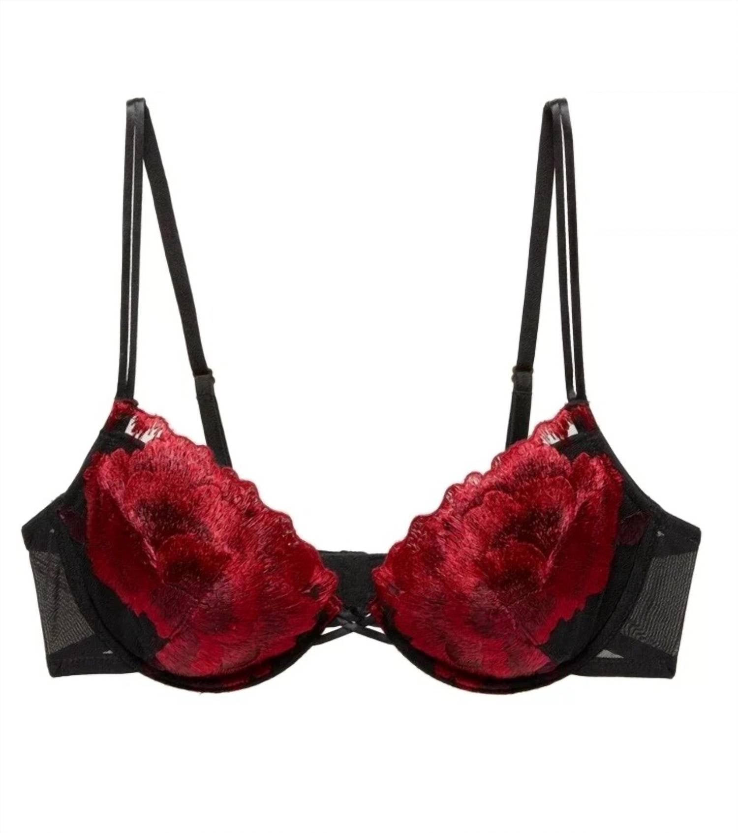 This bra will be your new top-drawer favorite. A luxurious demi-contour underwire bra featuring exclusive Swiss embroidery with an exceptionally soft hand feel. The cut-and-sew demi cups are gentle against the skin, while the outer darted embroidery provides subtle shaping. The center gore is accented with a delicate woven detail, and lightweight sheer mesh backs offer gentle support. Front split straps combine with adjustable single straps at the back for a customized fit, complemented by signature gold hardware. Made with 100% polyester embroidery, 84% nylon and 16% Lycra® mesh, and 100% polyester cup lining.