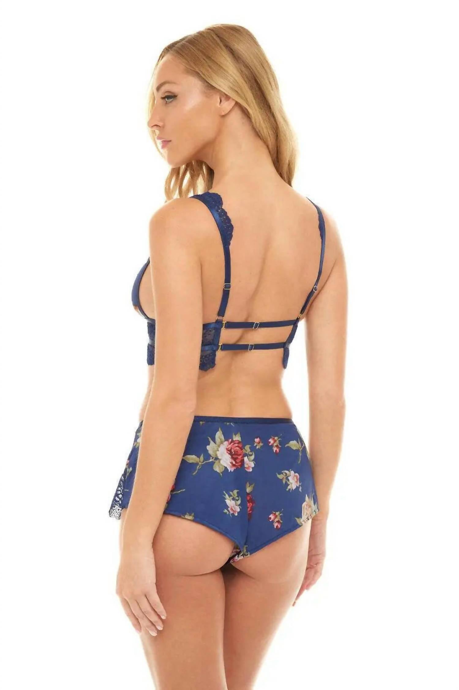 Both pretty and functional. Need we say more? Embrace elegance with the Naeva Floral 2 Piece Bra Set by Oh La La Cheri, featuring a seductive Estate Blue Scattered Rose pattern. This women's set boasts a soft cup bra and matching tapshort with wide scallop lace detailing, offering a blend of sensuality and femininity. Designed with adjustable cross-over back straps and standard adjustable shoulder straps for a perfect fit. Enjoy the comfort of stretch paperweight microfiber in this summer-ready essential. Care: Hand wash.