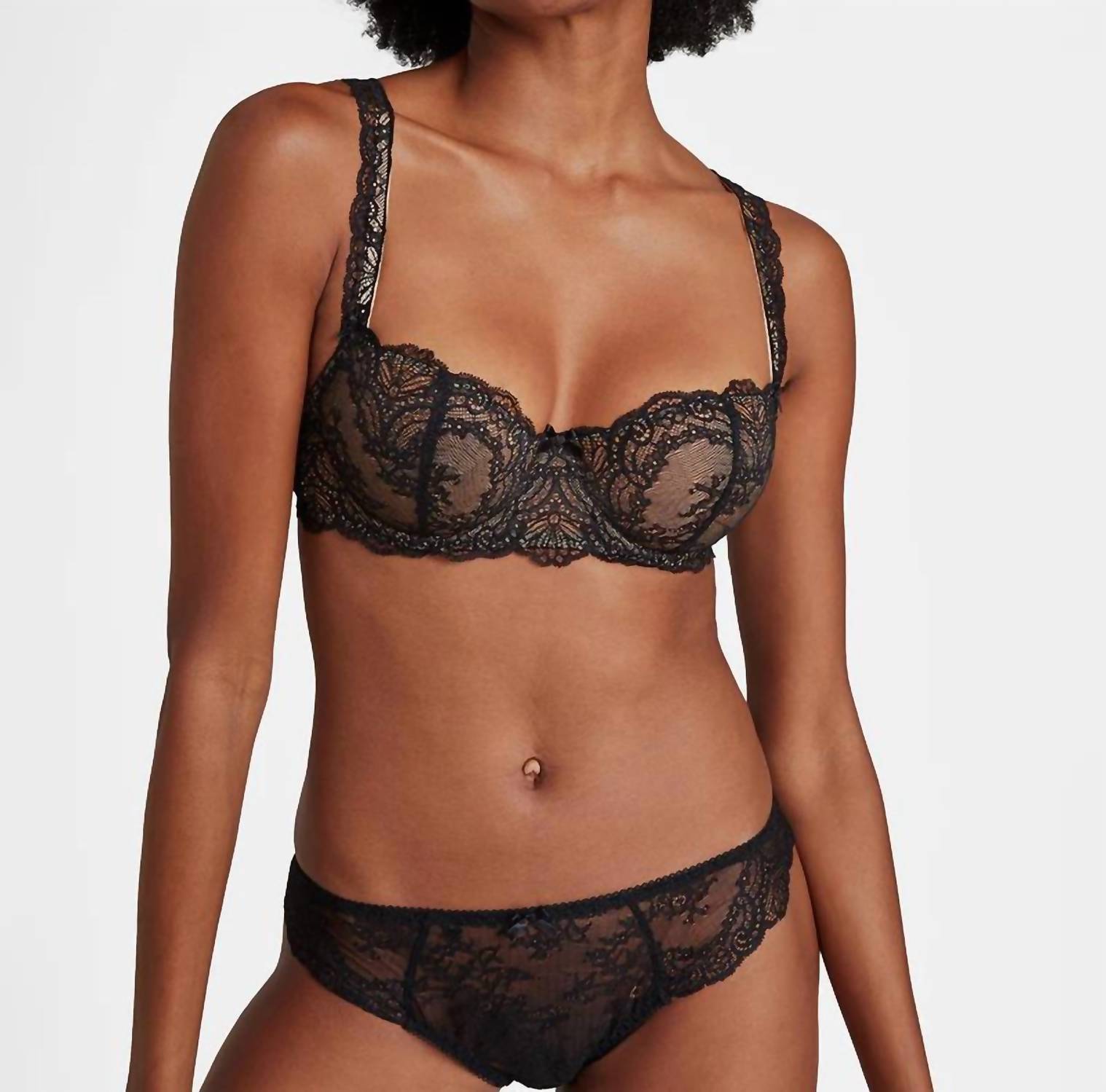 This bra will be your new top-drawer favorite. Embrace comfort and support with the Danse Des Sens Unpadded Half Cup Bra by Aubade, designed to beautifully shape the bust up to a cup size G. This black lace bra features alluring details like a satin bow between the cups and an unusual rounded hook fastening at the back. Crafted with 89% Polyamide and 11% Elastane lace, this textured piece is as stylish as it is comfortable. Care for it with hand washing and line drying to ensure longevity.