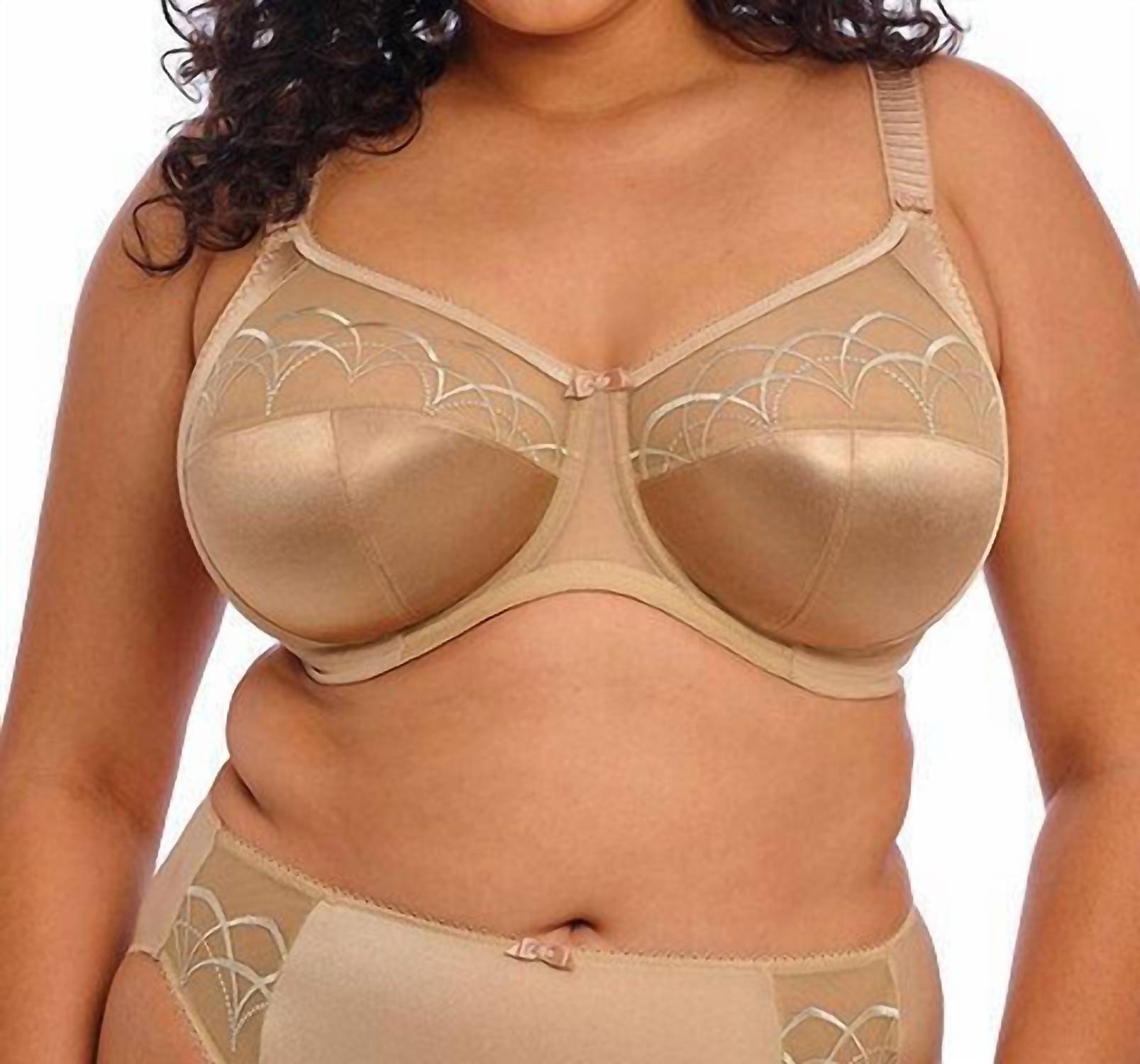The most comfortable and stylish bra that you'll reach for daily. Experience superior comfort and style with the Cate Full Cup Banded Bra by Elomi, available in a chic hazelnut hue. This bra is crafted from polyester and features smooth satin cups with sheer embroidered detailing for an elegant vintage touch. Offering three-piece cups with side support, it provides forward shaping, exceptional uplift, and all-day support. Care instructions: Hand wash. Perfect for a Thanksgiving getaway or a spring vacation, this textured bra ensures ease of fit and prevents strap slippage.