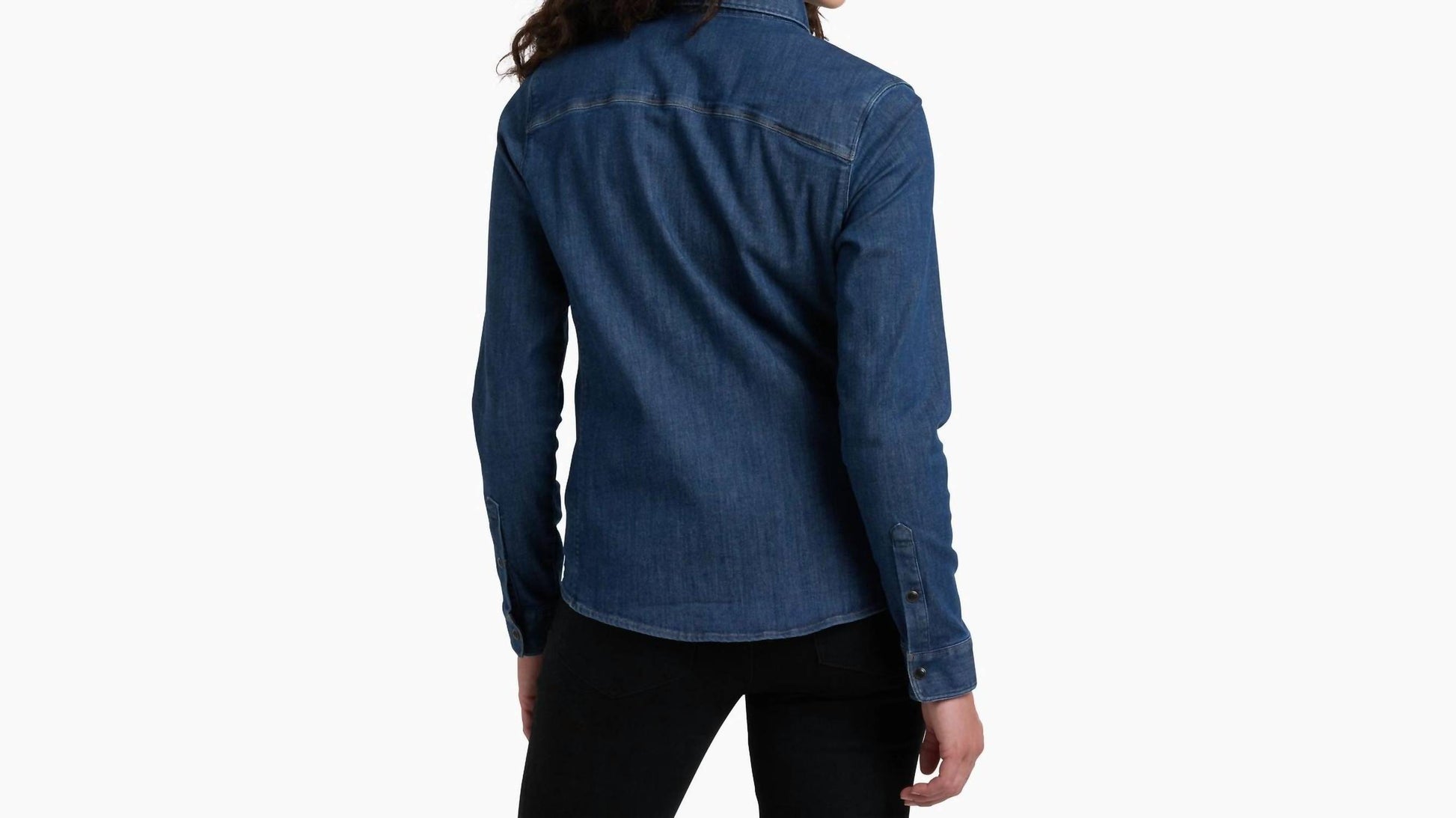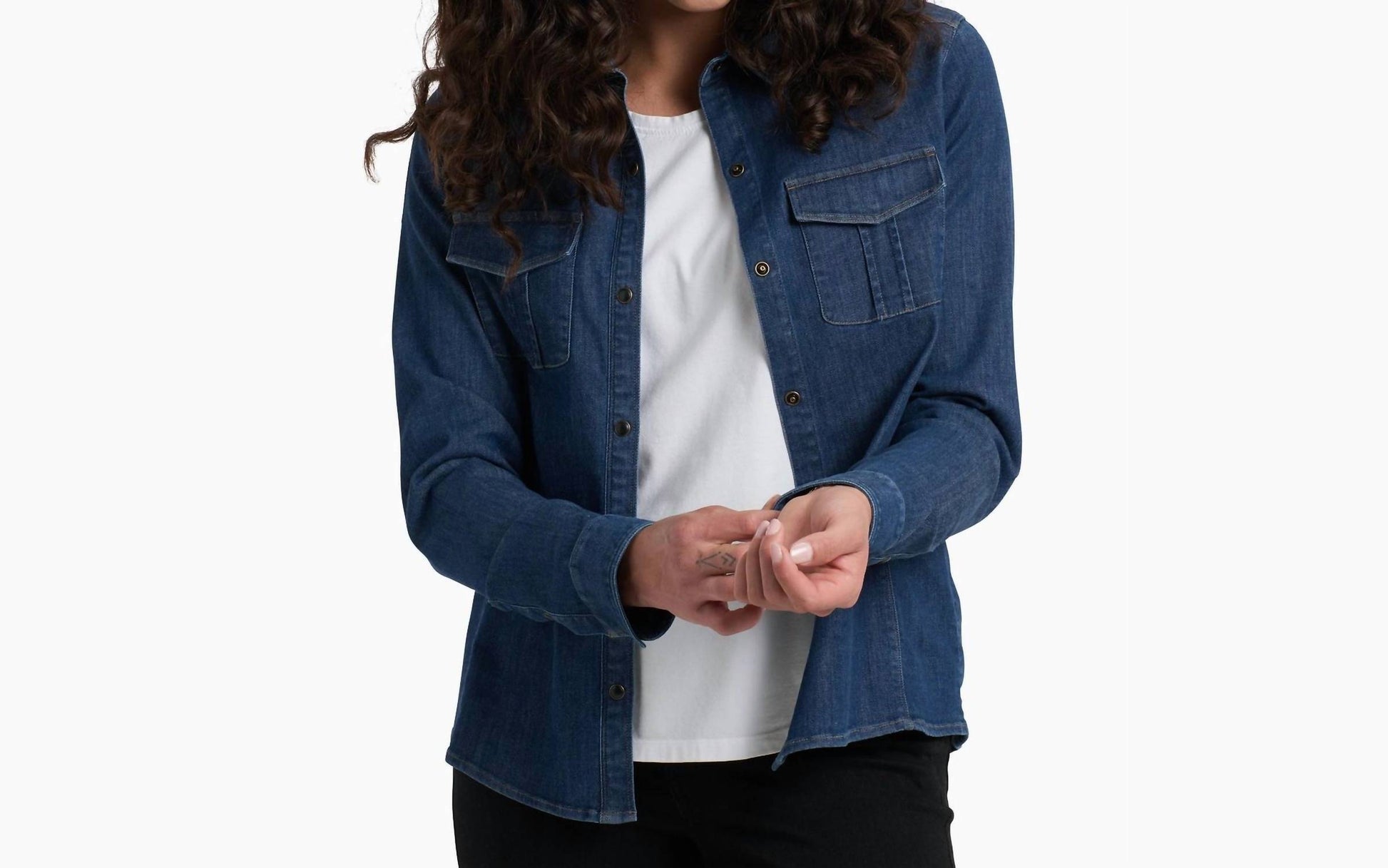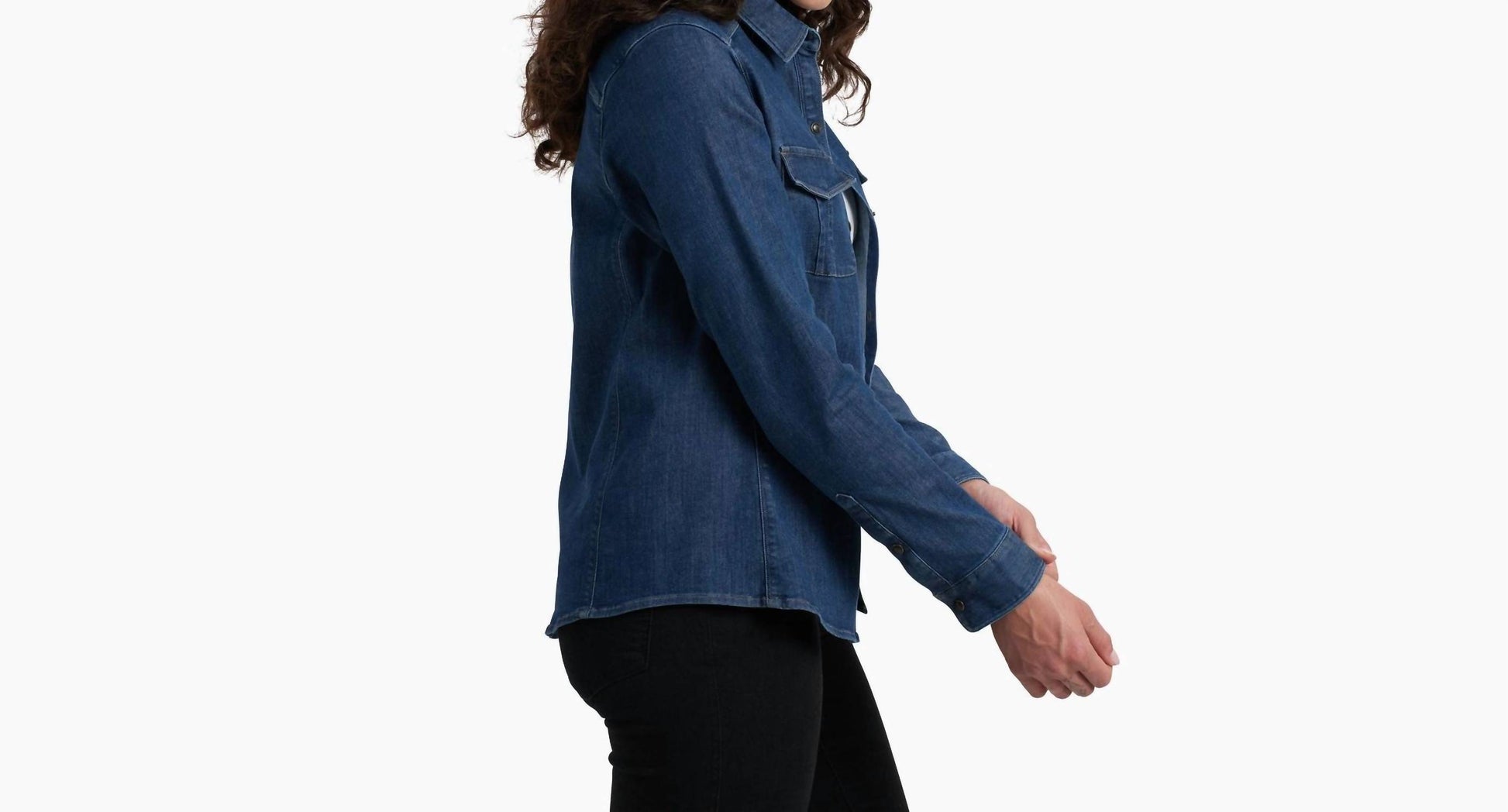 A classic button down shirt that will never go out of style. Experience unparalleled comfort and versatility with the KUHL Josie Denim Shirt in Vintage Denim. This long sleeve button down is crafted from a soft cotton blend composition, featuring lightweight, indigo stretch denim that ensures superior comfort and mobility with its two-way stretch. The snap closure design and princess seams offer a flattering fit, while two chest pockets with hidden snaps add a functional touch. Imported and machine washable, this shirt is easy to care for, making it a perfect addition to any wardrobe.