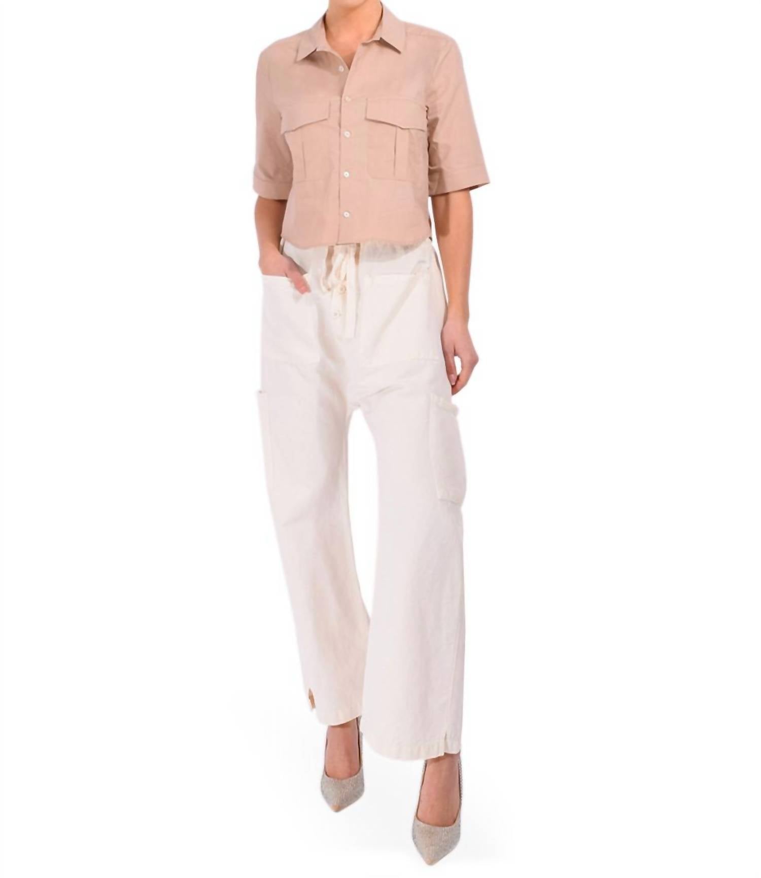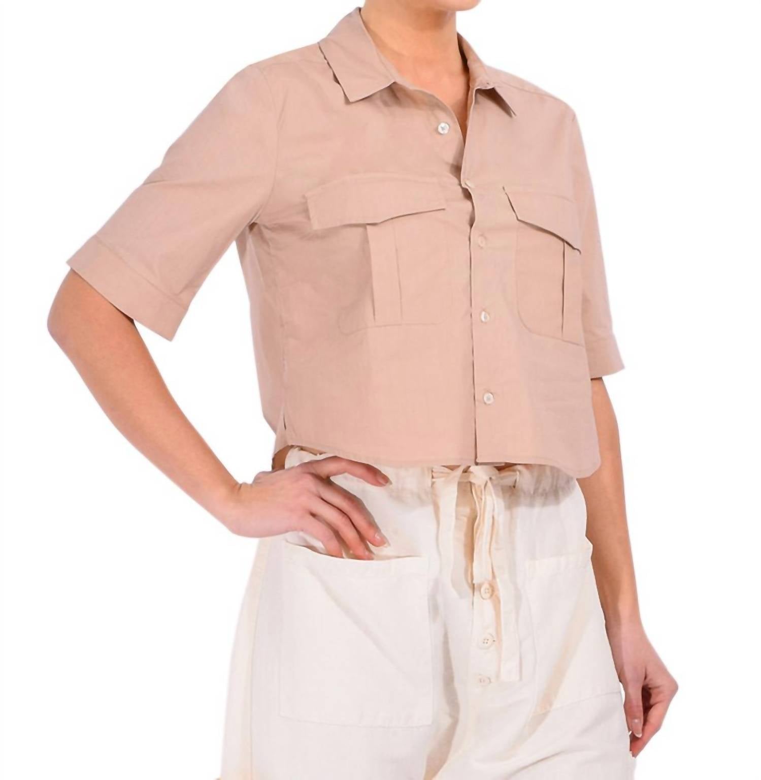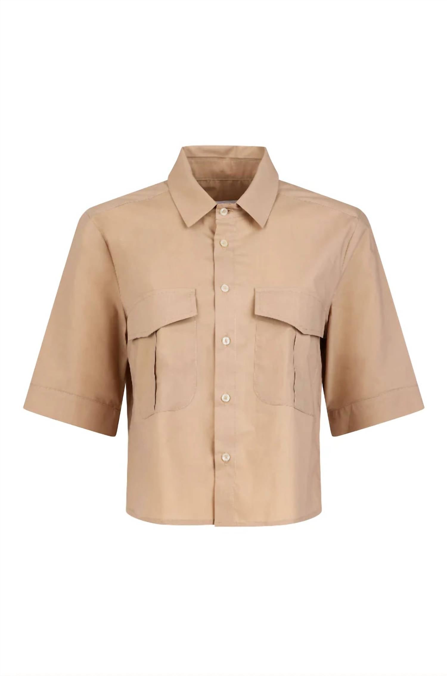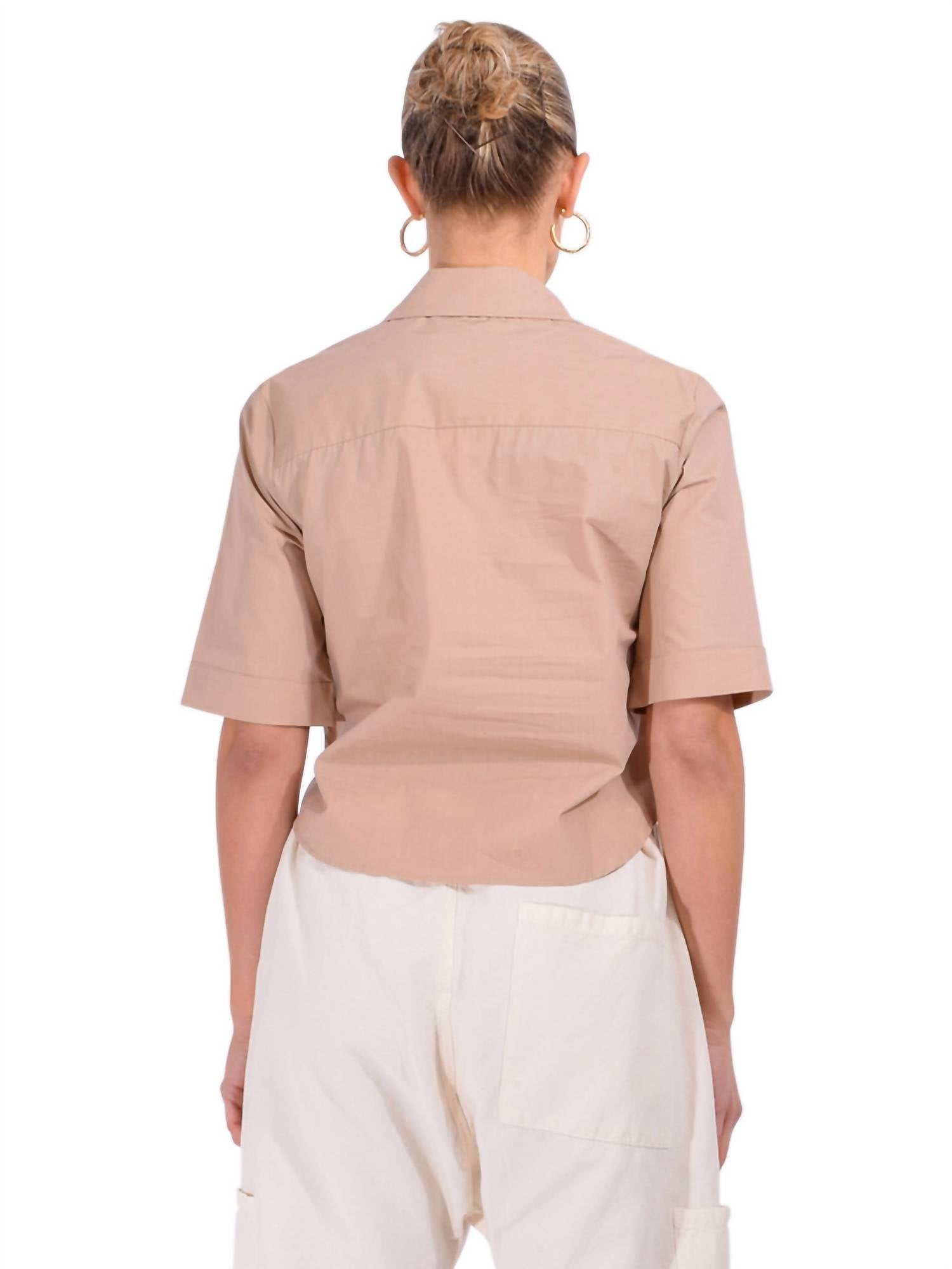 This button down shirt is comfortable yet polished. Introducing the Safari Button Up Shirt by CISSA, a modern piece designed for effortless style in Paper Cotton Sand. This short sleeve shirt is crafted from 100% woven cotton, providing a paper-like touch, and features a unique utility look with two front pockets and a flattering curved hemline. Designed with a collar neckline and a classic button closure, it combines functionality and comfort with its solid color, perfect for fall travel occasions. Care instructions: Machine wash in cold water and line dry. Iron inside out on medium heat as desired, avoiding bleach.