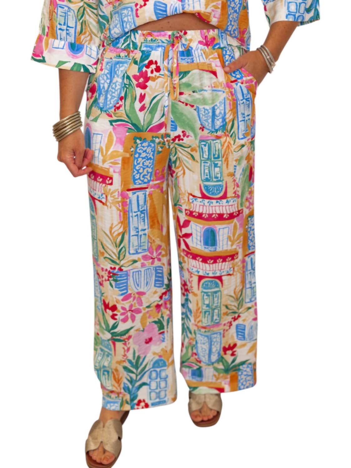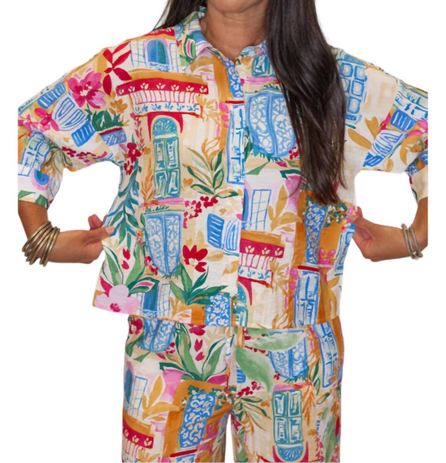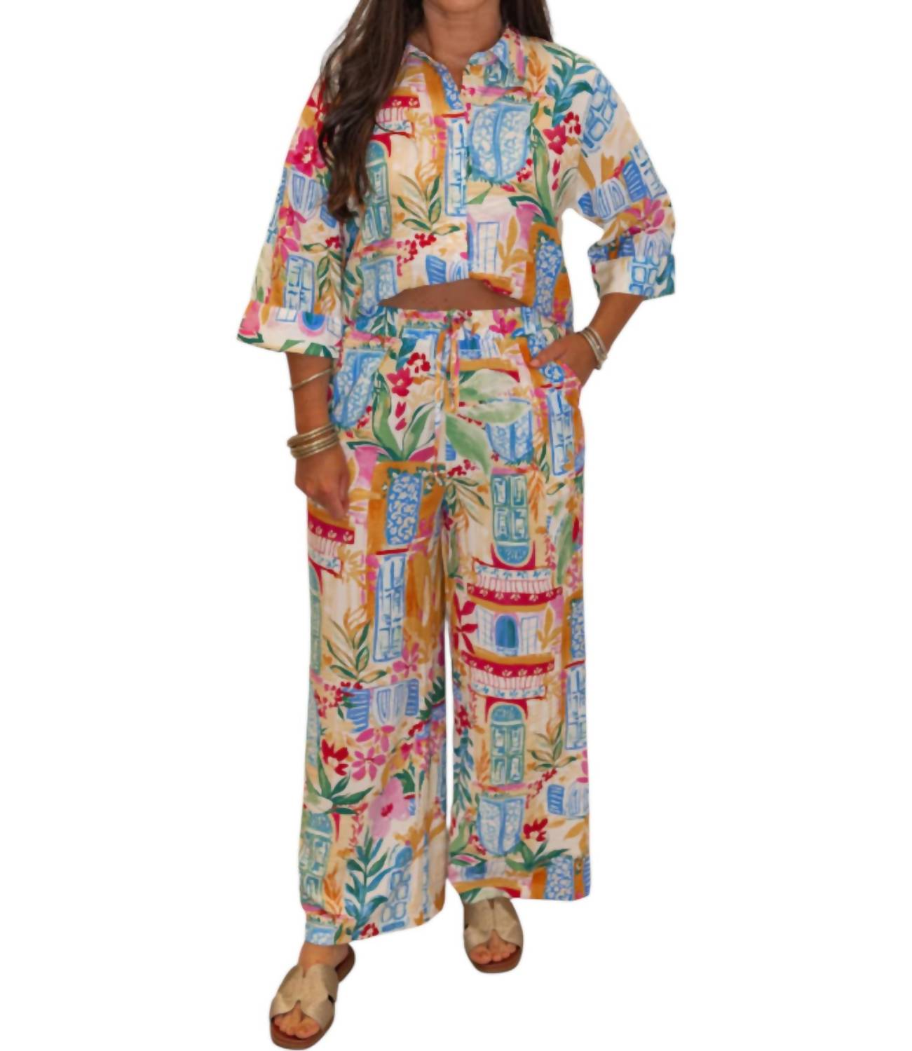 This button down shirt is comfortable yet polished. Perfect for injecting some color into your vacation closet. Featuring a button-down top with three-quarter sleeves and cuffed details. Includes wide-leg pants with a drawstring elastic waistband and convenient side pockets. Lightweight, crinkle fabric boasts a vibrant tropical print that's perfect for summer adventures. Crafted from 85% Rayon and 17% Nylon. Designed for a true-to-size fit. Top has a relaxed silhouette with a length of 21 1/2 inches, while the pants feature a rise of 13 inches and an inseam of 27 inches. Care for this non-sheer set by hand washing cold and line drying.