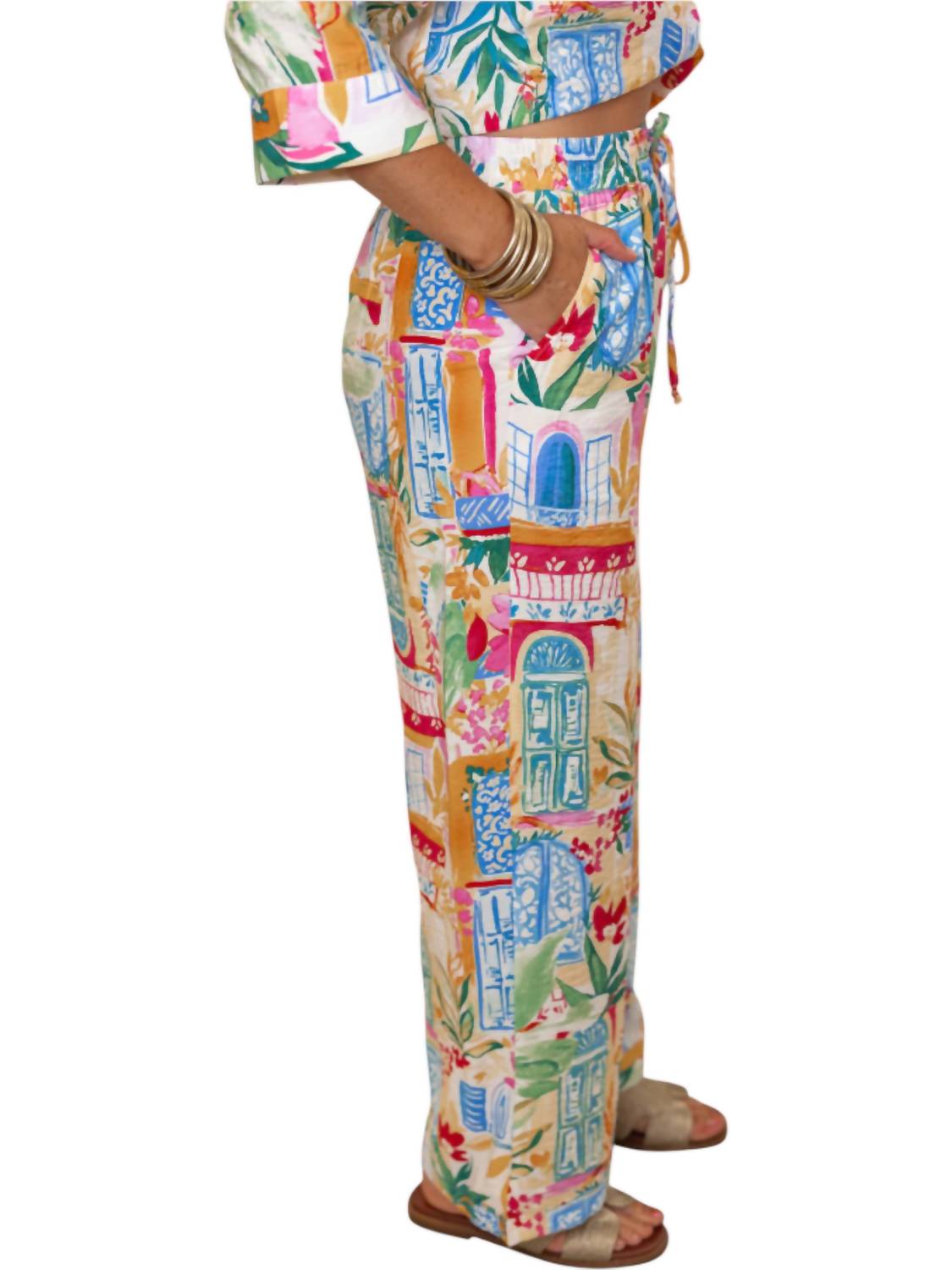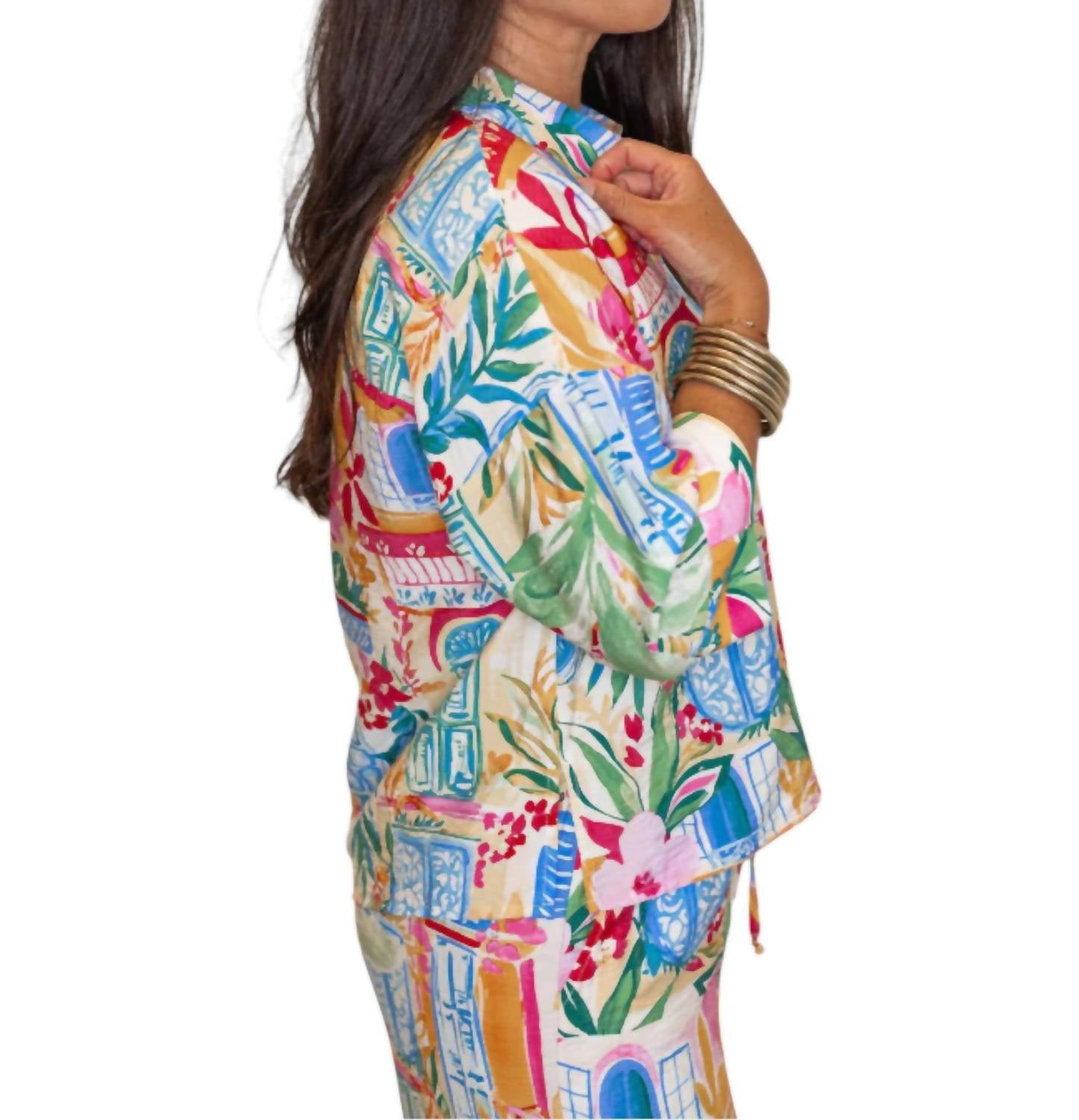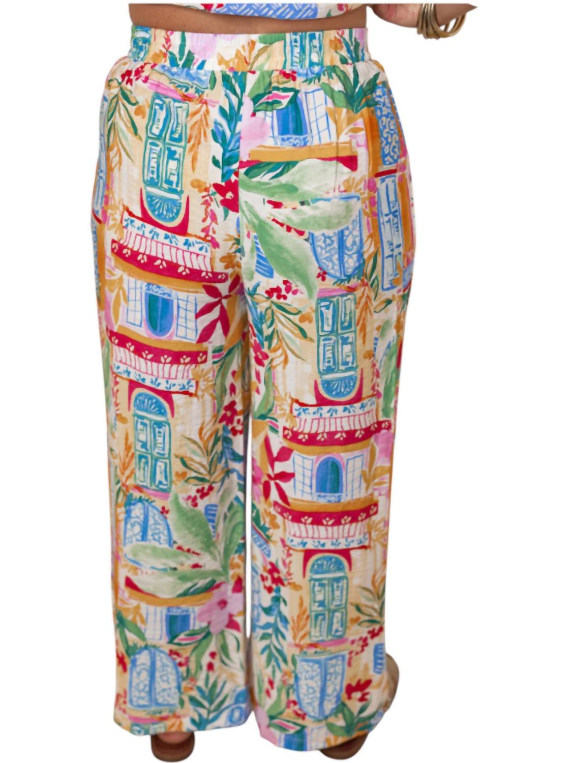 This button down shirt is comfortable yet polished. Perfect for injecting some color into your vacation closet. Featuring a button-down top with three-quarter sleeves and cuffed details. Includes wide-leg pants with a drawstring elastic waistband and convenient side pockets. Lightweight, crinkle fabric boasts a vibrant tropical print that's perfect for summer adventures. Crafted from 85% Rayon and 17% Nylon. Designed for a true-to-size fit. Top has a relaxed silhouette with a length of 21 1/2 inches, while the pants feature a rise of 13 inches and an inseam of 27 inches. Care for this non-sheer set by hand washing cold and line drying.