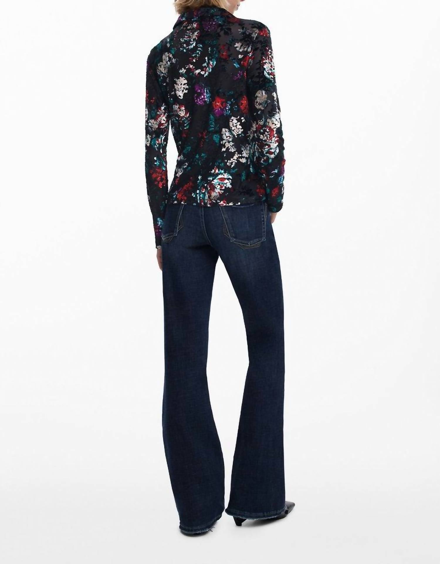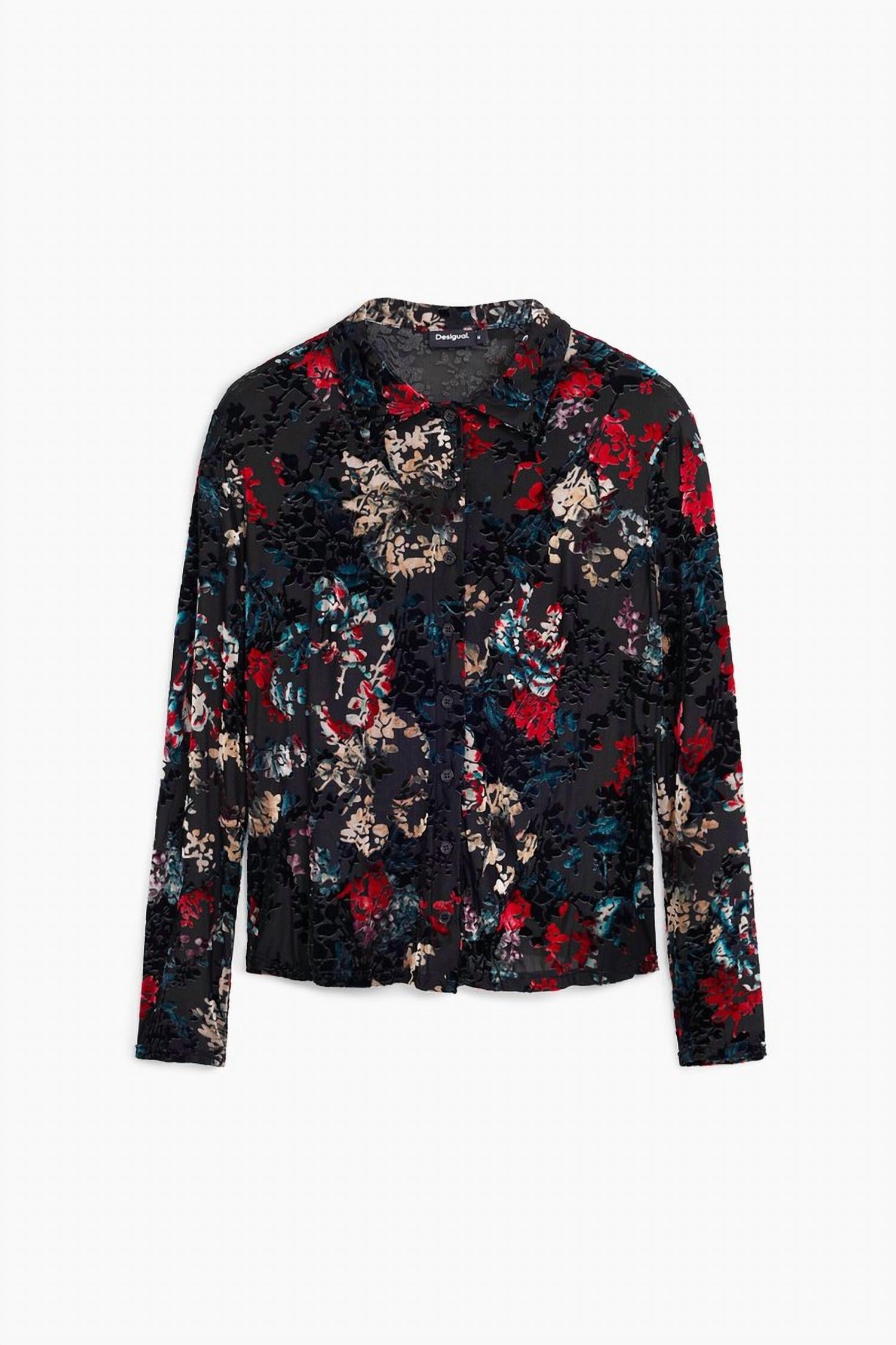 A classic button down shirt that will never go out of style. Elevate your wardrobe with the Desigual Button Up Velvet Burnout Blouse, a testament to bold style and intricate design. This long-sleeved mesh shirt showcases a shirt collar and features a luxurious velvet burnout floral pattern in black with vibrant red and green accents, offering a maximalist flair perfect for summer vacations or Mother's Day. Made from 47% polyester, 42% polyamide, and 11% elastane, this stylish blouse is crafted with a regular fit and secured with a front button closure. For optimal maintenance, a dry clean is recommended.