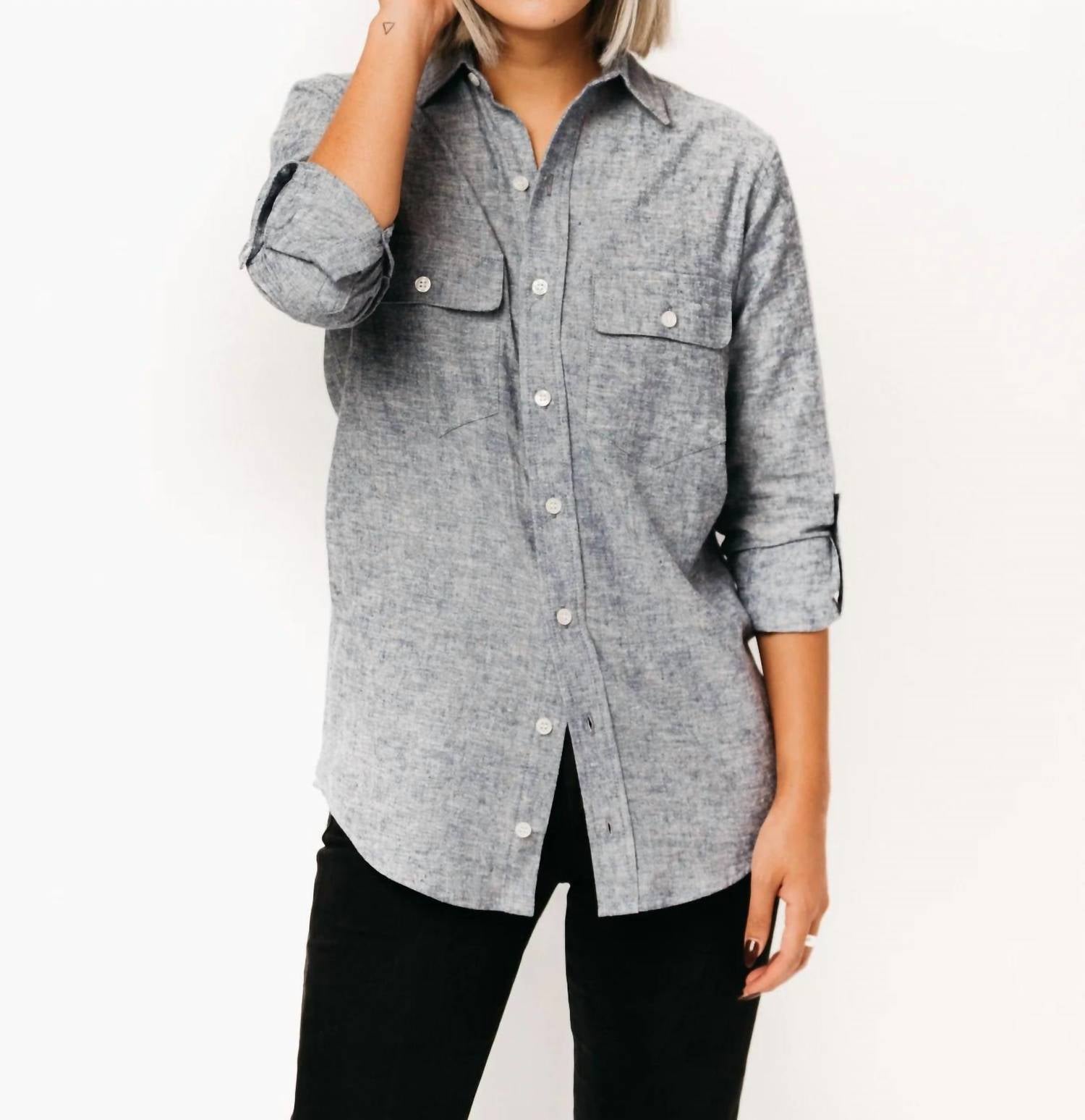 This button down shirt is comfortable yet polished. Discover the Emily Phillips Chambray Shirt, a beautifully textured piece in a serene blue hue, perfect for summer travel and workwear. This long sleeve design features a classic collar and button closure, enriched with practical pockets for added functionality. Crafted with 65% polyester, 35% cotton, this shirt is a versatile addition to any wardrobe. For care, simply hand wash and line dry to maintain its pristine quality.