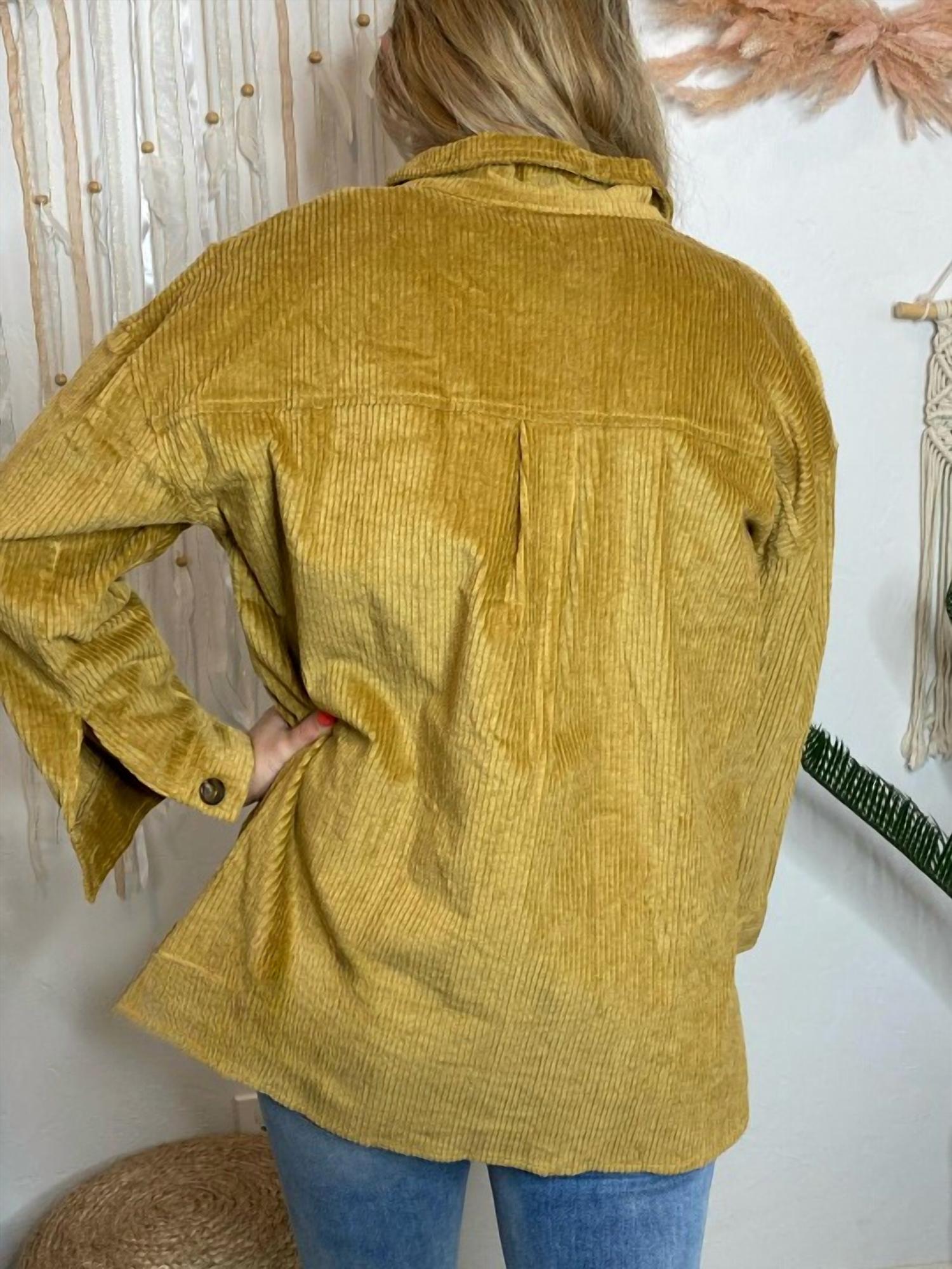 Perfectly tailored and soft to the touch. Introducing the Corduroy Shacket by Hayden LA, a stylish addition to your wardrobe in a rich mustard hue. This textured piece features long sleeves and a classic collar, adding a touch of sophistication to any look. Crafted from luxurious velvet corduroy, it combines comfort with a chic, button-up style. Closure: Button closure. Perfect for layering, this shacket is an effortless choice for everyday wear.
