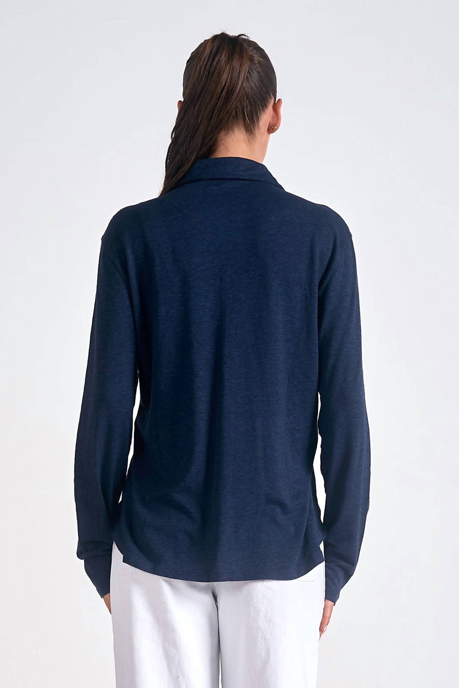 This button down shirt is comfortable yet polished. Elevate your vacation wardrobe with the Long Sleeve Button Down Top by ELAN, featuring a minimalist solid pattern in a chic navy hue. This women's shirt offers a sleek collar neckline and practical pocket details, crafted from a breathable blend of 50% Viscose and 50% Cotton. Closure is secured with classic button closures. Effortlessly styled for summer outings and beyond.