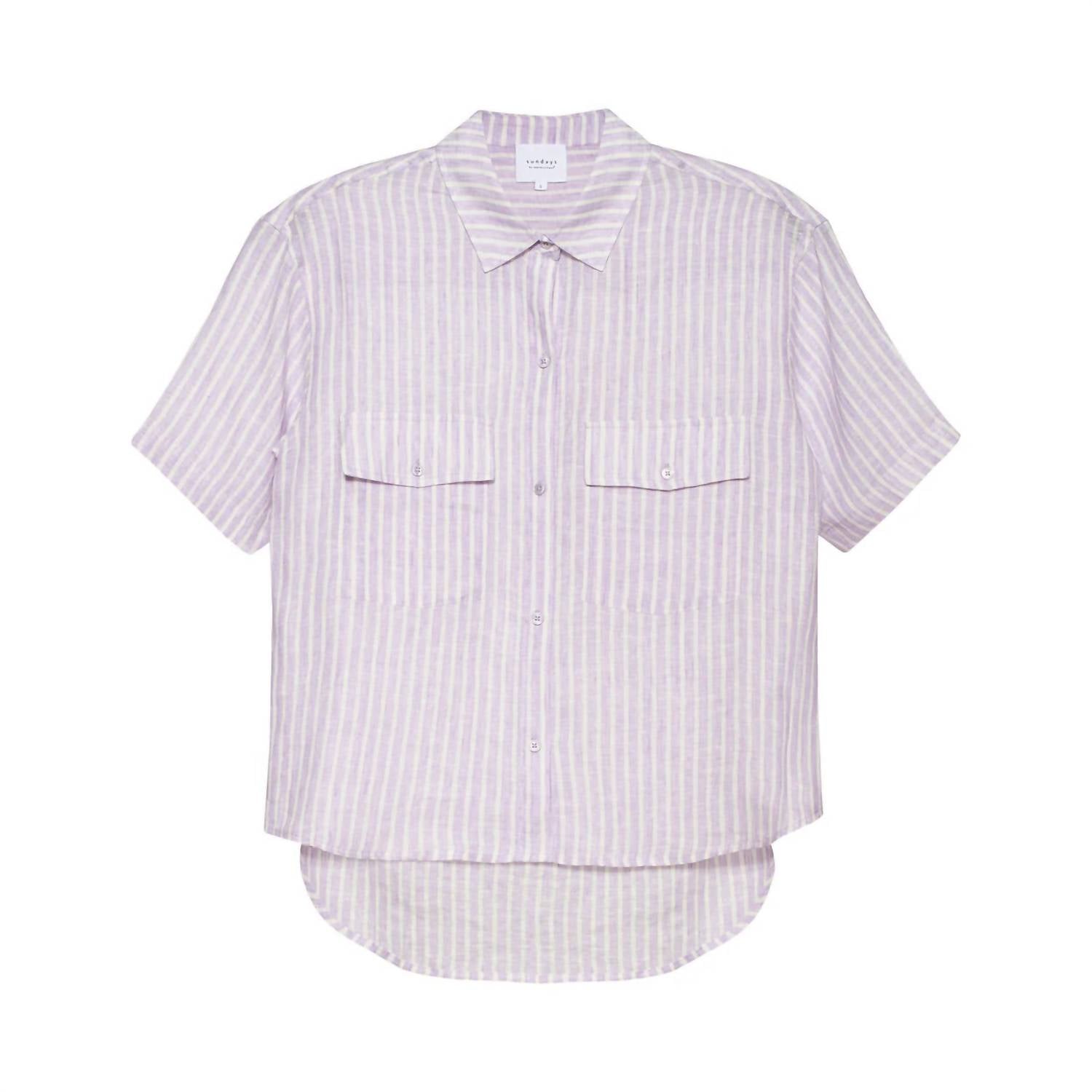 A classic button down shirt that will never go out of style. Introducing the Crosby Shirt by Sundays, a must-have for your vacation wardrobe with its short sleeves and chic lavender stripe pattern. Crafted entirely from luxurious linen, this shirt offers unparalleled breathability and comfort for summer days. Featuring a classic collar and practical pockets, it combines style and functionality effortlessly. Closure: Button closure. Perfect for embracing the best of 90s fashion.
