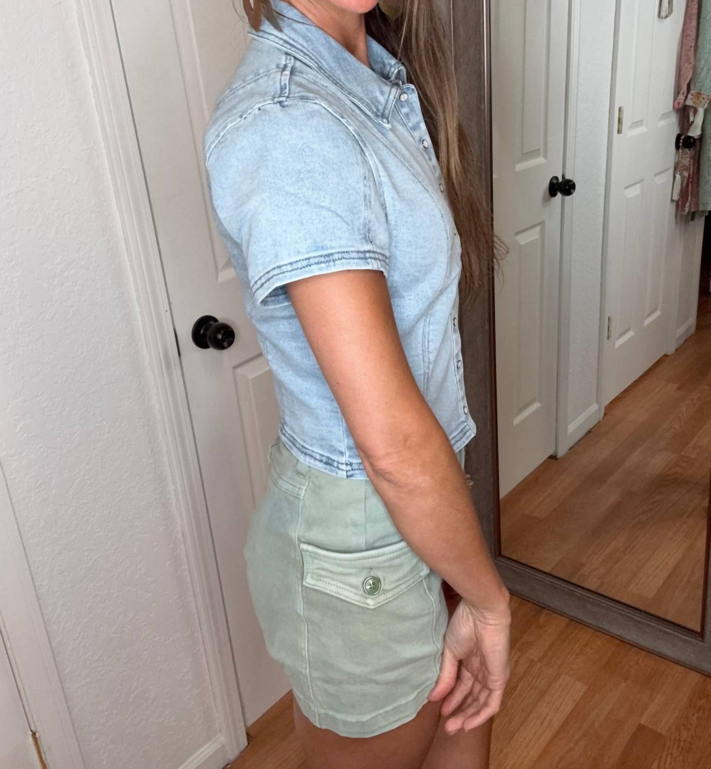 This button down shirt is comfortable yet polished. Discover the Lyra Cropped Denim Short Sleeve Top by RISEN, a minimalist essential in a chic blue hue. This short sleeve shirt features a classic button-down and collar design, crafted from a blend of 93% cotton, 6% polyester, and 1% spandex for a versatile fit. Its garment length is 20 1/4 inches, with a chest measurement of 34 inches for size S, offering a flattering silhouette. Closure: Button closure. Care: Machine wash, tumble dry.