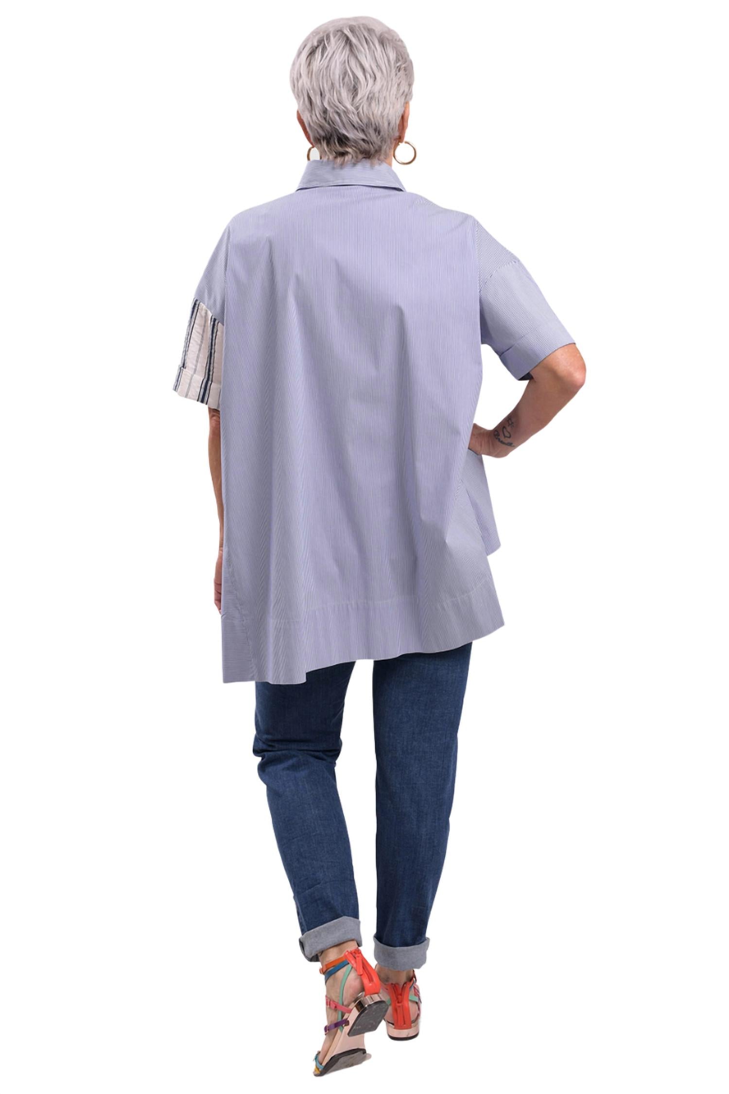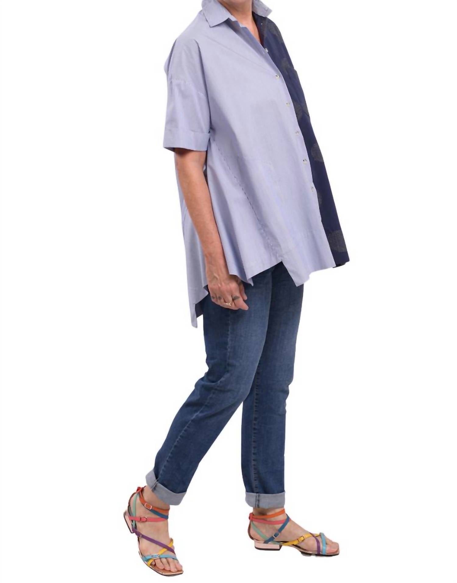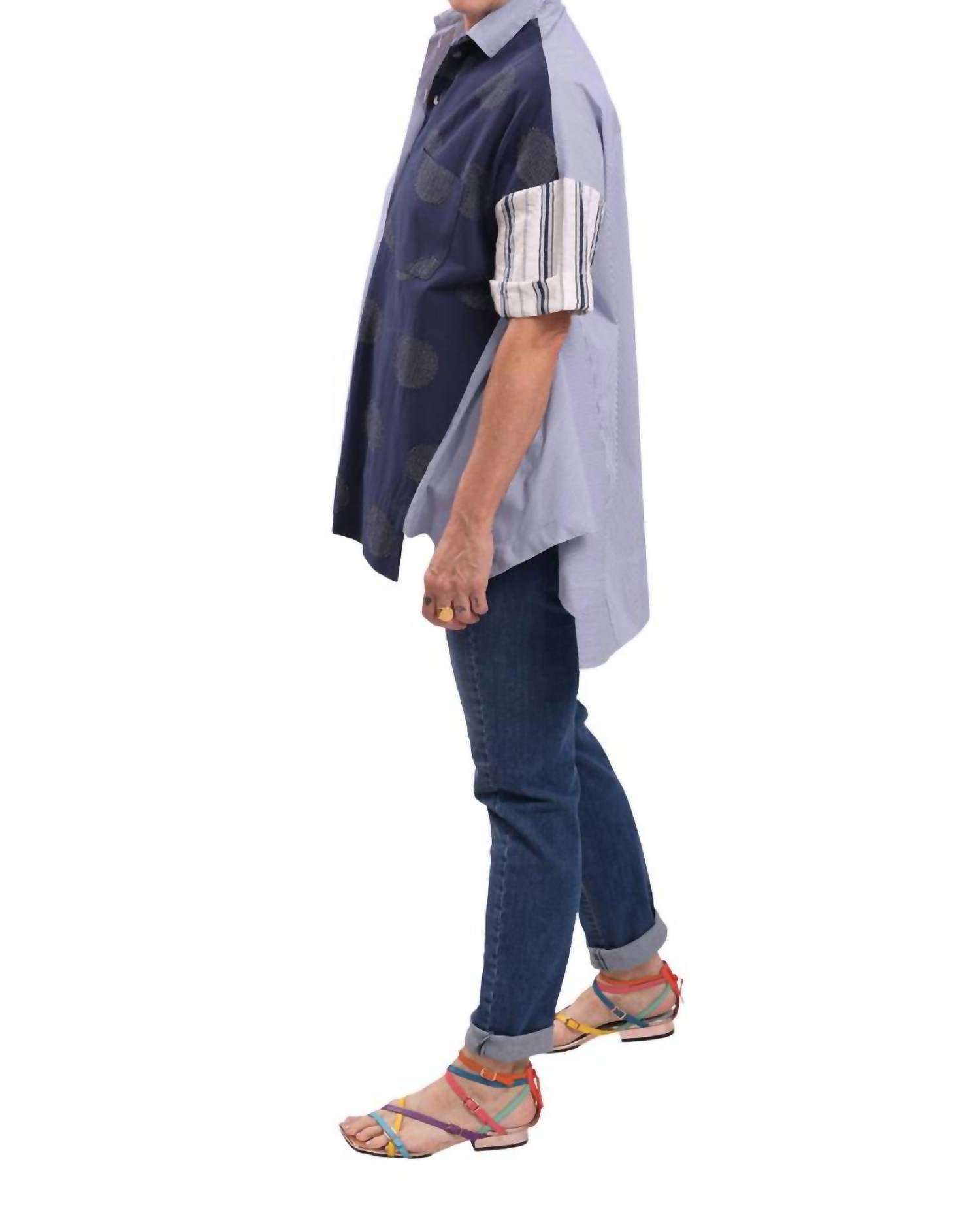 A classic button down shirt that will never go out of style. Meet the Tao Trapeze Shirt by ALEMBIKA, a perfect blend of stripes and embroidered linear dots that elevate your workwear wardrobe. This navy button-down shirt features short sleeves and an A-line silhouette with a notched hi-lo hem for easy movement. Composed of 78% cotton, 15% viscose, 15% nylon, and 2% elastane, it is designed and made in Israel. Closure: Button closure. Care: Machine wash, line dry. With its spread collar and chest pocket, it's a chic option for the modern woman.