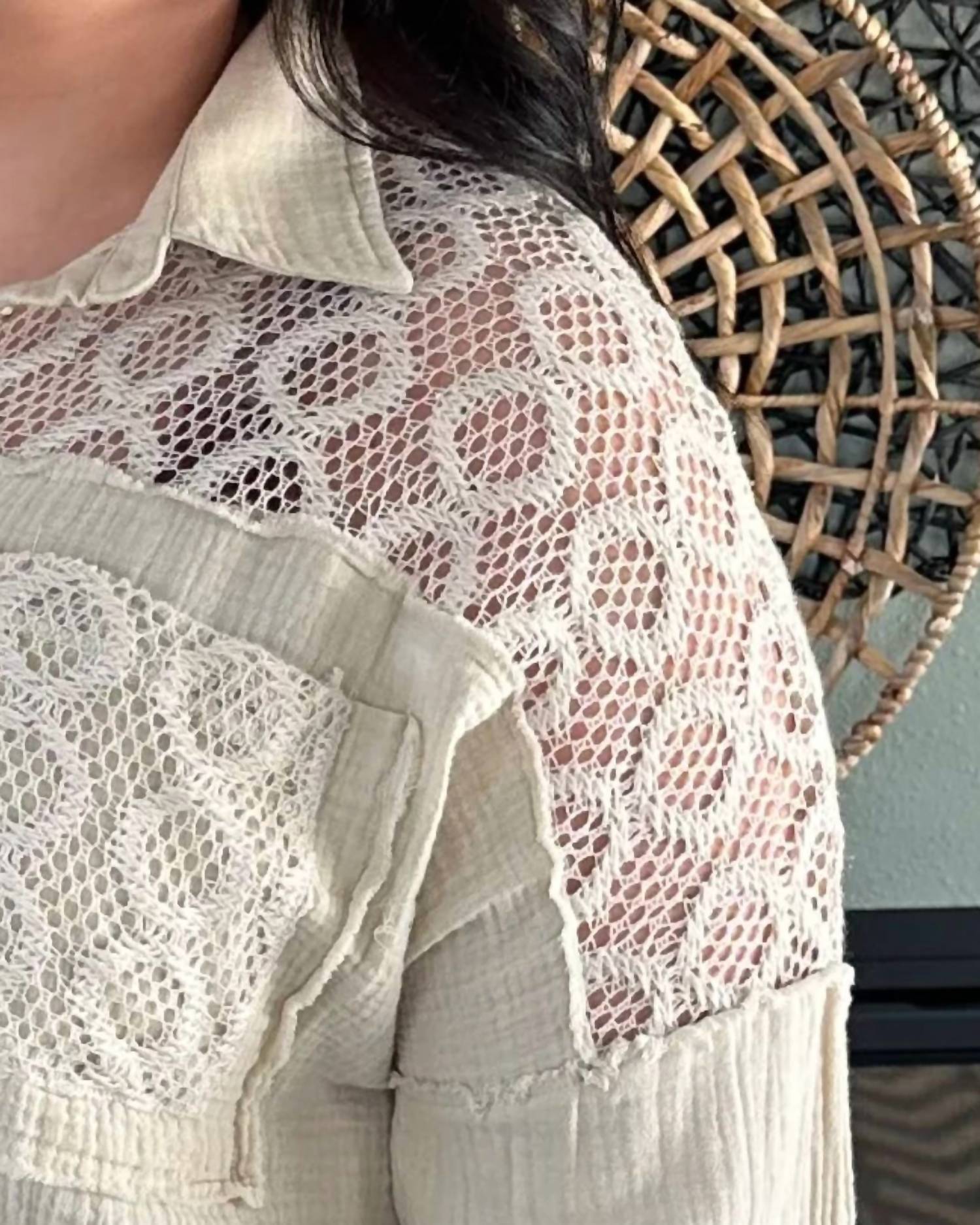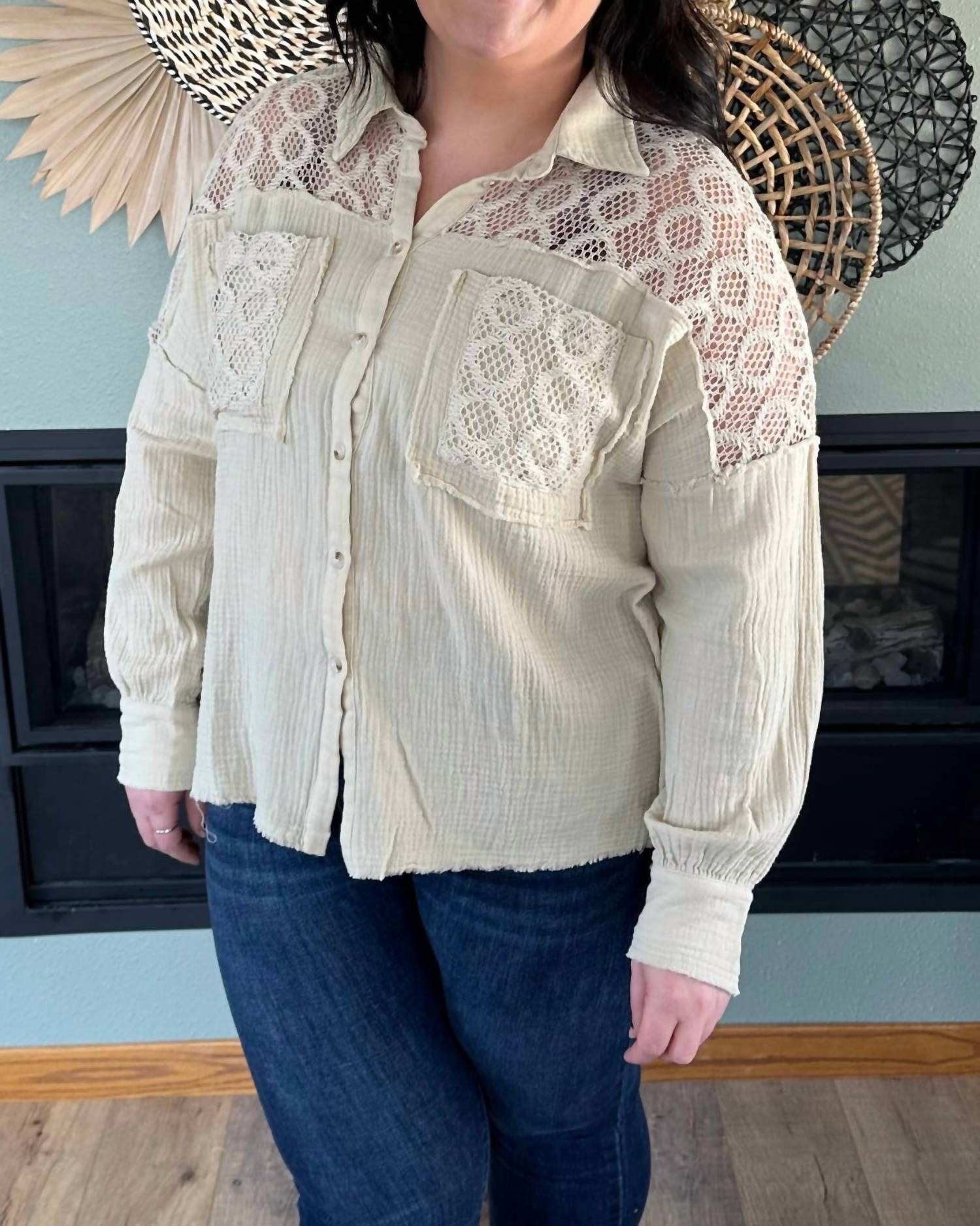 This button down shirt is comfortable yet polished. Introducing the Mallory Top by Andree By Unit, a beige button-down shirt perfect for plus-size women seeking minimalist summer style. This textured top features long sleeves and a practical collar for a polished look. With the convenience of pockets and a classic button closure, it is both functional and chic. Designed for occasions like church or Mother's Day, this piece pairs well with various ensembles.