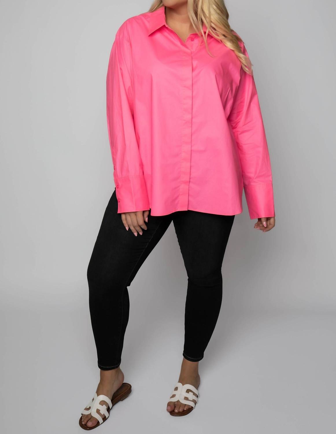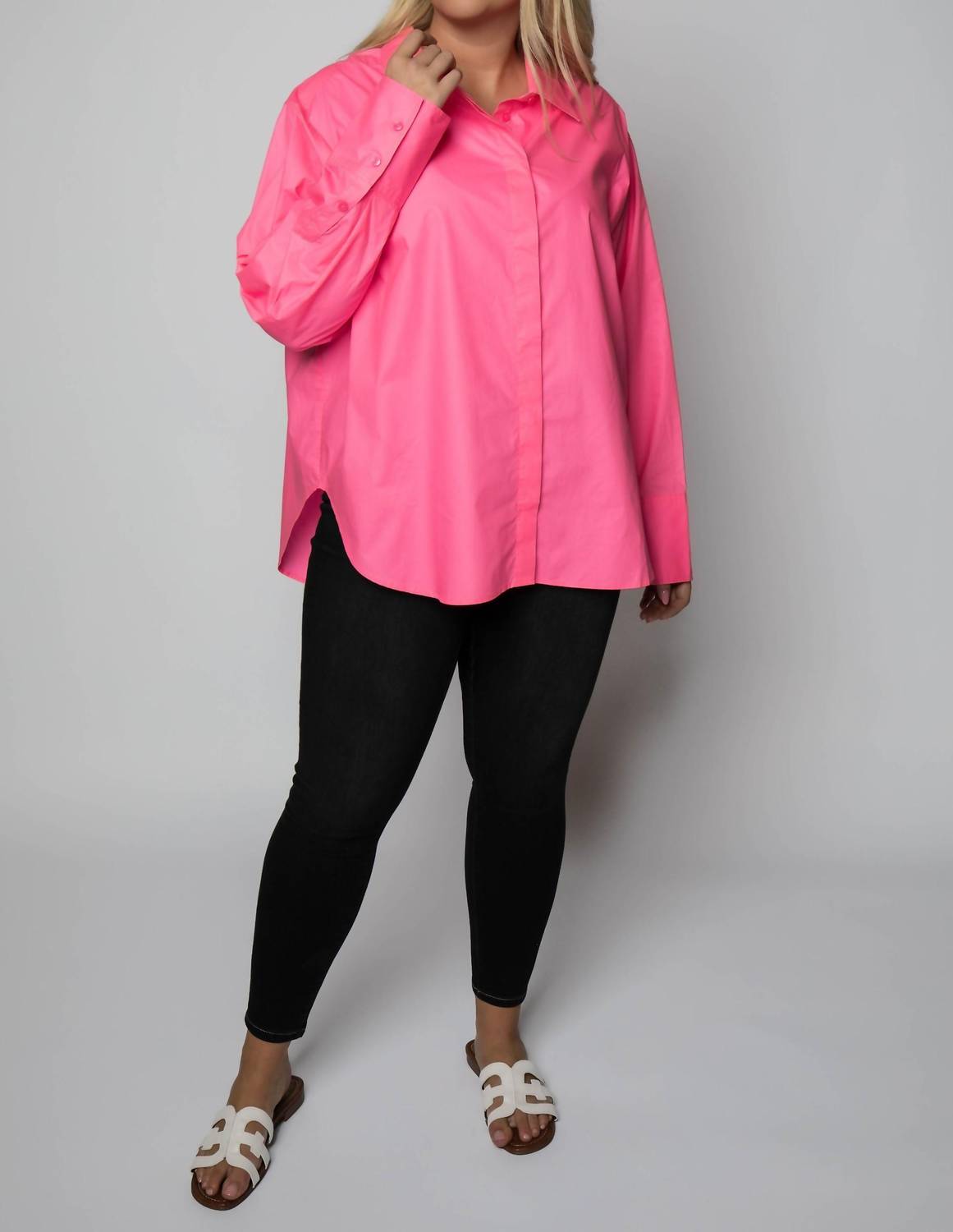 Perfectly tailored and soft to the touch. Step into sophistication with the Coated Poplin Weekend Shirt by Good American in a striking Knockout Pink. This long sleeve, slightly oversized button-up shirt is crafted from comfortable and breathable cotton, perfect for both formal events and casual nights out. Designed with a classic collar and finished with a button closure, its sleek design offers a touch of elegance to any outfit. Care for this wardrobe essential by hand washing to maintain its pristine condition.