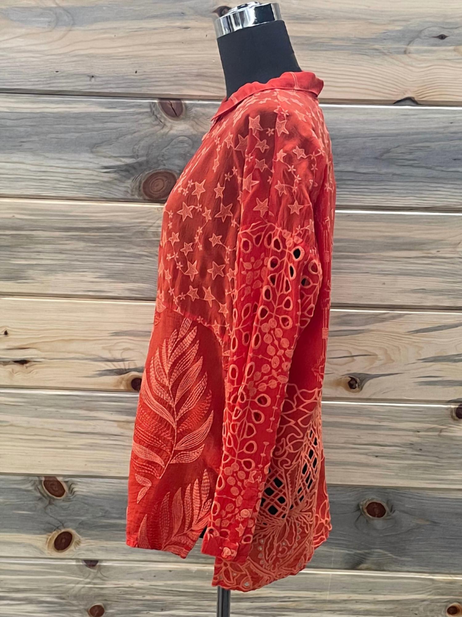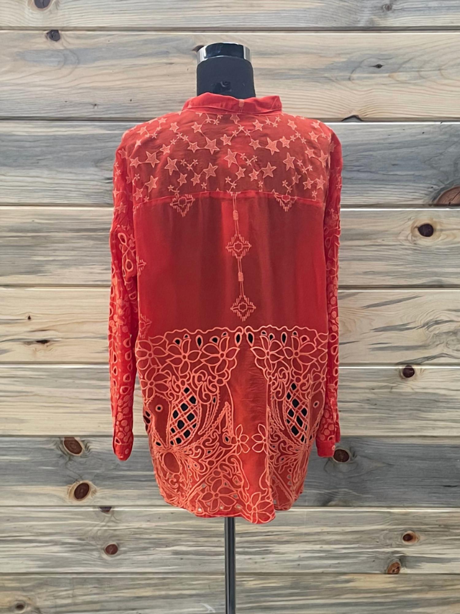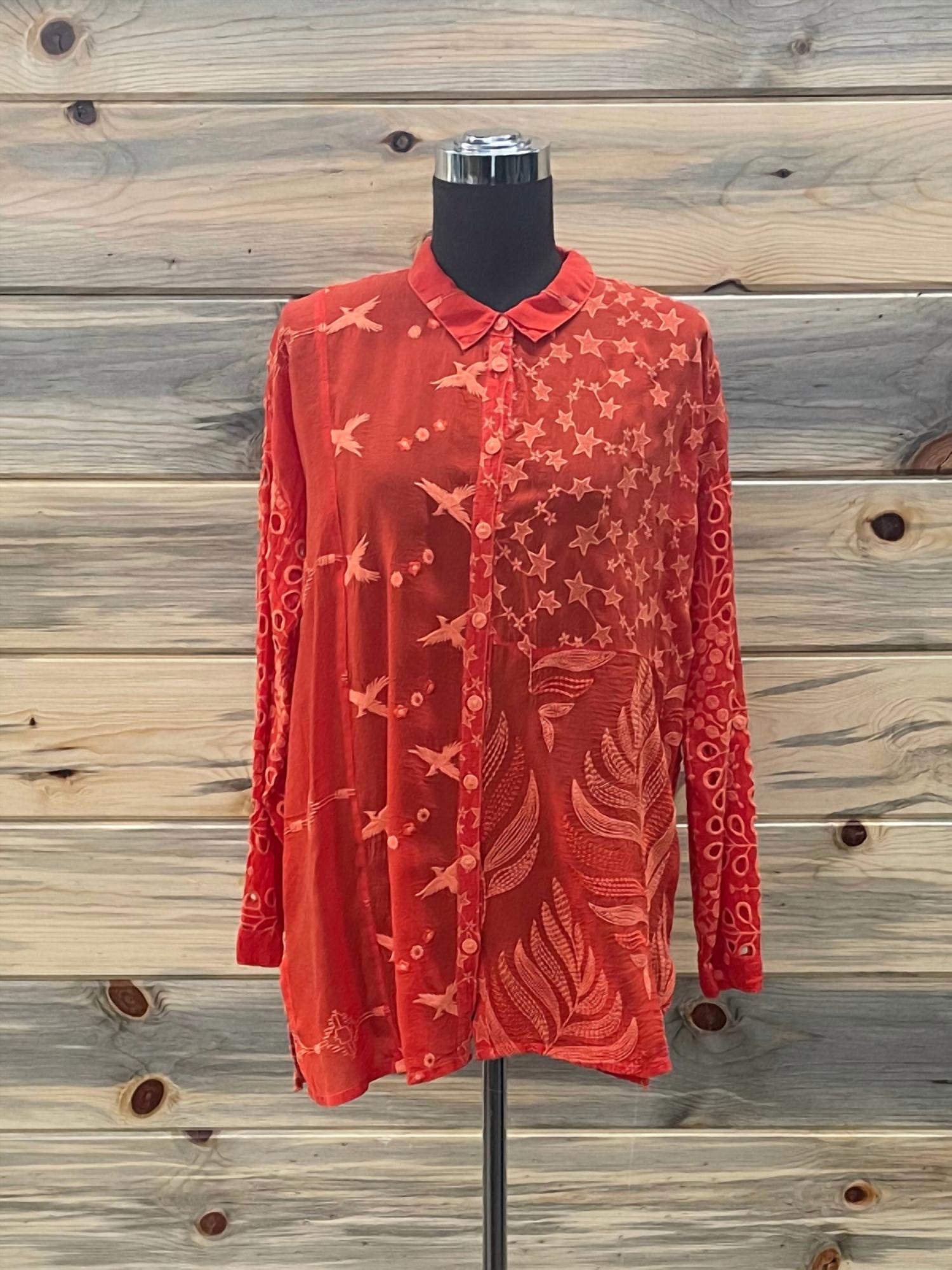 A versatile choice for daily activities, this button up is made from comfortable rayon and boasts a collar, long sleeves, a complementing mix of subtle patterns, and a standout embroidered design along the sleeves. Keep it simple by pairing with jeans or dress up with tailored pants and heels. Product Details: 100% Rayon. Embroidery. Thread Covered Buttons. Model Height: 5'11.5". Model is wearing a size Small. Measurements for Size Medium: Length- 28 3/4", Bust- 47 1/2". Care instructions: Machine wash cold only. Non chlorine bleach when needed. Tumble dry low. Warm iron.