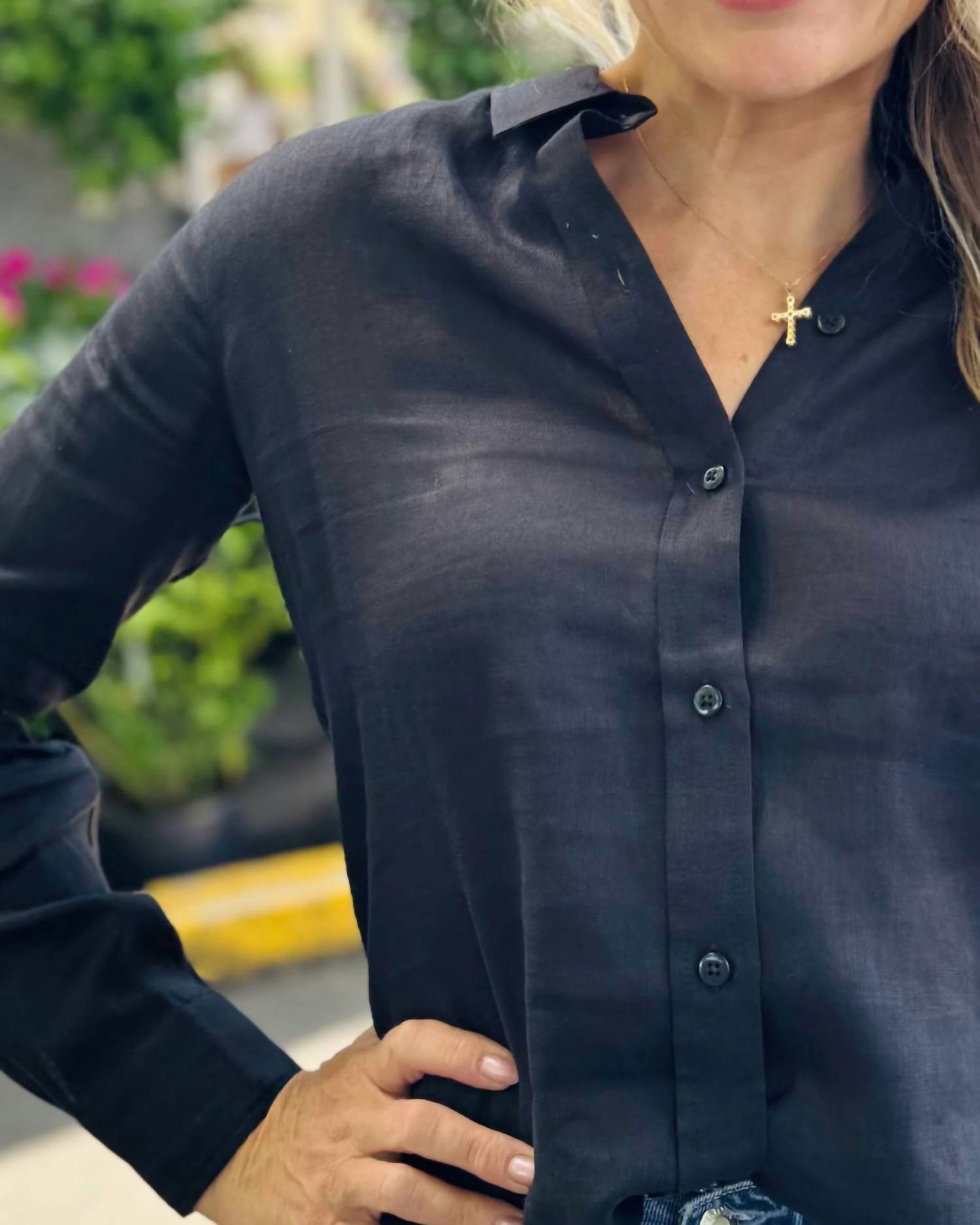 This button down shirt is comfortable yet polished. The Pure Button Down Shirt by Pure Amici is a sophisticated piece crafted from 100% Linen, perfect for both workwear and cocktail parties. Designed with long sleeves and a button closure, this black shirt features a traditional straight collar and a hemline that falls below the hip for optimal coverage. Its solid pattern and timeless silhouette make it a staple for your fall wardrobe. Care instructions include machine wash cold for easy maintenance.