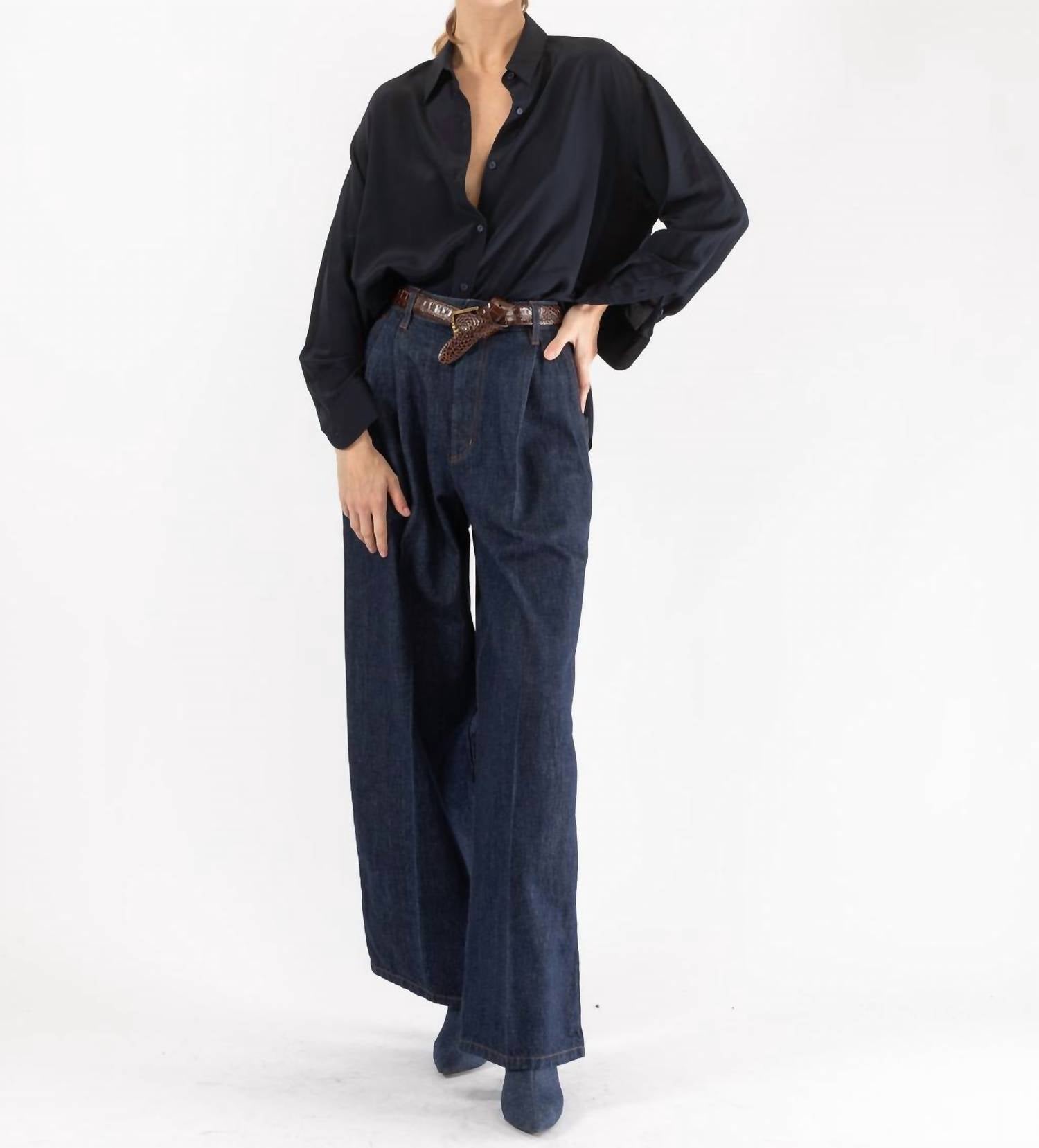 Oversized shirt with front button closure, rounded hem, relaxed spread collar, shirred back yoke; dry clean. Runs Large. Dry Clean Only. 100% Silk.