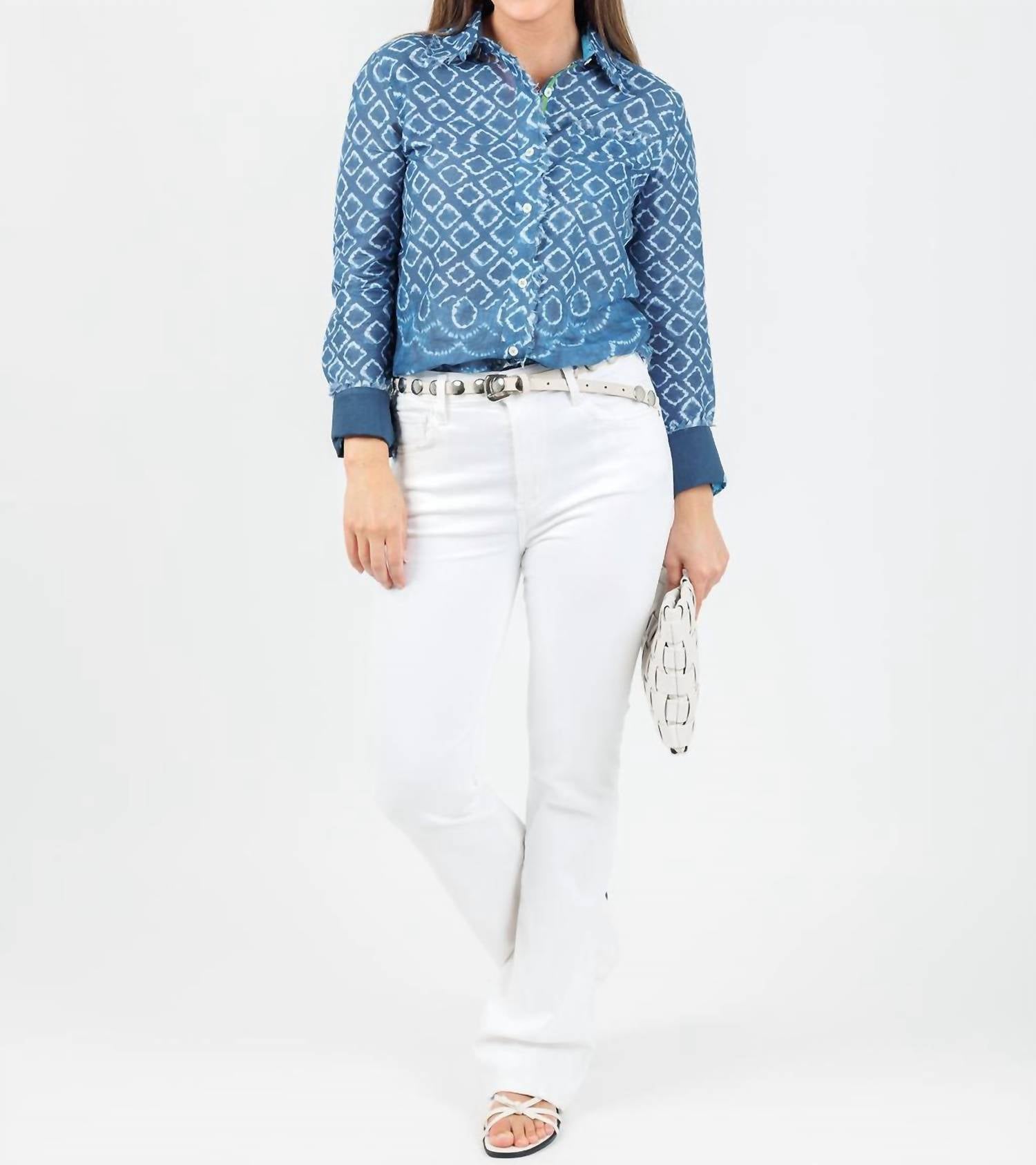 A classic button down shirt that will never go out of style. Elevate your wardrobe with the Women's Cape Cod Frayed Shirt by Dizzy-Lizzie in a Navy White Ikat Print. Crafted from 100% cotton, this long-sleeve button-down offers a perfect fusion of style and comfort. Featuring a collared neckline, chest patch pocket, and frayed trim, it's ideal for versatile occasions, from beach days to nights out. Make a fashion statement with this patterned gem that suits both casual and stylish attire. Model wears a size S: 5'6" height, 34" bust, 28.5" waist, 31" hip.