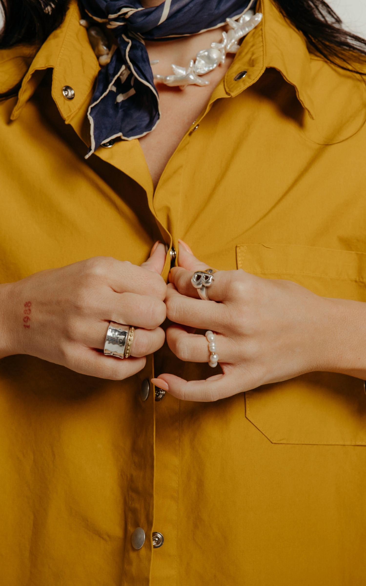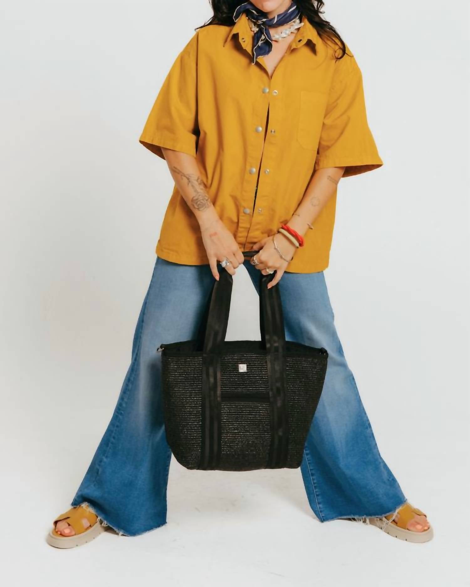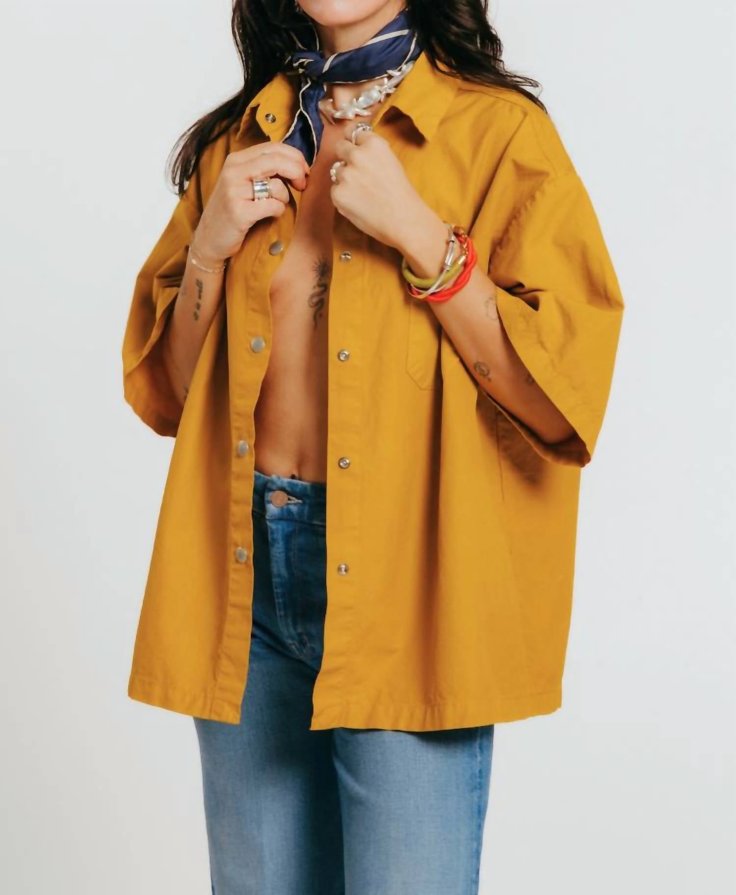 This button down shirt is comfortable yet polished. Presenting the Oversized Work Shirt by PRAIRIE UNDERGROUND in a rich Dijon hue, designed to offer a classic oversized silhouette with its short sleeves and balanced collar. Crafted from 100% cotton, this shirt is proudly made in Seattle, U.S.A. The design is completed with functional front snap closures for easy wear. Perfect for pairing with narrow trousers or wide-leg denim, Kassondra wears a size S (5’9” height, 27” waist, 37” hips).