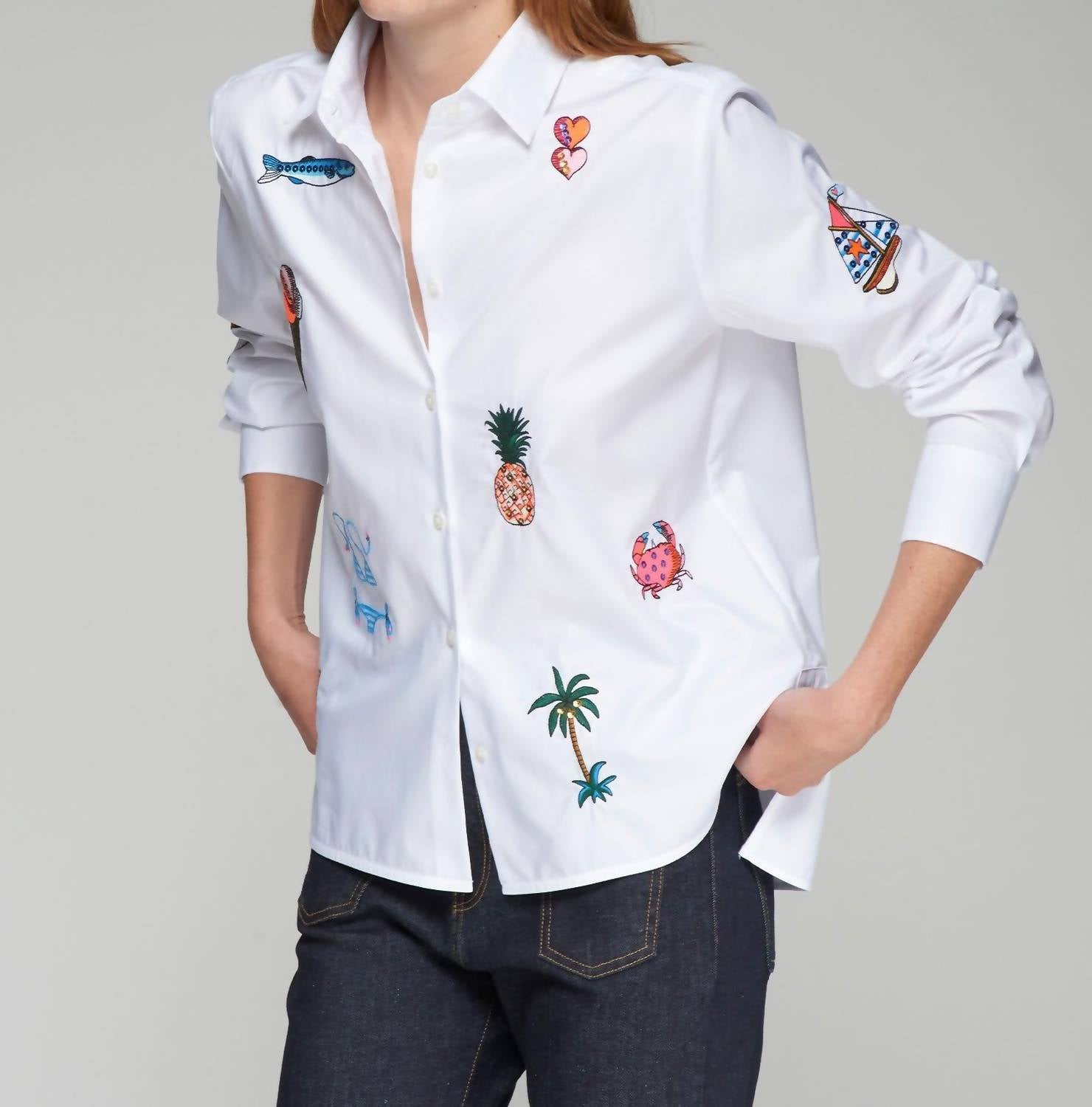 A classic button down shirt that will never go out of style. Discover the Isa Long Sleeve Shirt by Vilagallo, a vibrant addition to your wardrobe with its striking Motivos Marinos print. Crafted from 100% cotton, this collared shirt features a playful seashell pattern that stands out against a crisp white background. It has long sleeves with cuffs and a classic button closure for a polished finish. Ideal for a boho chic summer look, it requires hand washing and line drying to maintain its vibrant colors. The model is wearing size EU 38 / US 4.