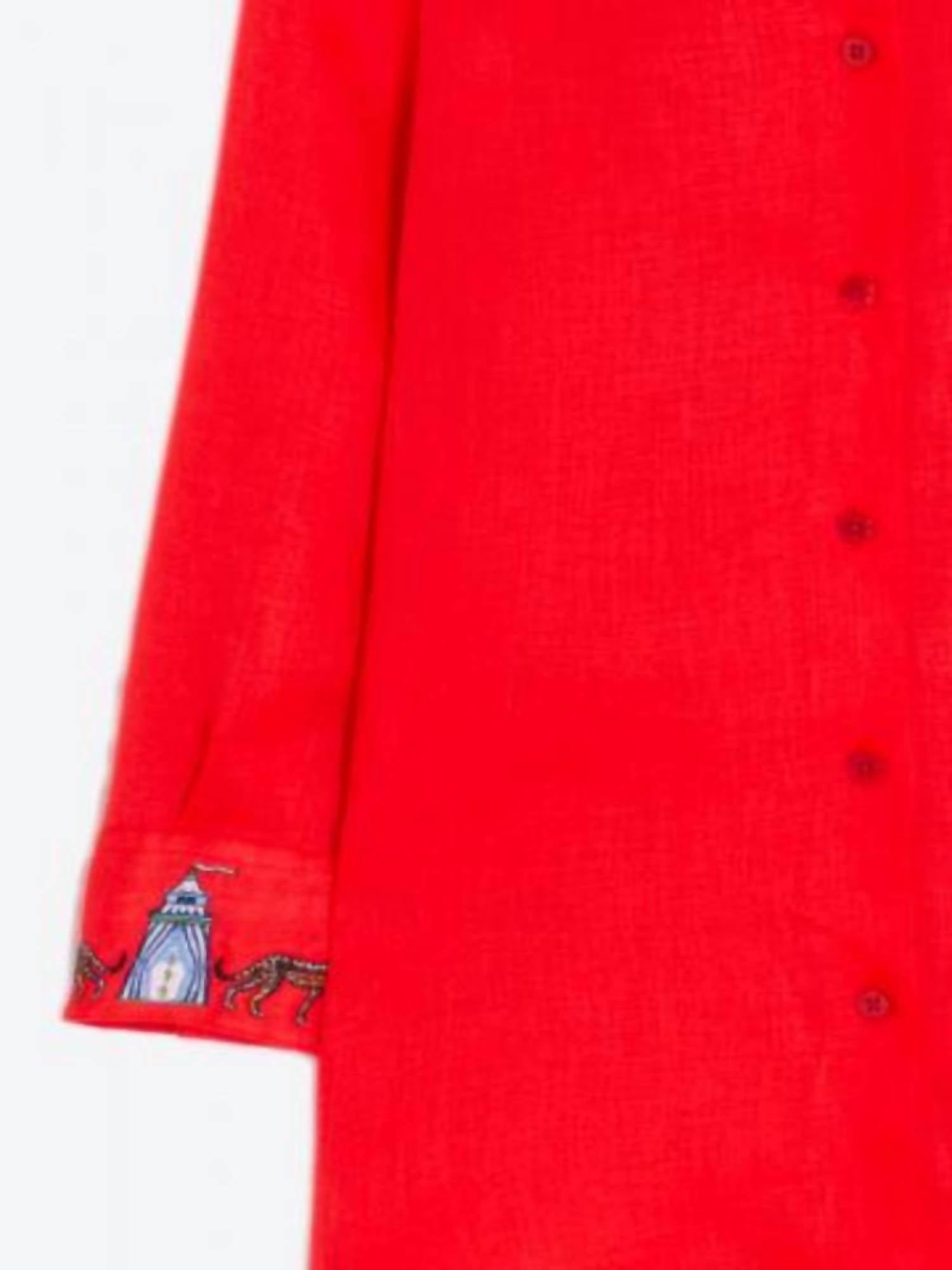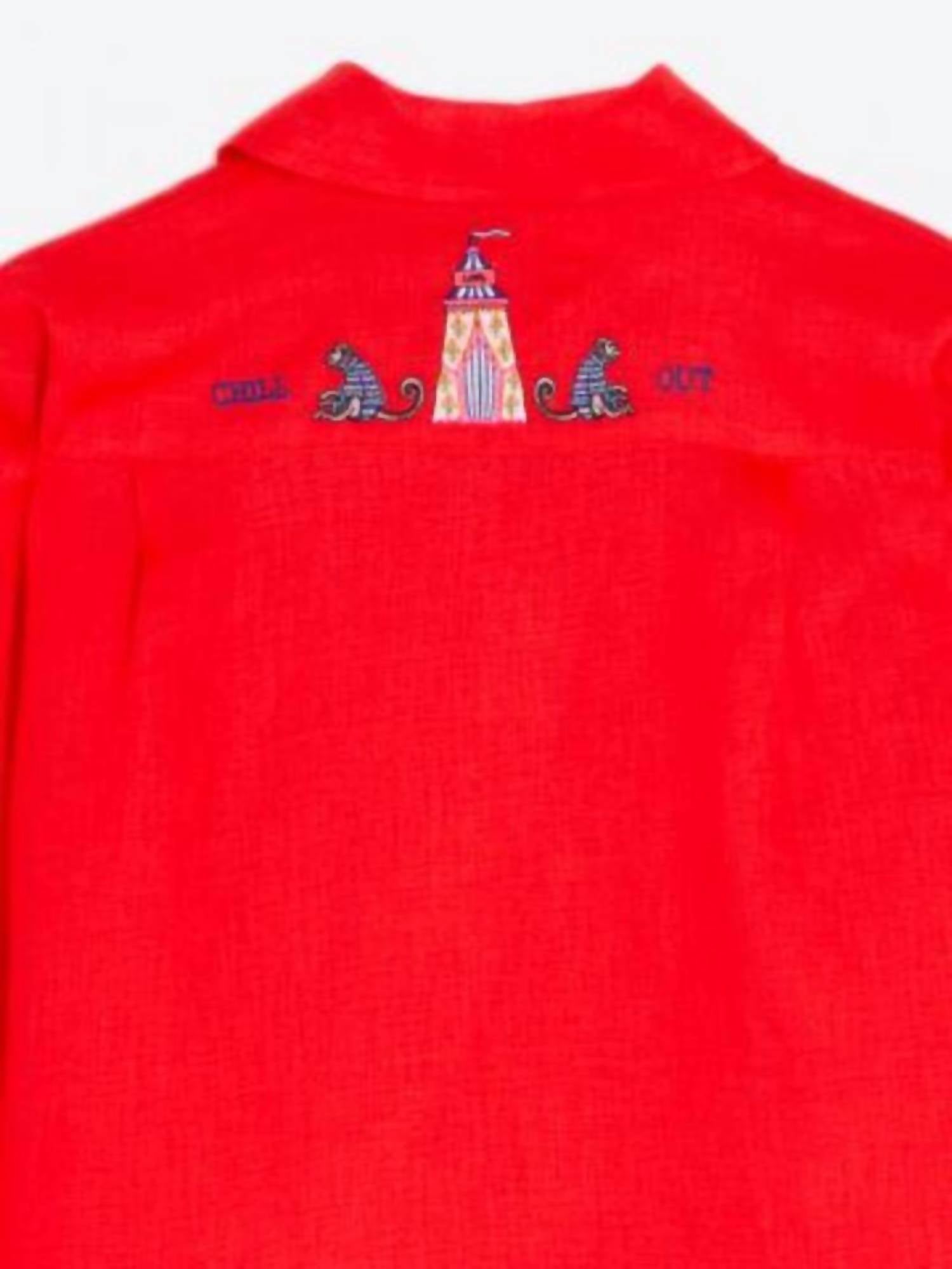 A classic button down shirt that will never go out of style. Elevate your wardrobe with the Vilagallo Women's Blanca Embroidered Shirt in coral, a perfect blend of playful charm and classic elegance. Featuring long sleeves and crafted from 100% linen, this piece showcases "Chill Out" embroidery for a unique patterned look. Closure is via a button closure, offering convenience and style. Care for this shirt by hand washing to maintain its vibrant hue and soft texture.