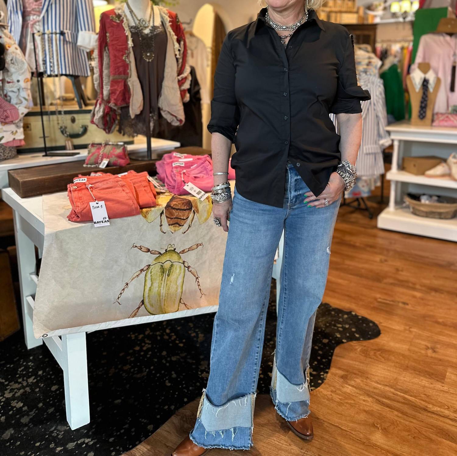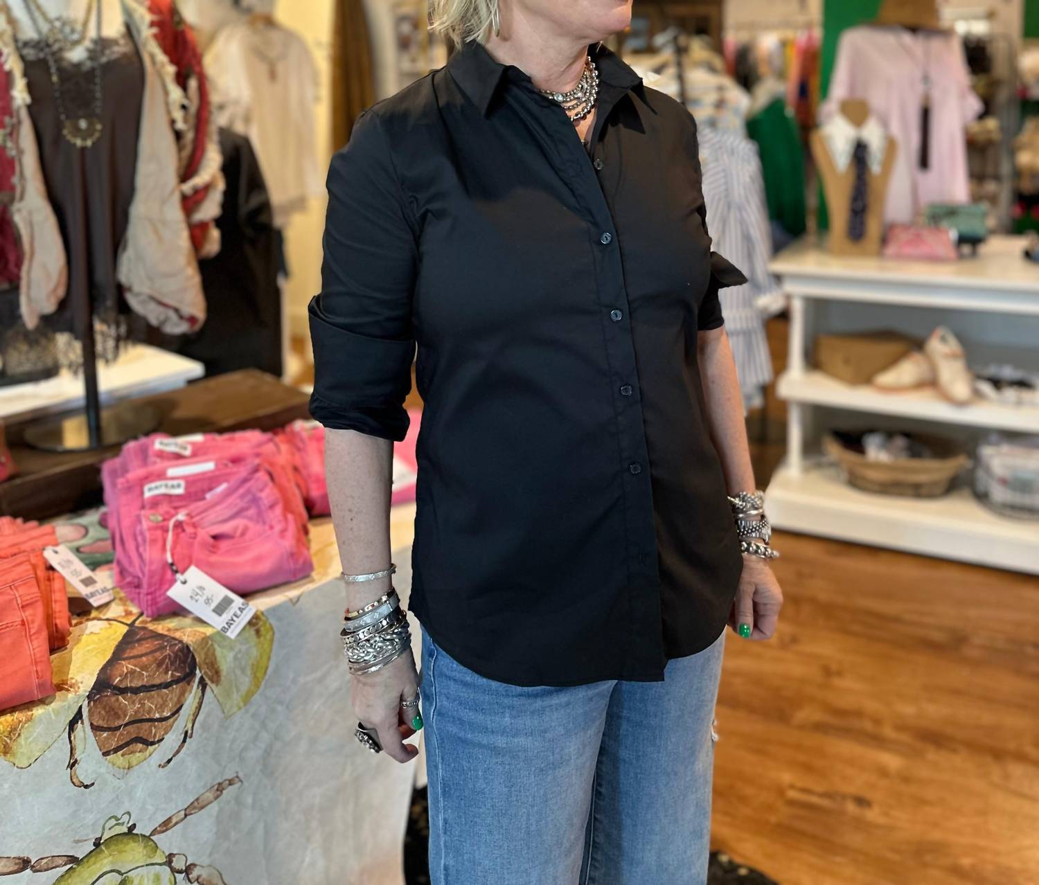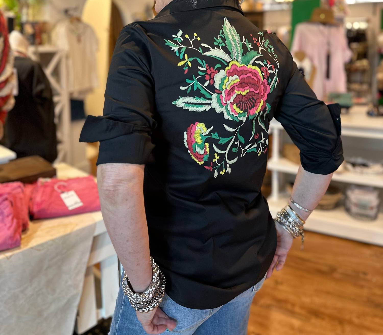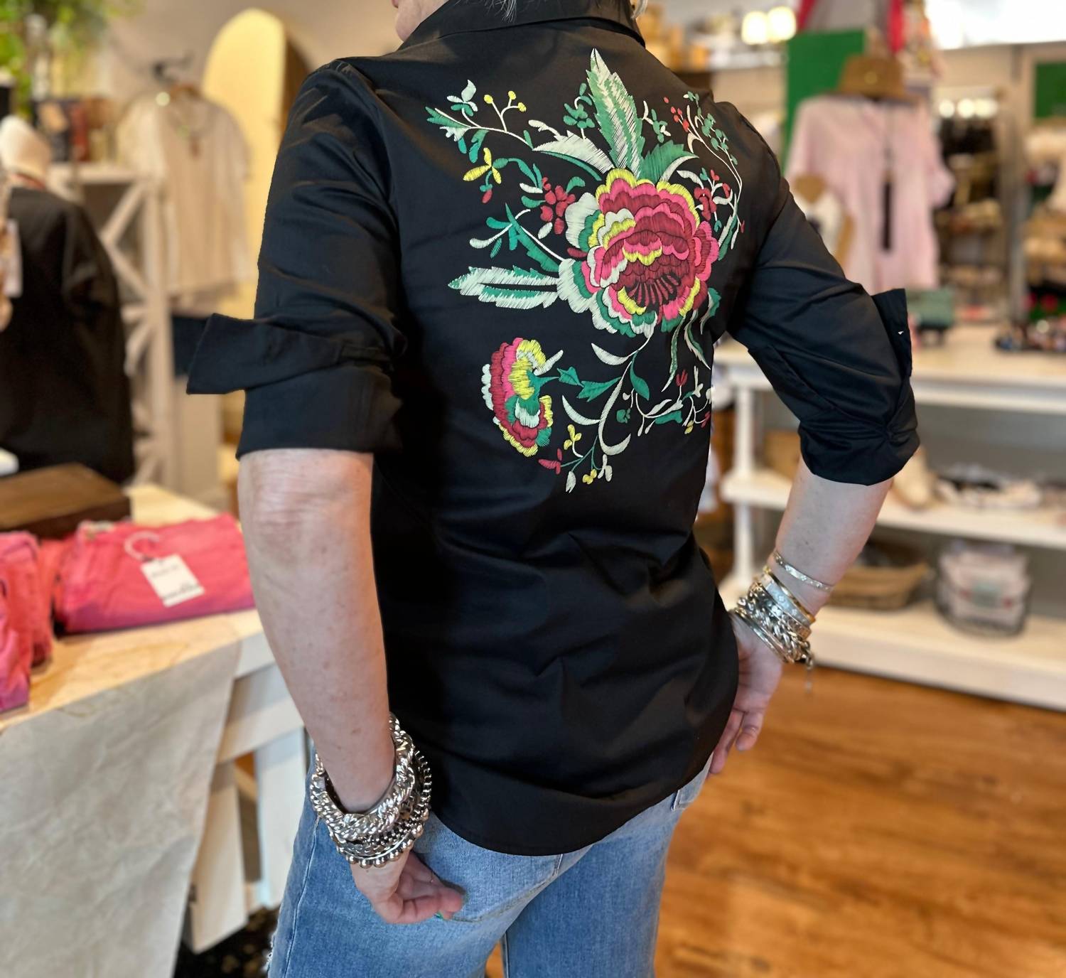 Perfectly tailored and soft to the touch. Introducing the Johnny Be Good Button-Up Top by Ravel, a chic choice for those who want to stand out with subtle sophistication. This women's shirt boasts long sleeves and a striking floral pattern on a black base, accented by a classic collared neckline. Crafted from 97% cotton and 3% spandex, it promises comfort and a slight stretch. The button closure and ease of care with machine wash and tumble dry instructions add practicality to its style.