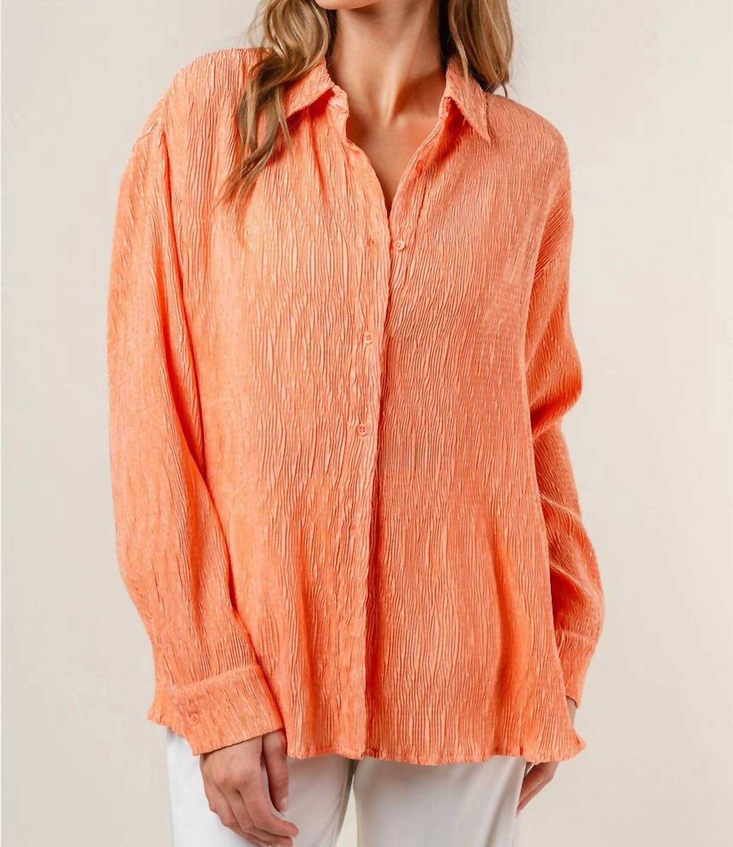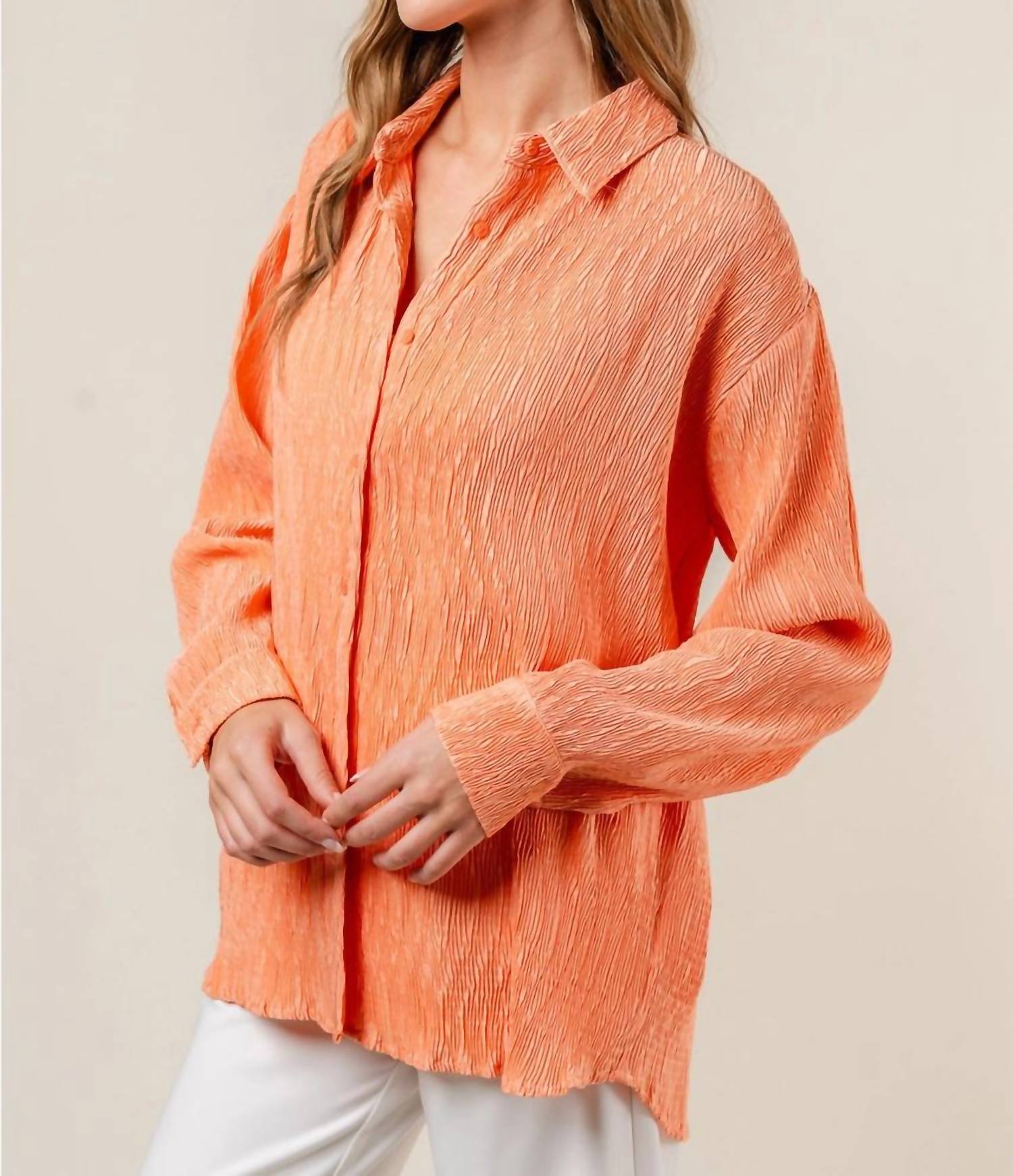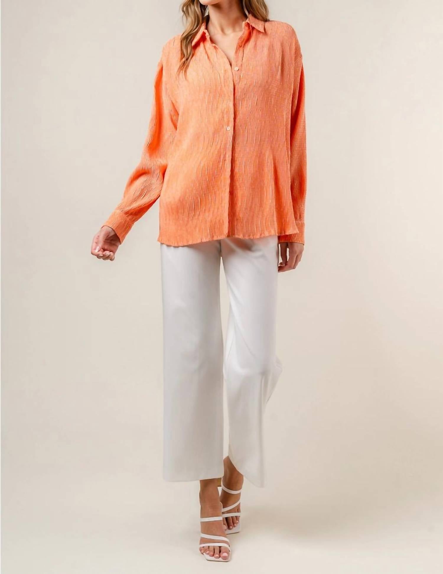 This button down shirt is comfortable yet polished. Introducing the Joey Top by Fore, a striking addition to your workwear wardrobe in vibrant orange. This women's long sleeve button-down shirt is crafted from 100% polyester and designed with a textured pattern for an engaging look. The shirt features a classic collar neckline and is made in China, ensuring quality and style. Closure is simple with button fastening, and it requires hand washing for care. Perfect for your summer holiday party occasions.