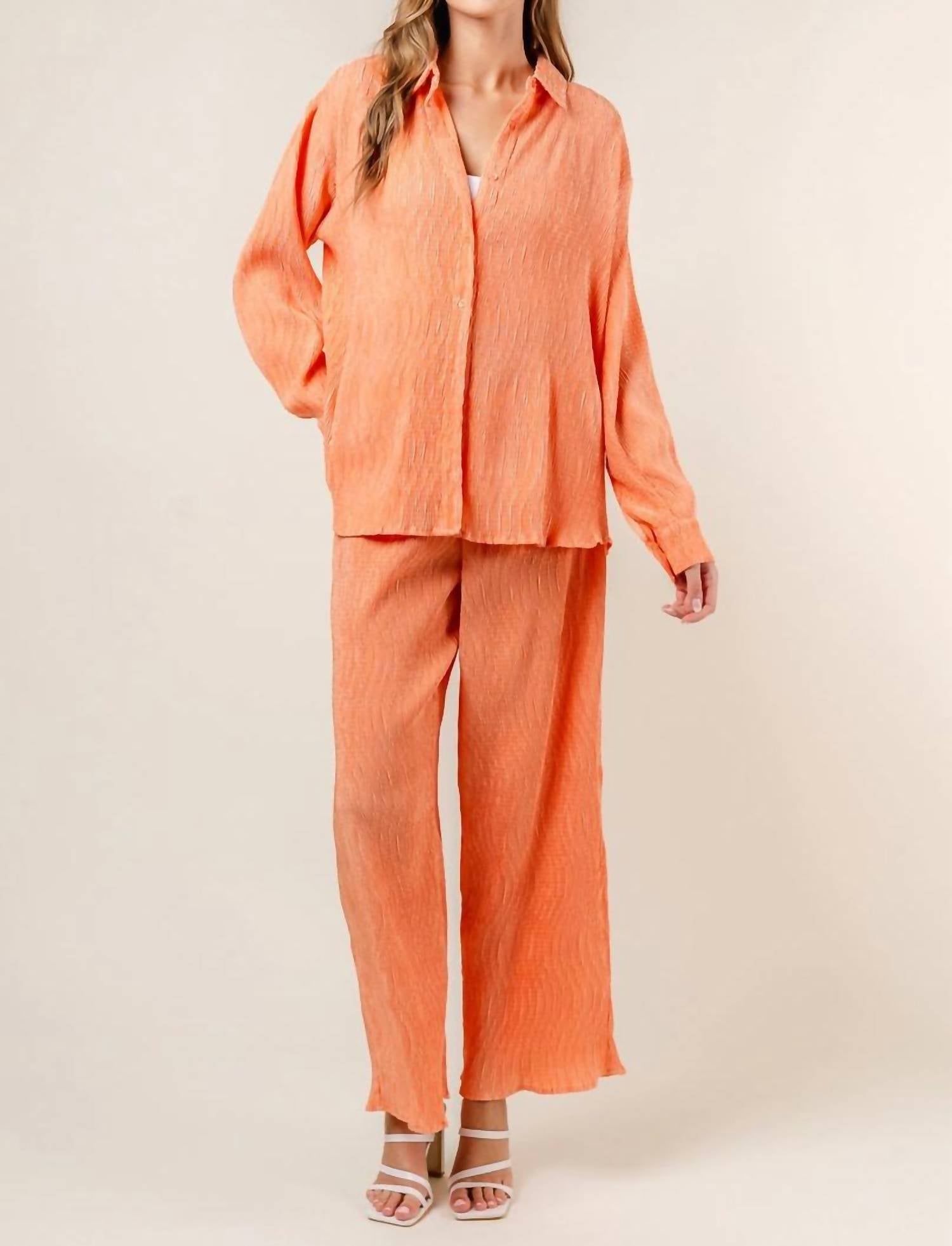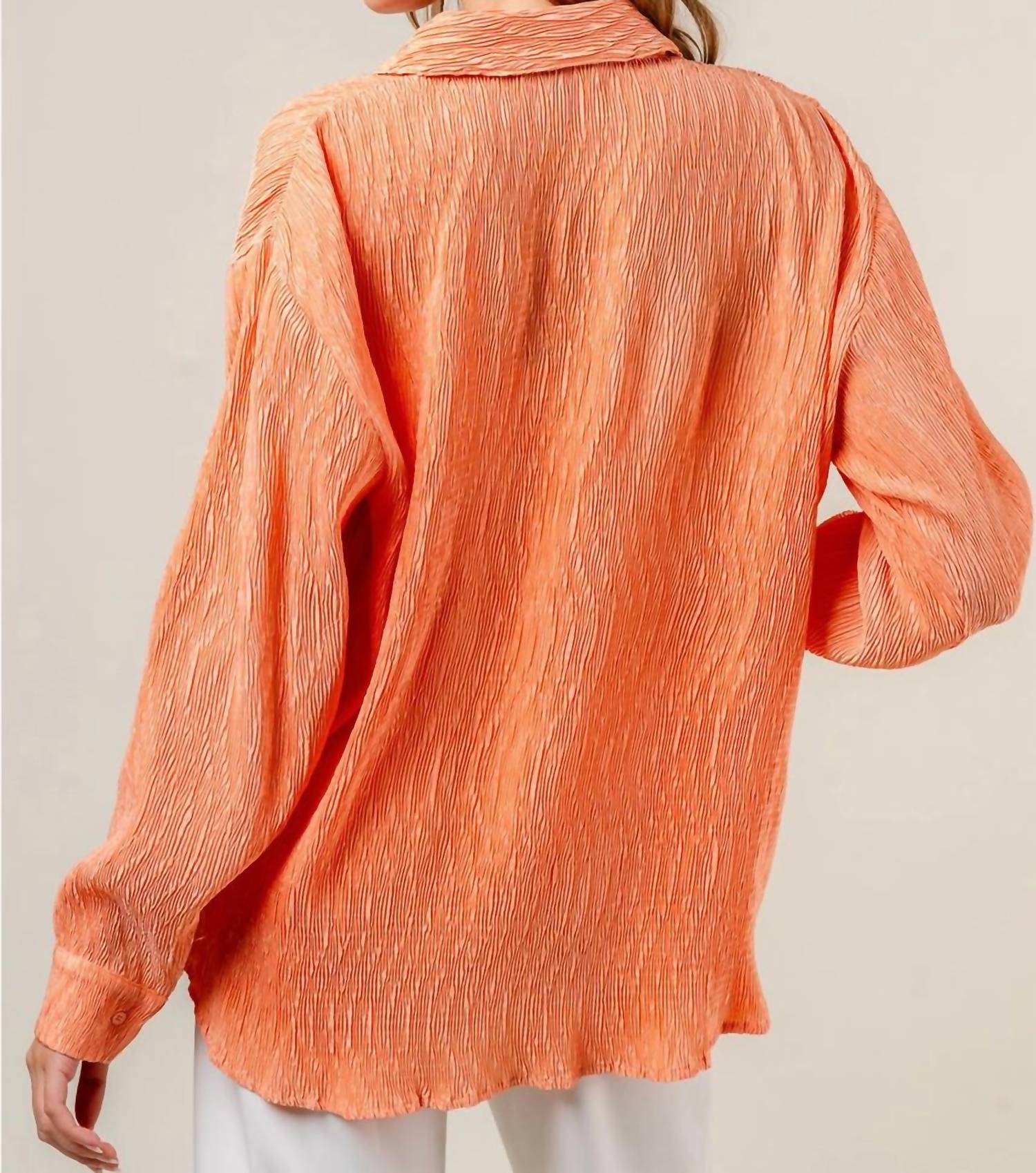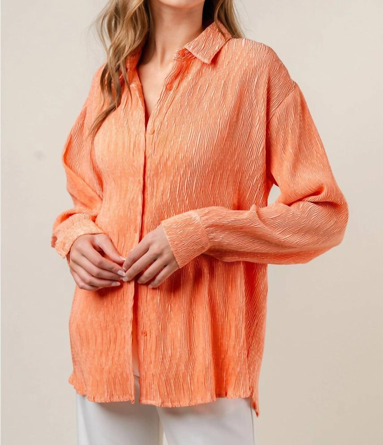 This button down shirt is comfortable yet polished. Introducing the Joey Top by Fore, a striking addition to your workwear wardrobe in vibrant orange. This women's long sleeve button-down shirt is crafted from 100% polyester and designed with a textured pattern for an engaging look. The shirt features a classic collar neckline and is made in China, ensuring quality and style. Closure is simple with button fastening, and it requires hand washing for care. Perfect for your summer holiday party occasions.