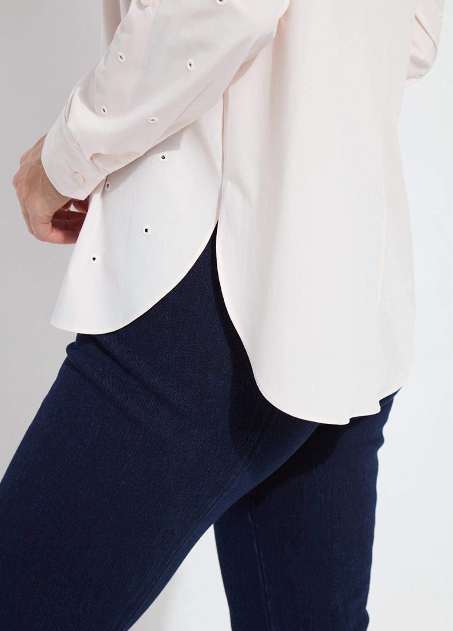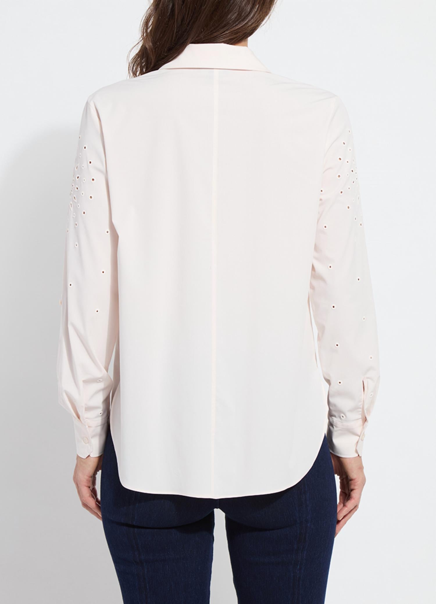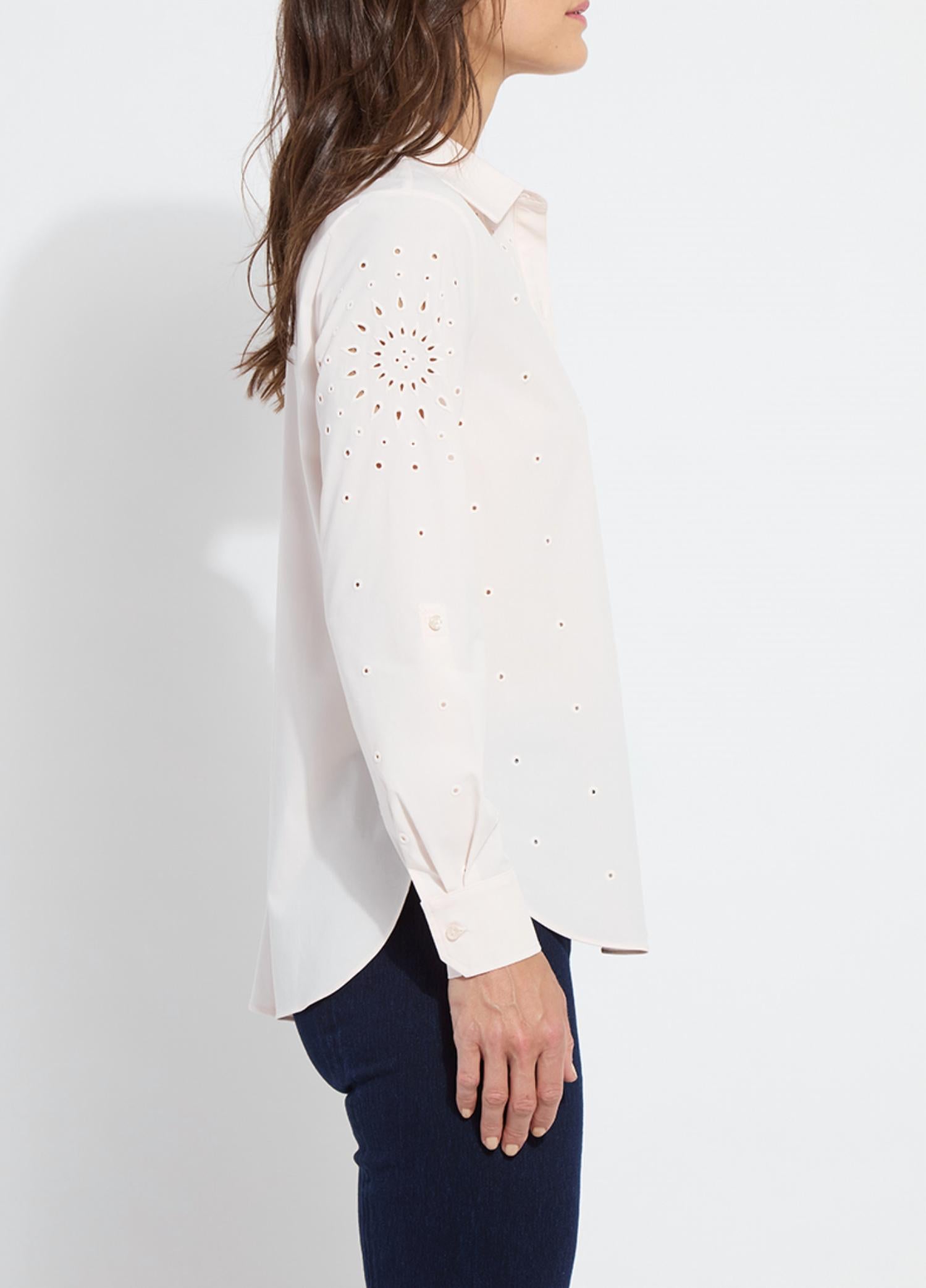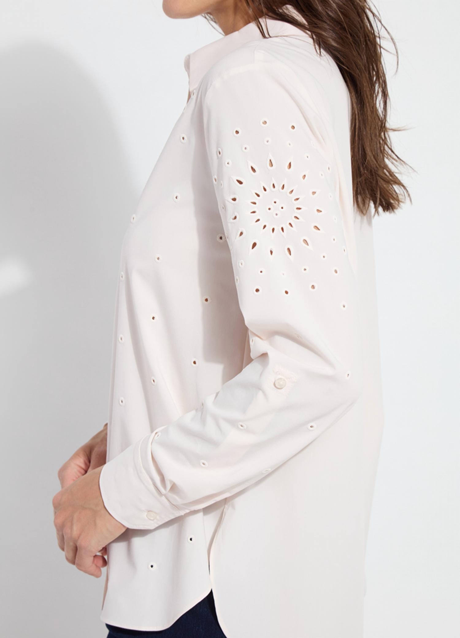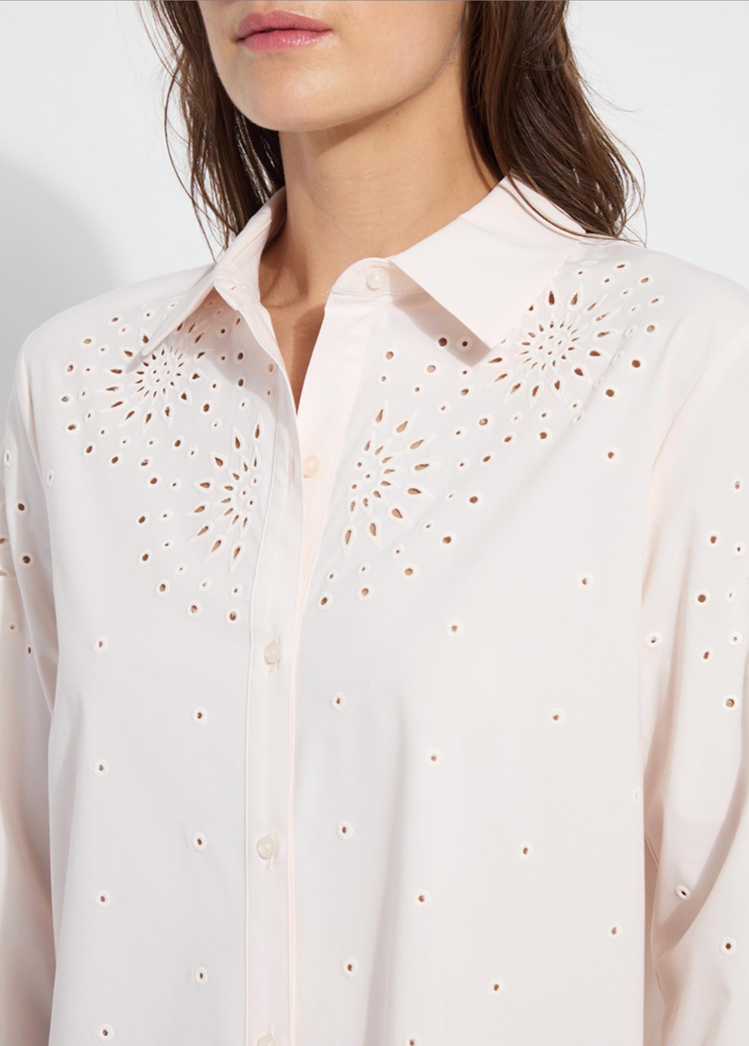 Perfectly tailored and soft to the touch. Discover the sophistication of the Zelie Eyelet Embroidered Shirt by Lysse, a stylish choice in Seed Pearl for dinner parties and workwear. Featuring long roll-tab sleeves and a classic collar, this top boasts a chic eyelet design and a high/low hemline for added flair. Made from a luxurious blend of 50% viscose (from bamboo), 46% polyester, and 4% elastane, it ensures both comfort and style. Closure: Front button closure. Care: Machine wash. Designed with a relaxed fit, this shirt hits perfectly at the hip.