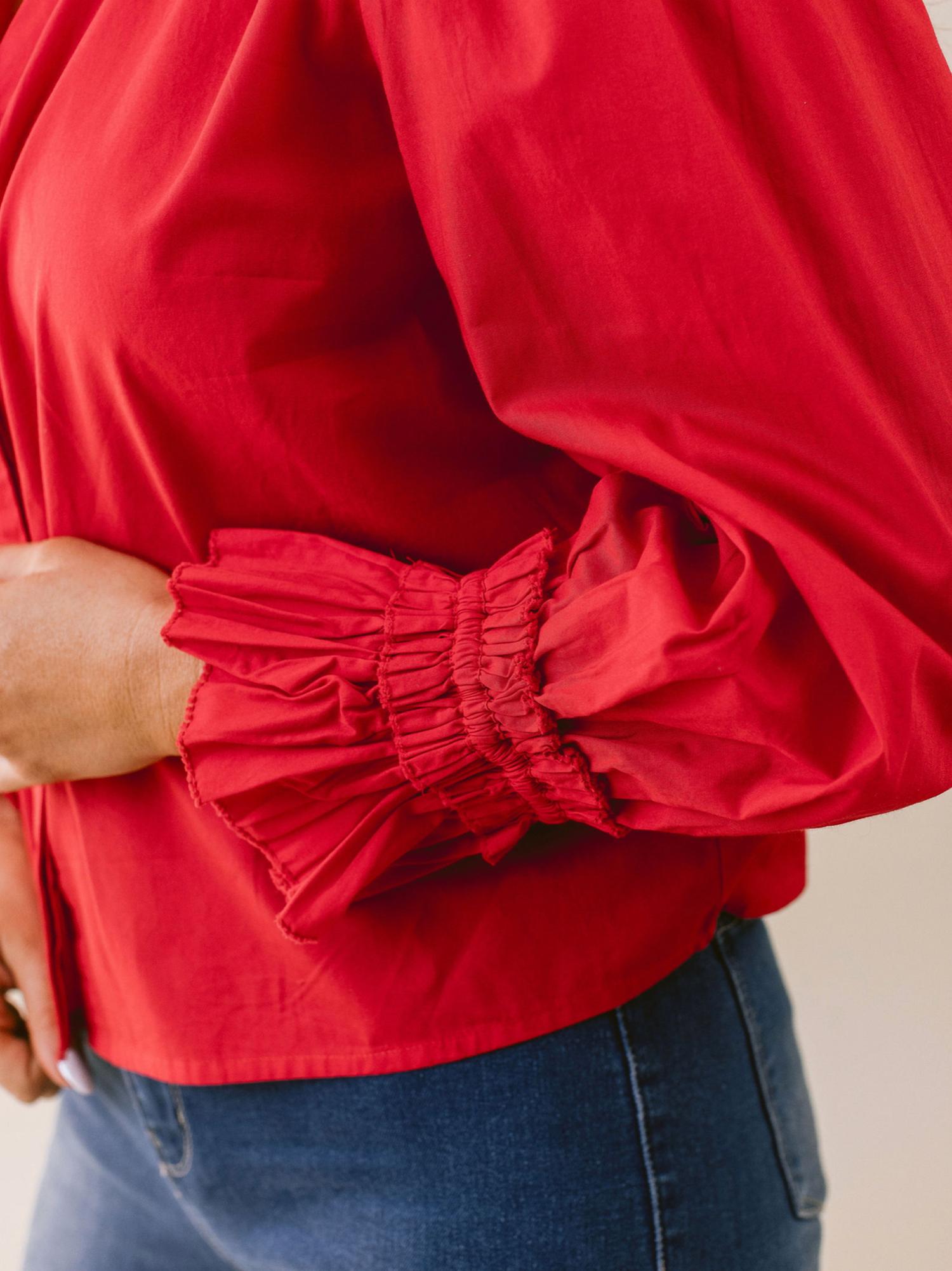 Long sleeves and cotton poplin material. Originating from India, this women's button-down shirt features a ruffled collar that adds a playful touch to its sophisticated design. The model, 5'7" tall and wearing size Small, showcases the flattering fit of this lipstick-colored top. Complete with cuff detailing and a button closure, it requires dry clean only care to maintain its pristine condition.