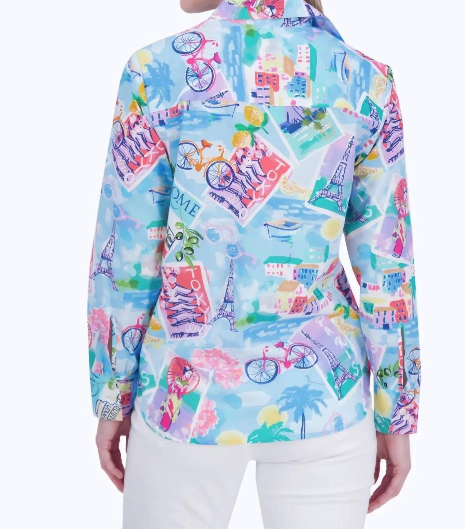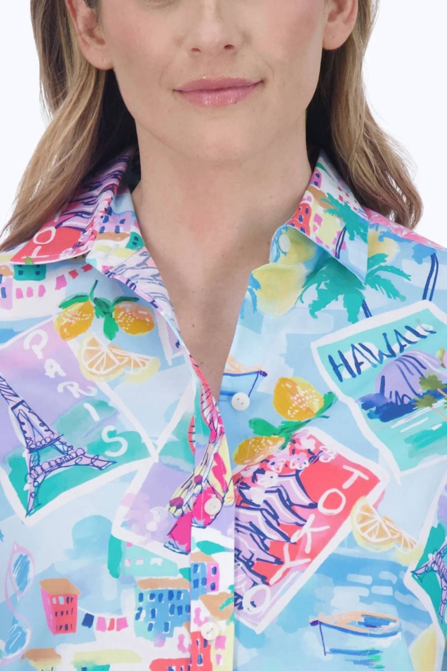 A classic button down shirt that will never go out of style. Embrace the allure of Spring with the Meghan Long Sleeve Shirt by Foxcroft, highlighting a charming Travel Conversational print. Crafted from 100% cotton, this patterned shirt features a traditional fit and a point collar, complemented by shell buttons and a button cuff. The shirttail hem adds a polished finish, while the 27” center back length provides a sophisticated drape. Designed for effortless care, this no-iron garment can be machine washed and tumble dried, making it perfect for your travel wardrobe.