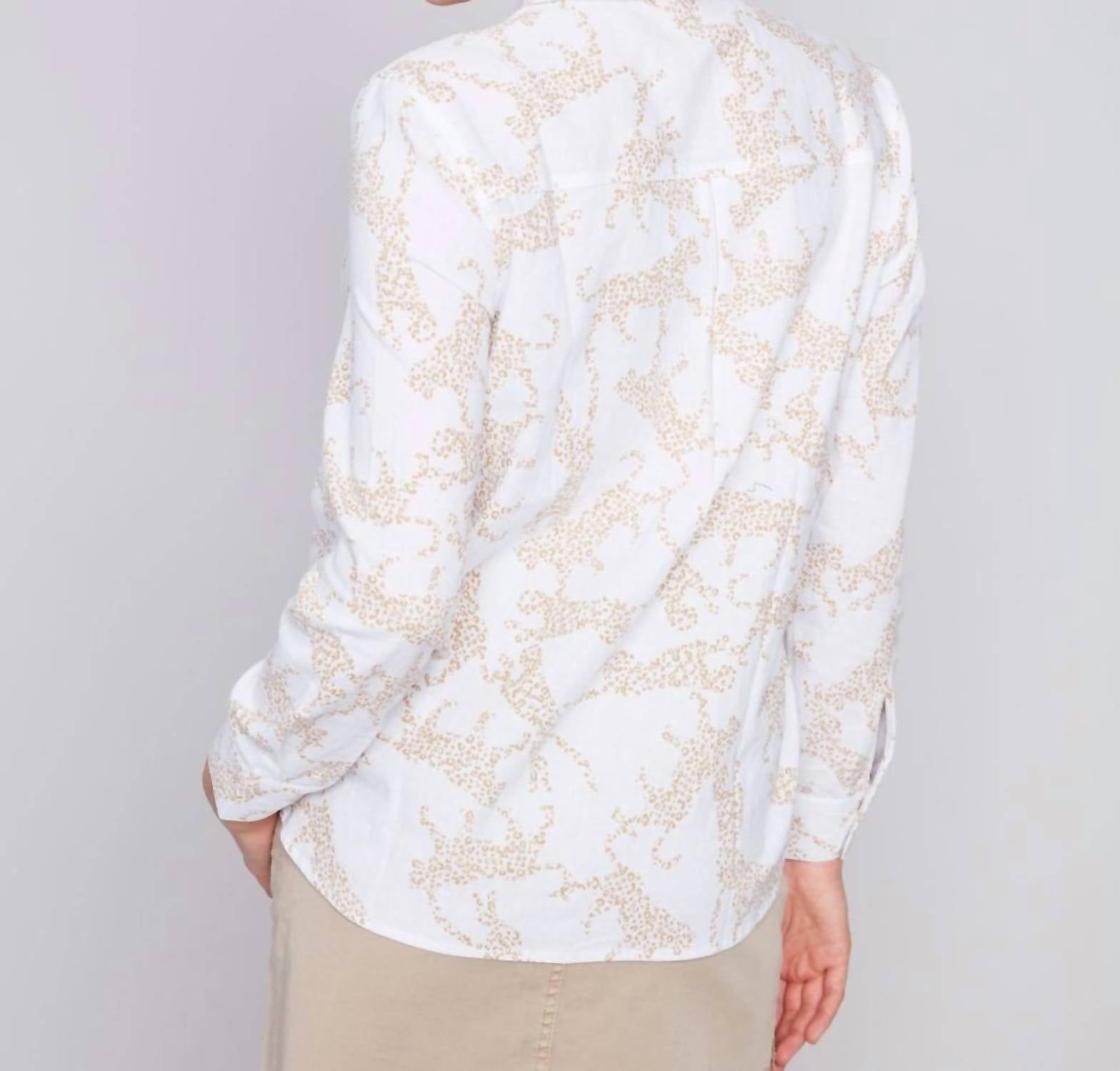 Perfectly tailored and soft to the touch. Embrace your bold side with the Let Your Wild Side Free Top by CHARLIE B, featuring a playful animal print. This button-down shirt boasts long sleeves, a classic collar, and a convenient front pocket. Crafted from a linen blend of 55% Linen and 45% Rayon, it offers comfort and style. Care: Machine wash cold on delicate, do not bleach, hang to dry, low iron setting, may be dry cleaned. Suitable for any spring evening event, adding a touch of quiet luxury to your Thanksgiving wardrobe.