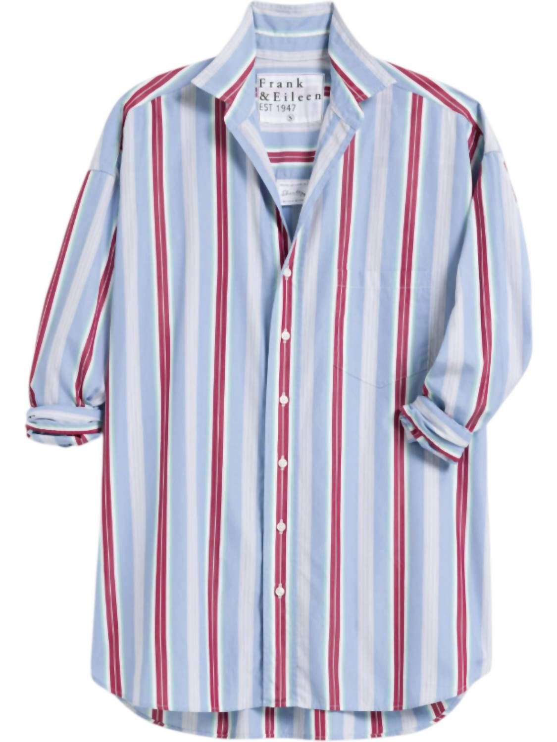 Perfectly tailored and soft to the touch. Eileen’s relaxed fit looks phenomenal on every figure and exudes effortless California cool, thanks to its generously cut silhouette and signature bust-flattering button placement. Designed with a shirttail hem long enough to cover your bum, a soft circular shape with rounded shoulders, no back pleat, a chest pocket, and long sleeves with button cuffs, Eileen is as functional as it is flattering. Whether you tuck it, tie it, or toss it over anything in your closet, this best seller is easy to wear and endlessly versatile. Simone is 5'8" with a 34" bust and wears a size S. To care for Eileen, turn the garment inside out and machine wash cold with like colors, then iron or press to maintain its crisp finish.