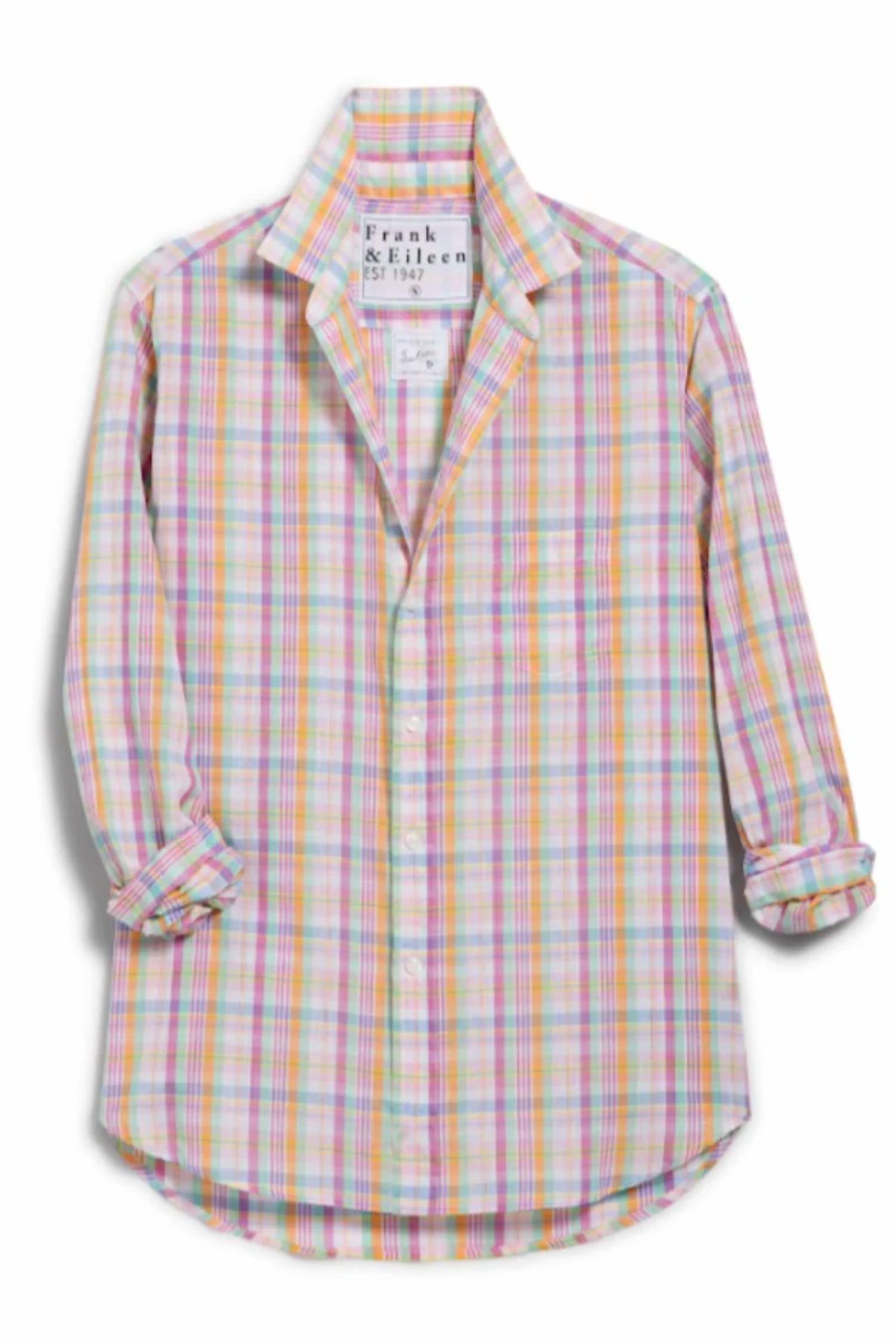 A classic button down shirt that will never go out of style. Discover the Eileen Relaxed Button-Up Shirt by Frank & Eileen, a stylish addition to your workwear wardrobe. This women's button-down features long sleeves with button cuffs and is crafted from 100% cotton. Designed in a vibrant green, orange, and pink plaid, it includes a chest pocket and is shaped with soft rounded shoulders. Made in Mexico from Italian woven cotton, care instructions suggest turning inside out for a cold machine wash and tumble drying on low.