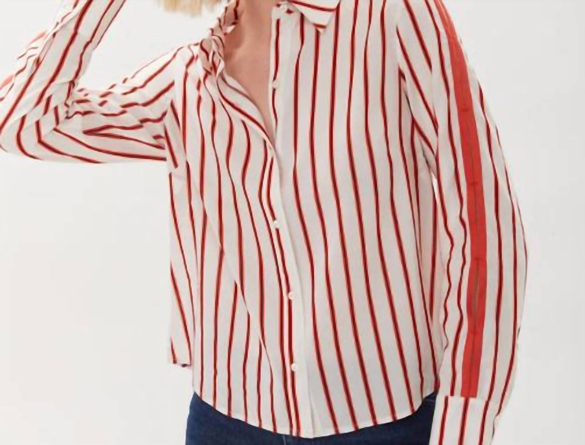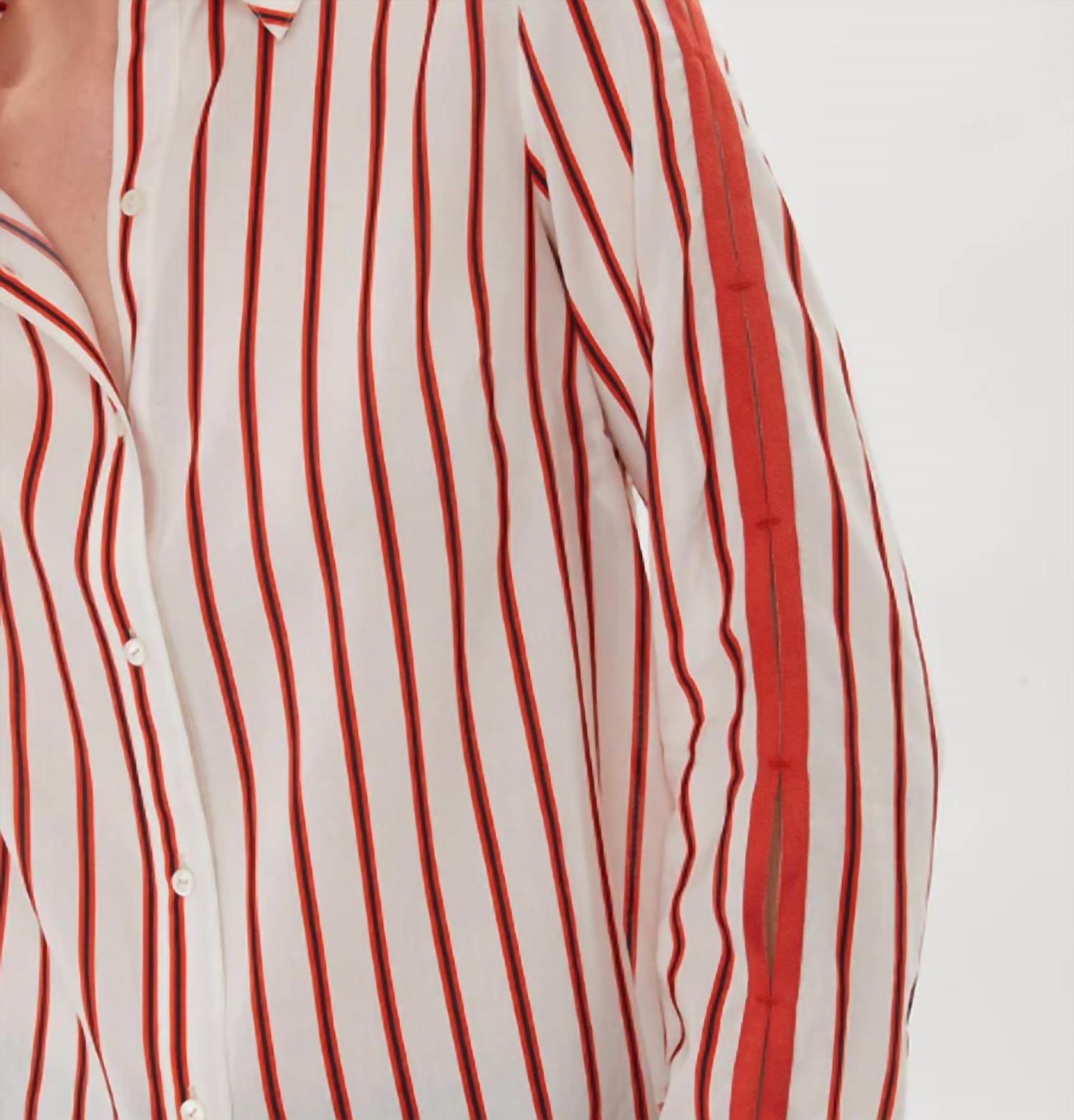 A classic button down shirt that will never go out of style. Introducing the Davis Shirt w/Twill by Ecru, a distinctive take on a classic button-down. This women's shirt boasts long sleeves with unique twill tape strips in poppy red, contrasted with a navy pinstripe pattern for a striking look. Crafted from cotton with a button closure, it's a chic choice for any wardrobe. For best results, dry clean only.