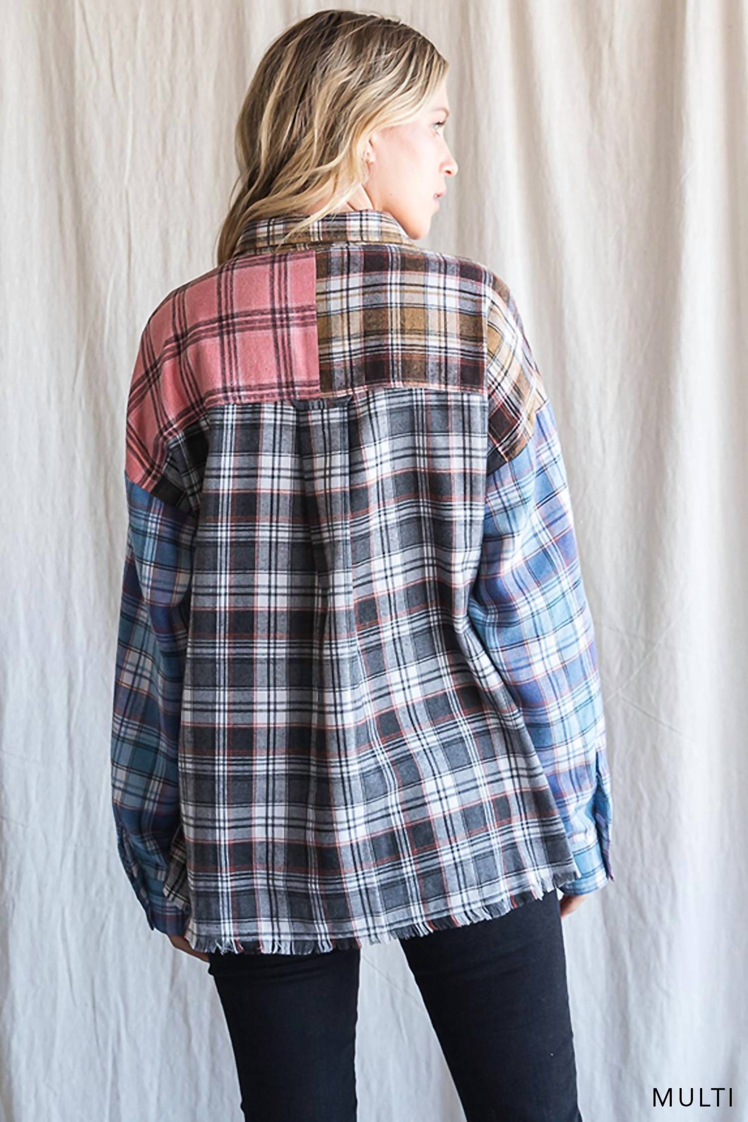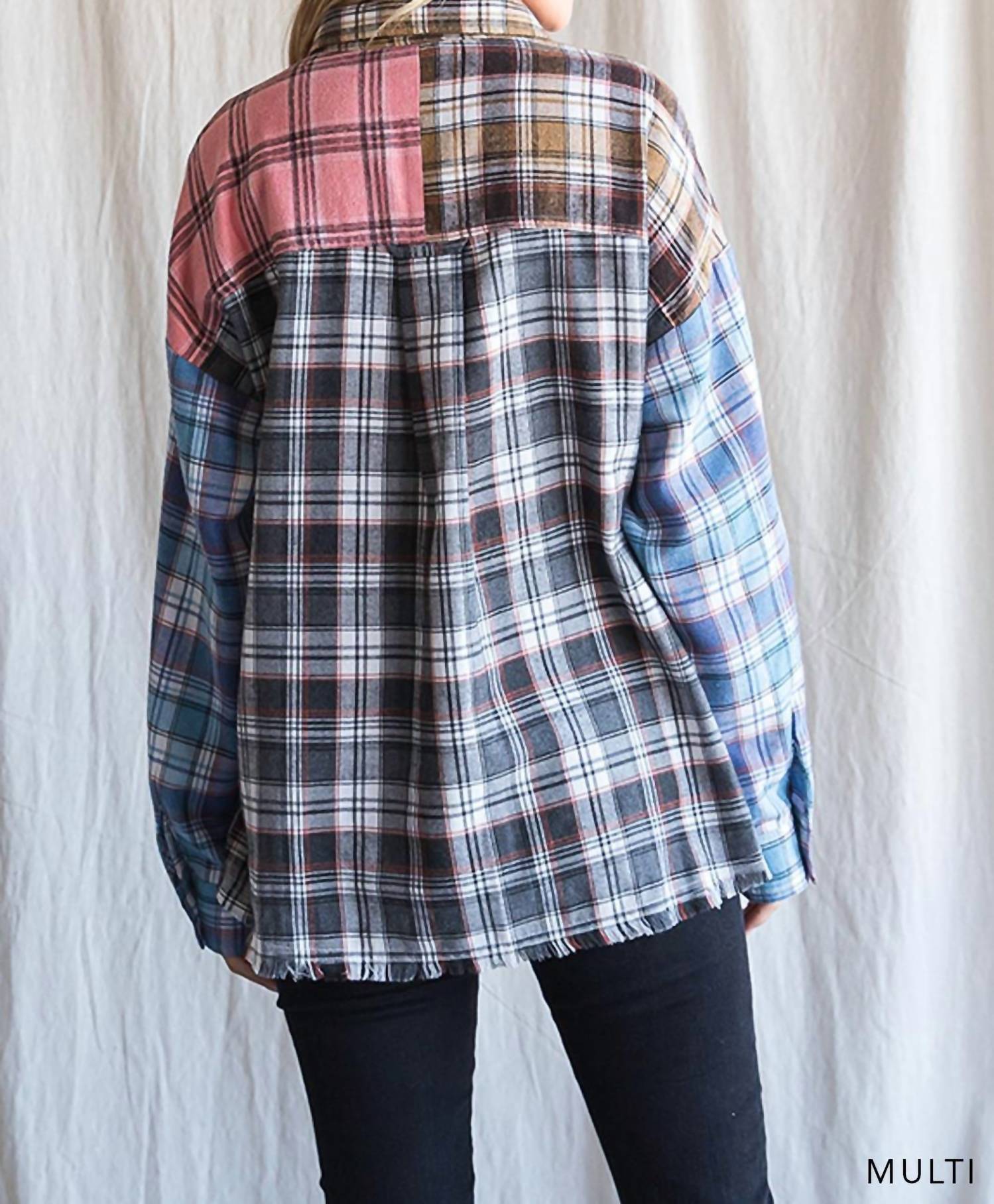 A classic button down shirt that will never go out of style. Introducing the Color Block Frayed Hem Top by Cotton Bleu, a chic addition to your wardrobe with its eye-catching multi-color plaid and check pattern. This women's button-down shirt features long sleeves and a stylish collar for a classic look. Composed of 70% cotton and 30% polyester, it ensures both comfort and durability. Care instructions: Machine wash only. Model is 5'7" with a 34" bust, 24" waist, and 34" hips.